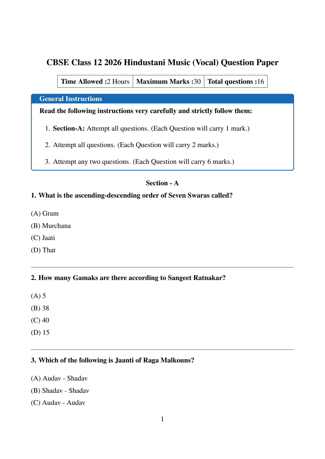 CBSE Class 12 2026 Hindustani Music (Vocal) Question Paper with Solution PDF