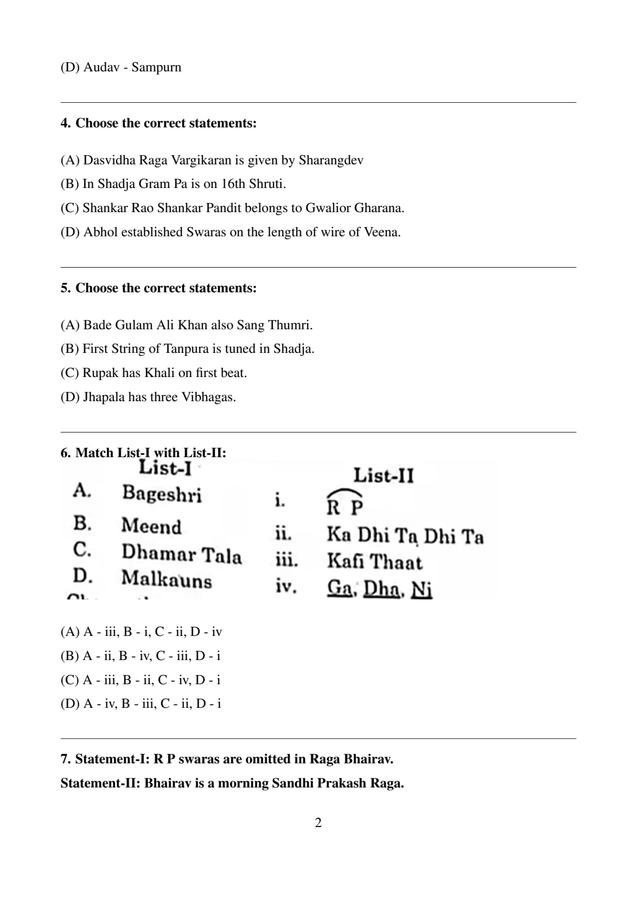 Final Answer: (A) Statement I and II both are true. Quick Tip: Understanding the time of day and the tonal qualities of a raga is essential in classical music. Ragas like Bhairav have a specific emotional expression when performed at the right time.