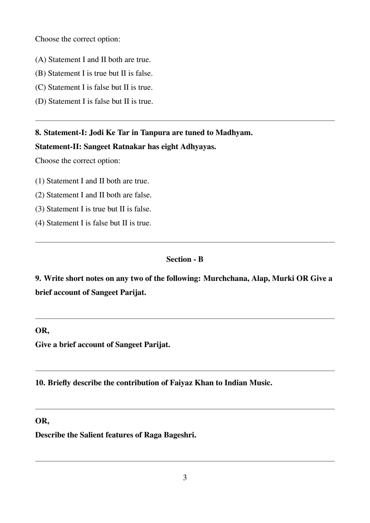 Final Answer: (3) Statement I is true but II is false. Quick Tip: In classical music, the Tanpura's string tuning plays an important role in supporting the raga's tonal foundation. Be sure to study the correct number of Adhyayas in Sangeet Ratnakar for accurate knowledge.