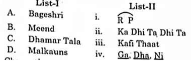 Final Answer: (C) A - iii, B - ii, C - iv, D - i. Quick Tip: Matching ragas with their corresponding thaats and rhythms is crucial in classical music for identifying the emotional and tonal structure of the performance.