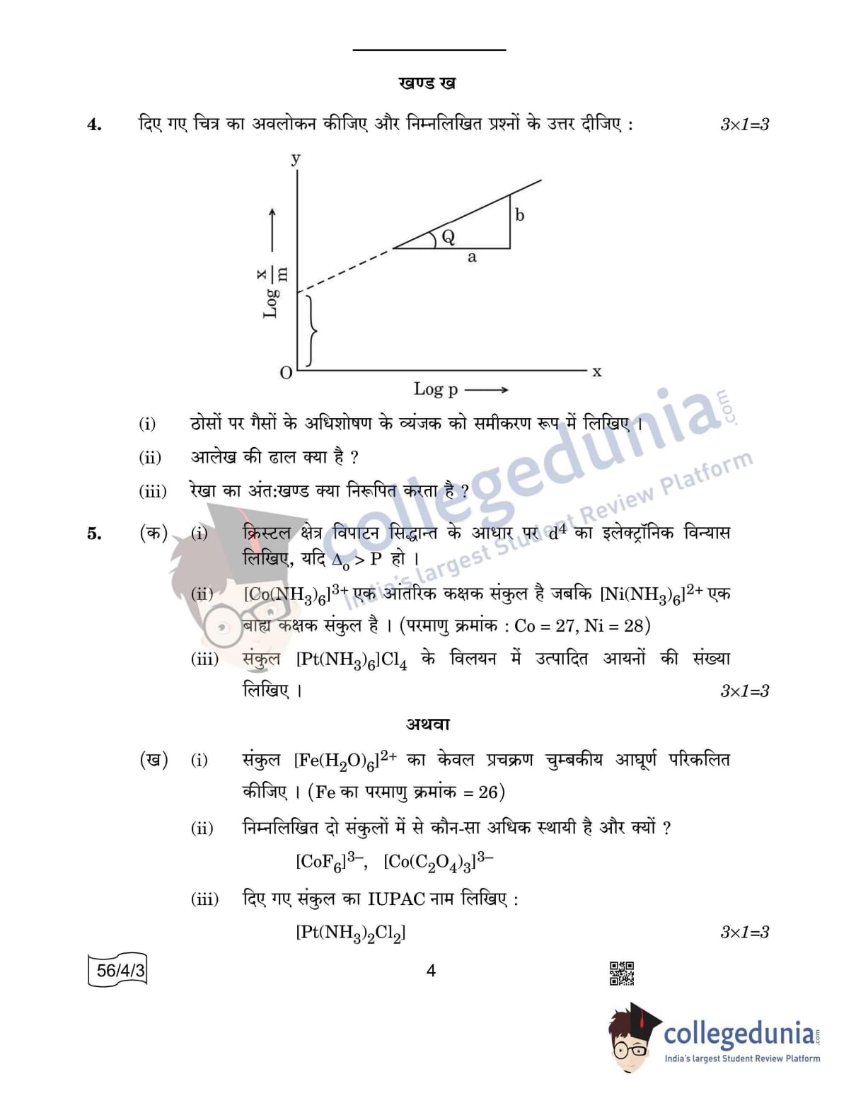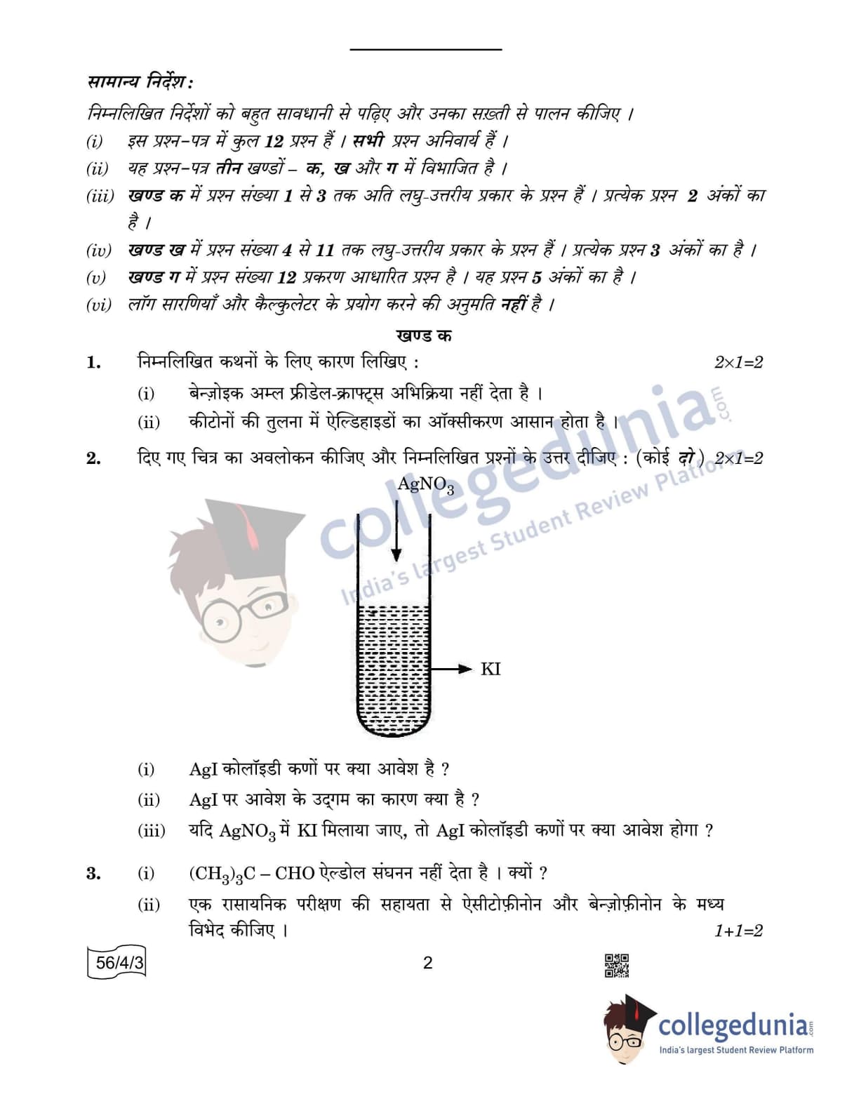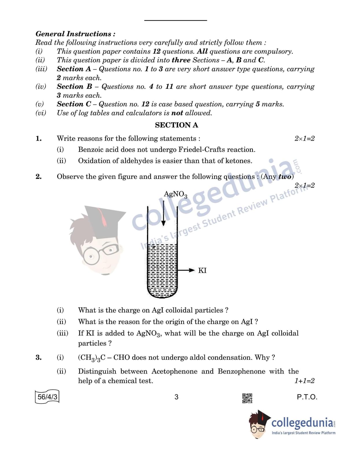 CBSE Class 12 2022 Chemistry Question Paper Set 3 - 56/4/3 with Answer Key pdf is available for download. The exam was conducted by Central Board of Secondary Education on May 7, 2022 in the Morning Session 10:30 AM to 12:30 PM. The medium of paper was English & Hindi. In terms of difficulty level, CBSE Class 12 Chemistry paper was of Moderate level. The question paper comprised a total of 12 questions divided among 3 sections.