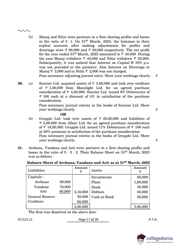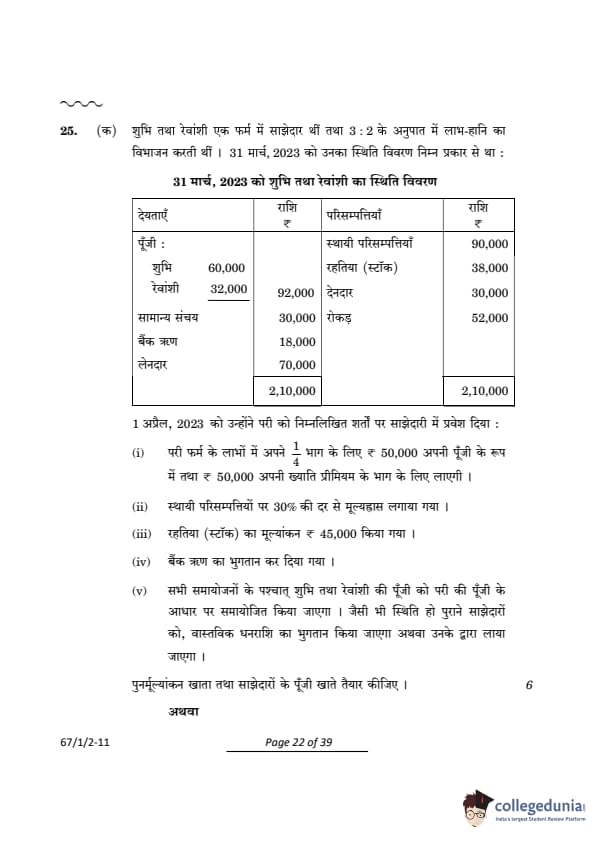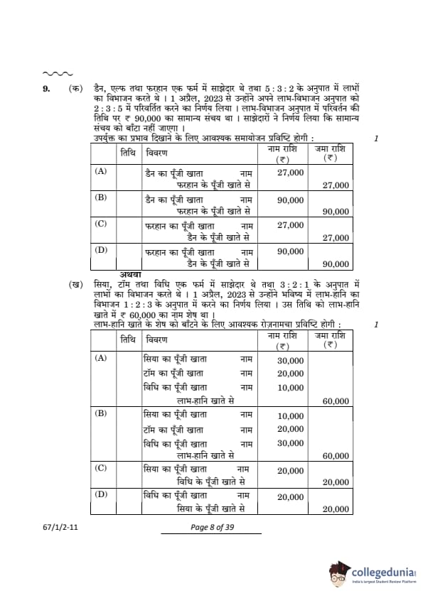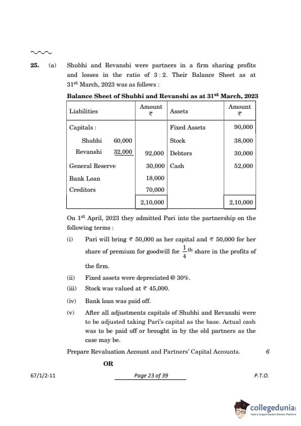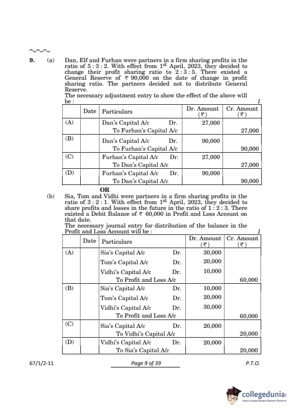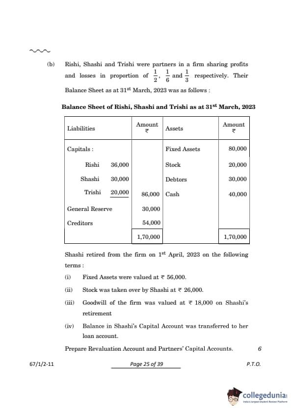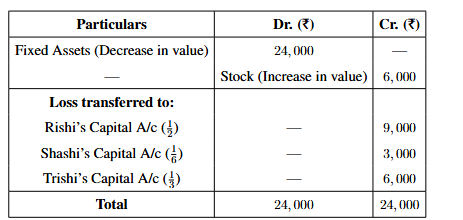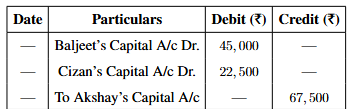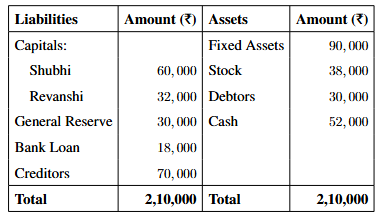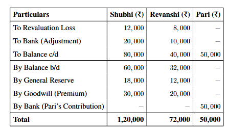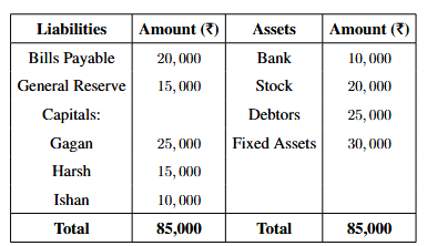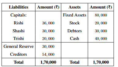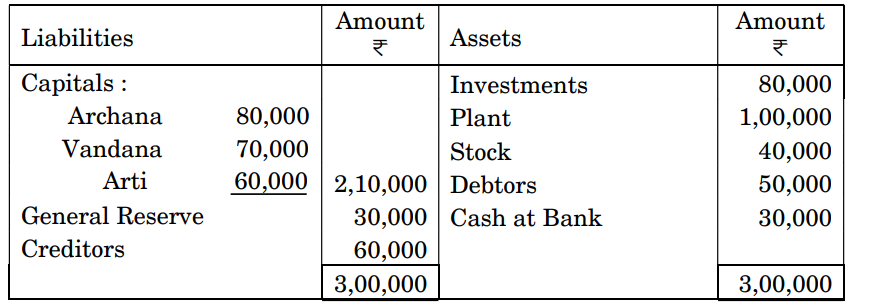 (b) Sia, Tom, and Vidhi were partners in a firm sharing profits in the ratio of 3 : 2 : 1. With effect from 1st April, 2023, they decided to share profits and losses in the future in the ratio of 1 : 2 : 3. There existed a Debit Balance of Rs.60,000 in the Profit and Loss Account on that date.