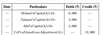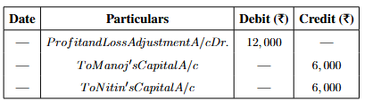 The journal entry reflects the adjustment of the debit balance against the partners’ capital accounts. Quick Tip: Debit balances in the Profit and Loss Account are adjusted among partners in their old profit-sharing ratio before changes to the ratio are applied.