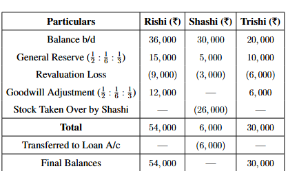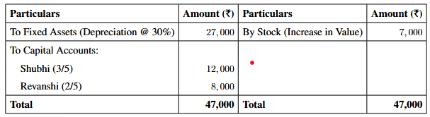 Adjustment amount = General Reserve × Change in Ratio = Rs.90,000 × \(\frac{3}{10}\) = Rs.27,000. Quick Tip: Changes in profit-sharing ratios require adjustments for reserves and profits among partners using the gaining and sacrificing ratios.