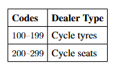 Block codes group categories into distinct ranges for easier organization. For example: \[ 100–199 \rightarrow Cycle tyres, \quad 200–299 \rightarrow Cycle seats. \]