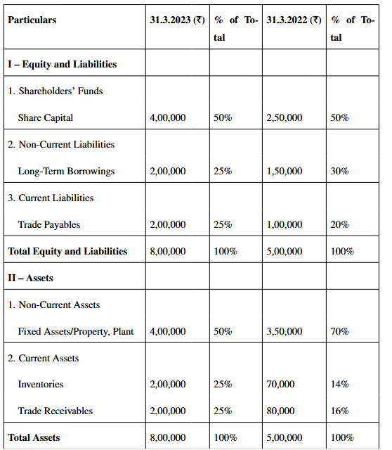 - Each item in the balance sheet is expressed as a percentage of the total assets or liabilities.