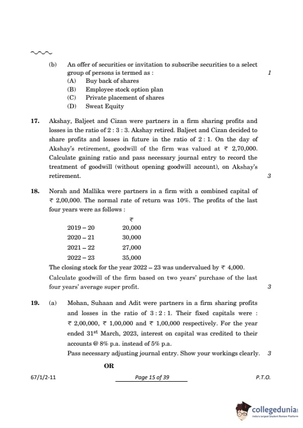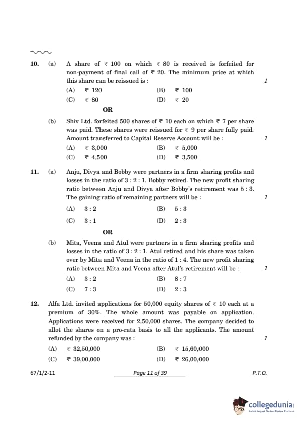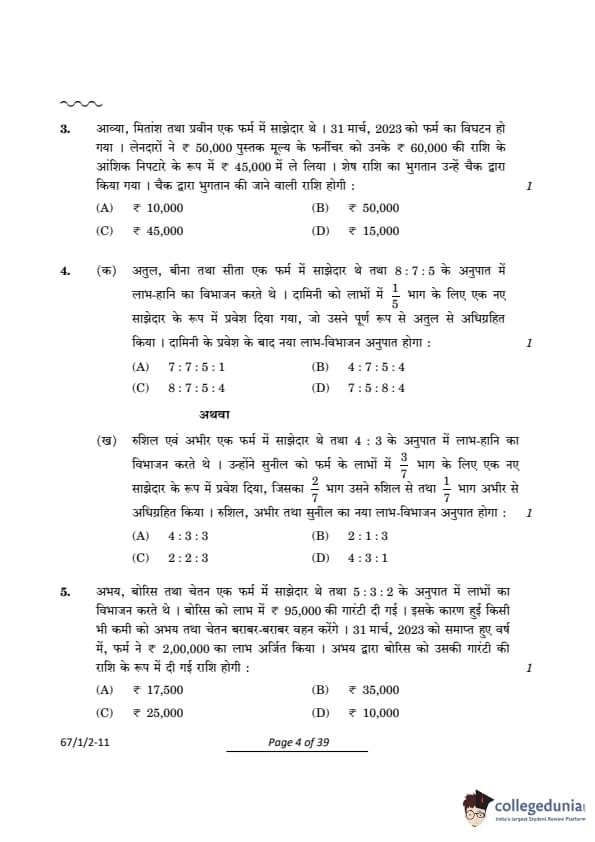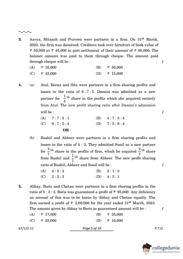 (a).Atul, Beena, and Sita were partners in a firm sharing profits and losses in the ratio of 8 : 7 : 5. Damini was admitted as a new partner for \(\frac{1}{5}\) share in the profits, which she acquired entirely from Atul. The new profit-sharing ratio after Damini’s admission will be: