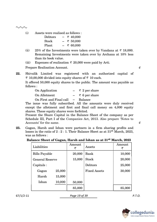 Step 3: Balance payable = Rs.60,000 - Rs.45,000 = Rs.15,000. Quick Tip: In dissolution, liabilities are settled by adjusting available assets first before paying the remaining balance.