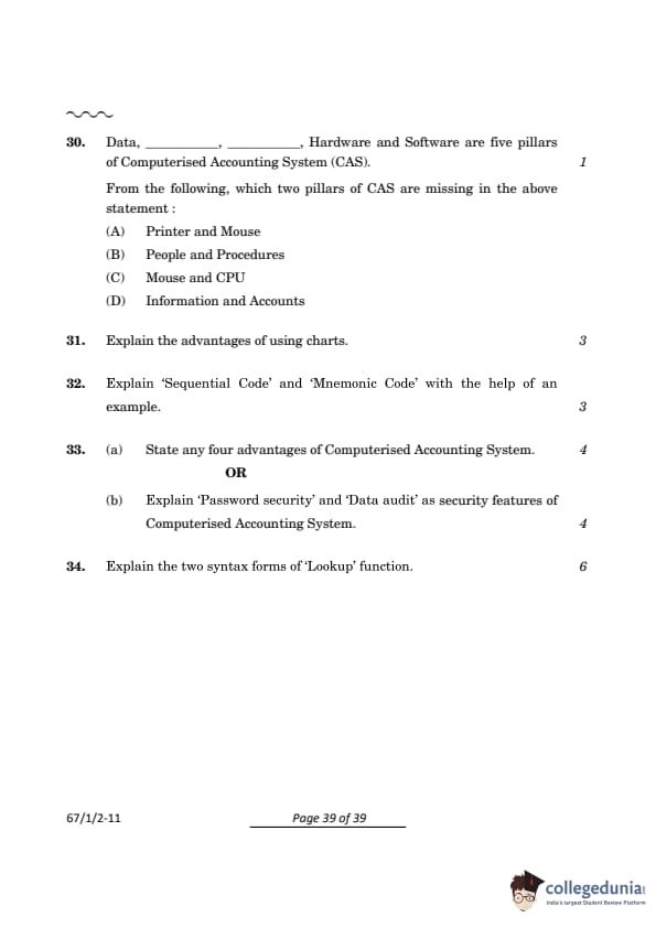 The missing pillars in the statement are People and Procedures, both of which are essential for the smooth functioning of CAS. Quick Tip: The five pillars of CAS—Data, People, Procedures, Hardware, and Software—together ensure seamless accounting operations and support informed decision-making.