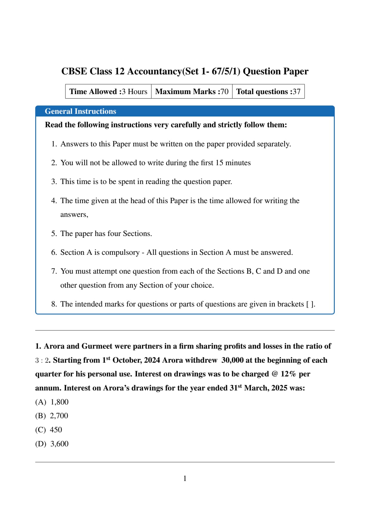 | CBSE Class 12 2026 Accountancy Question Paper Set 1 with Answer Key | Download PDF | Check Solution |