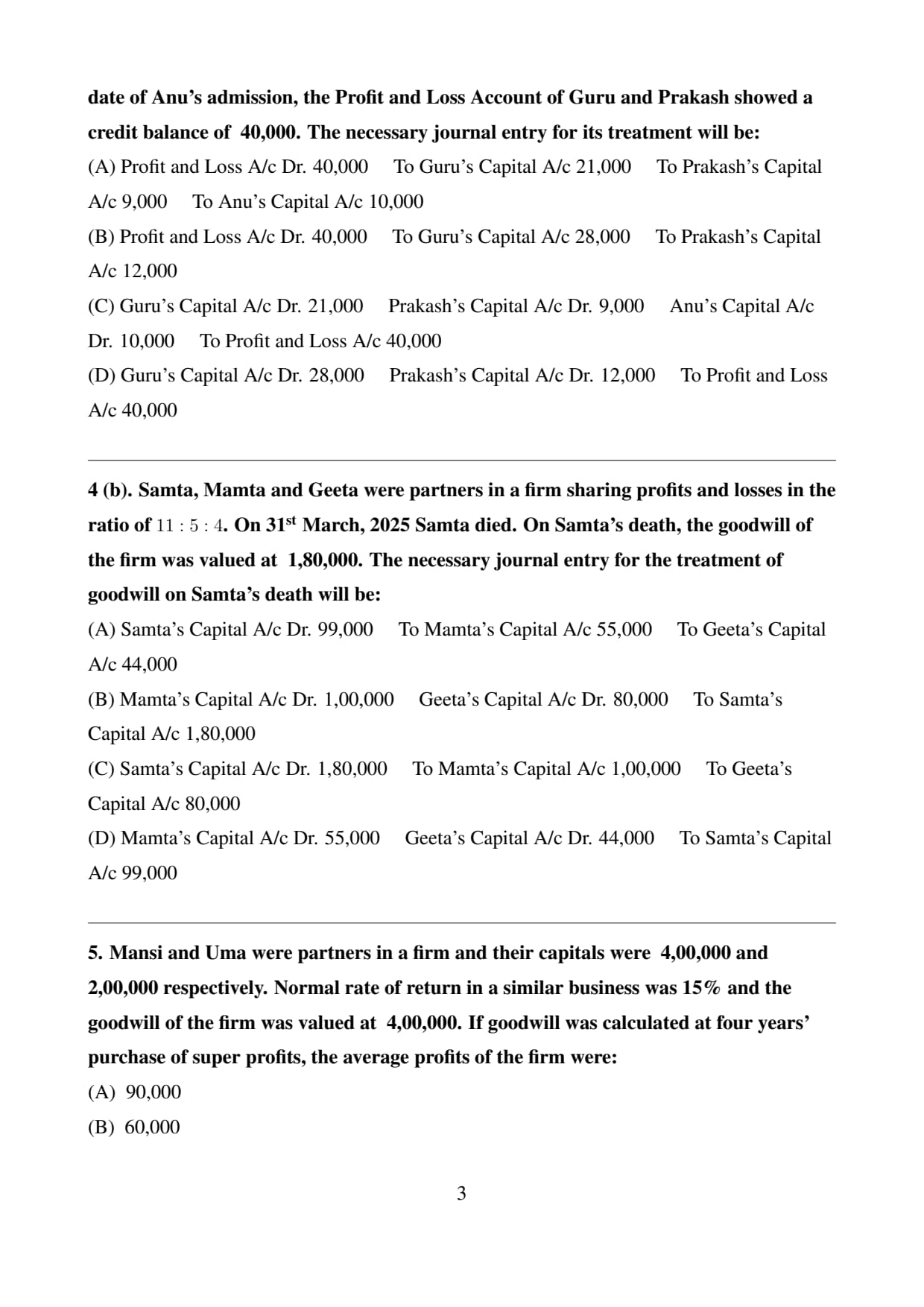 Final Answer: \[ \boxed{Option (B)} \] Quick Tip: Death of partner: Goodwill credited to deceased partner. Debited to gaining partners in gaining ratio.