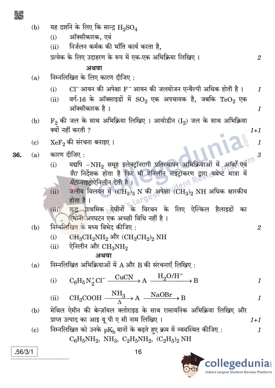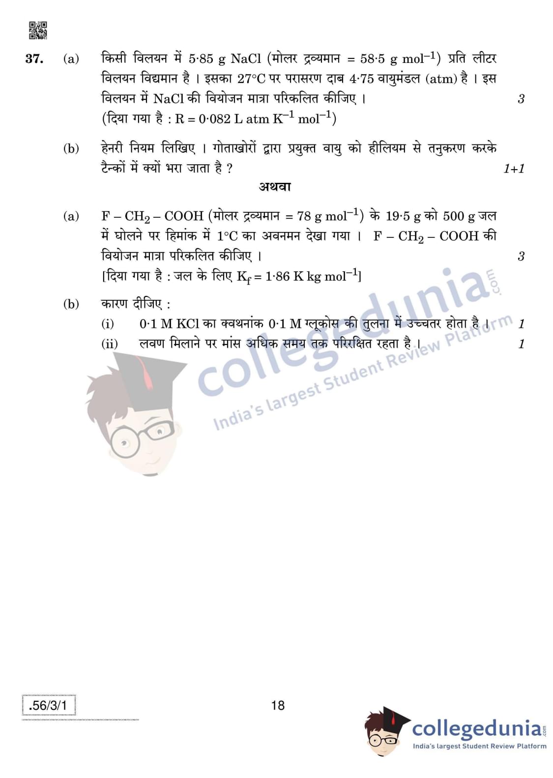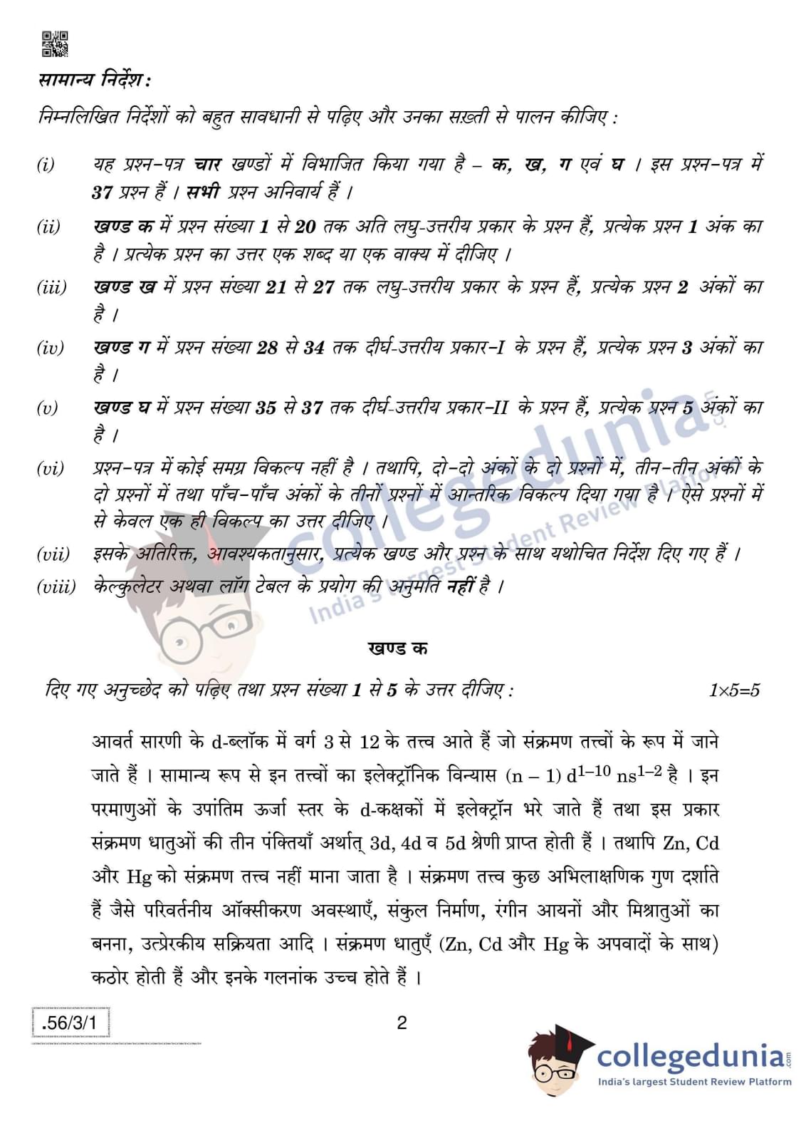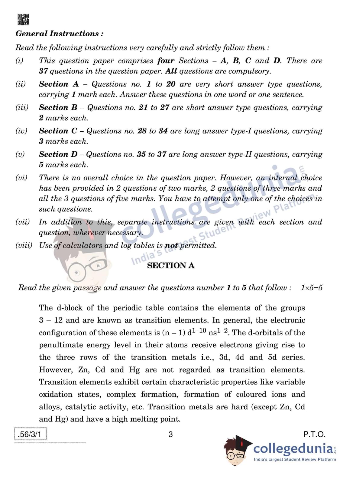 CBSE Class 12 Chemistry Question Paper 2020 with Answer Key Set 1- 56/3/1 is available for download. The exam was conducted by the Central Board of Secondary Education on March 7, 2020 in the Morning Session 10:30 AM to 1:30 PM. The medium of paper was English & Hindi. In terms of difficulty level, CBSE Class 12 Chemistry paper was of Moderate level. The question paper comprised a total of 37 questions divided among 4 sections.