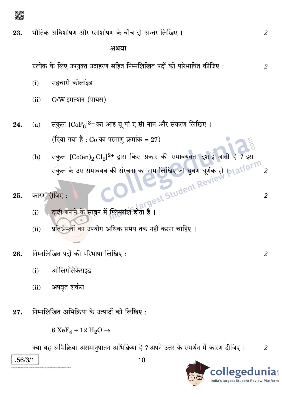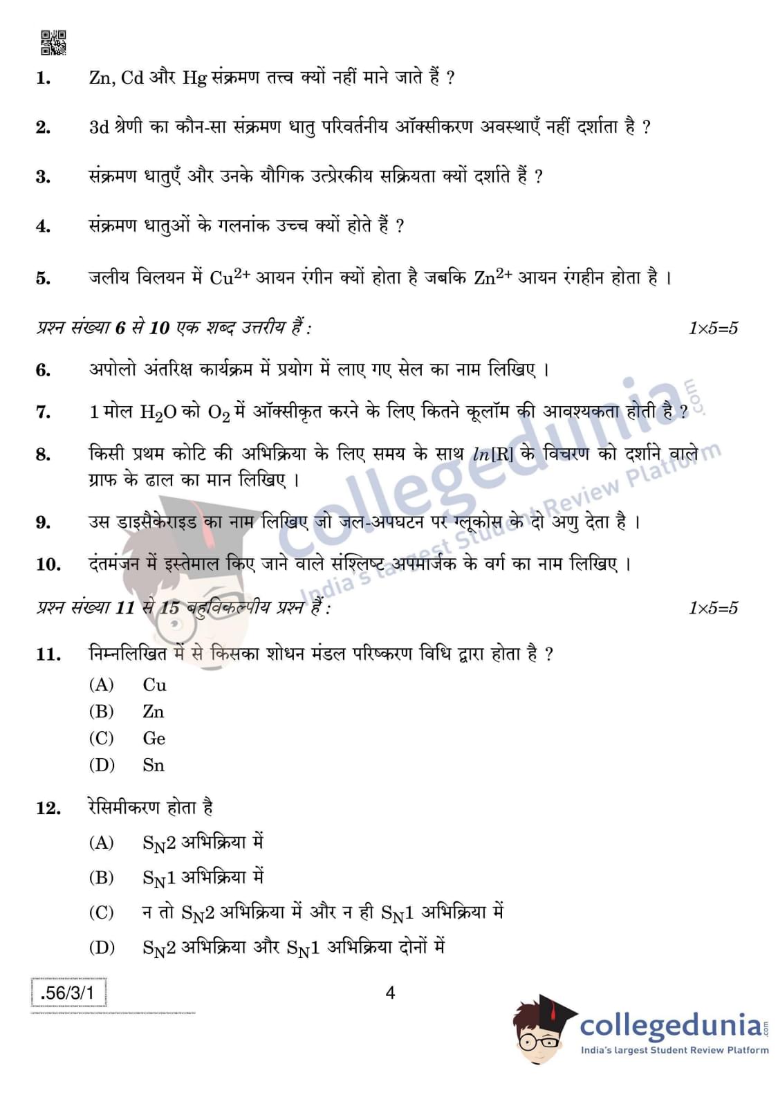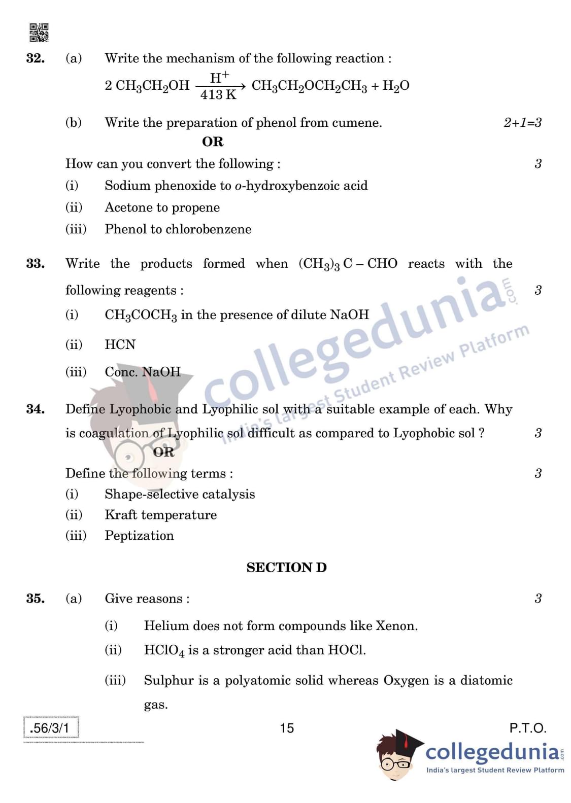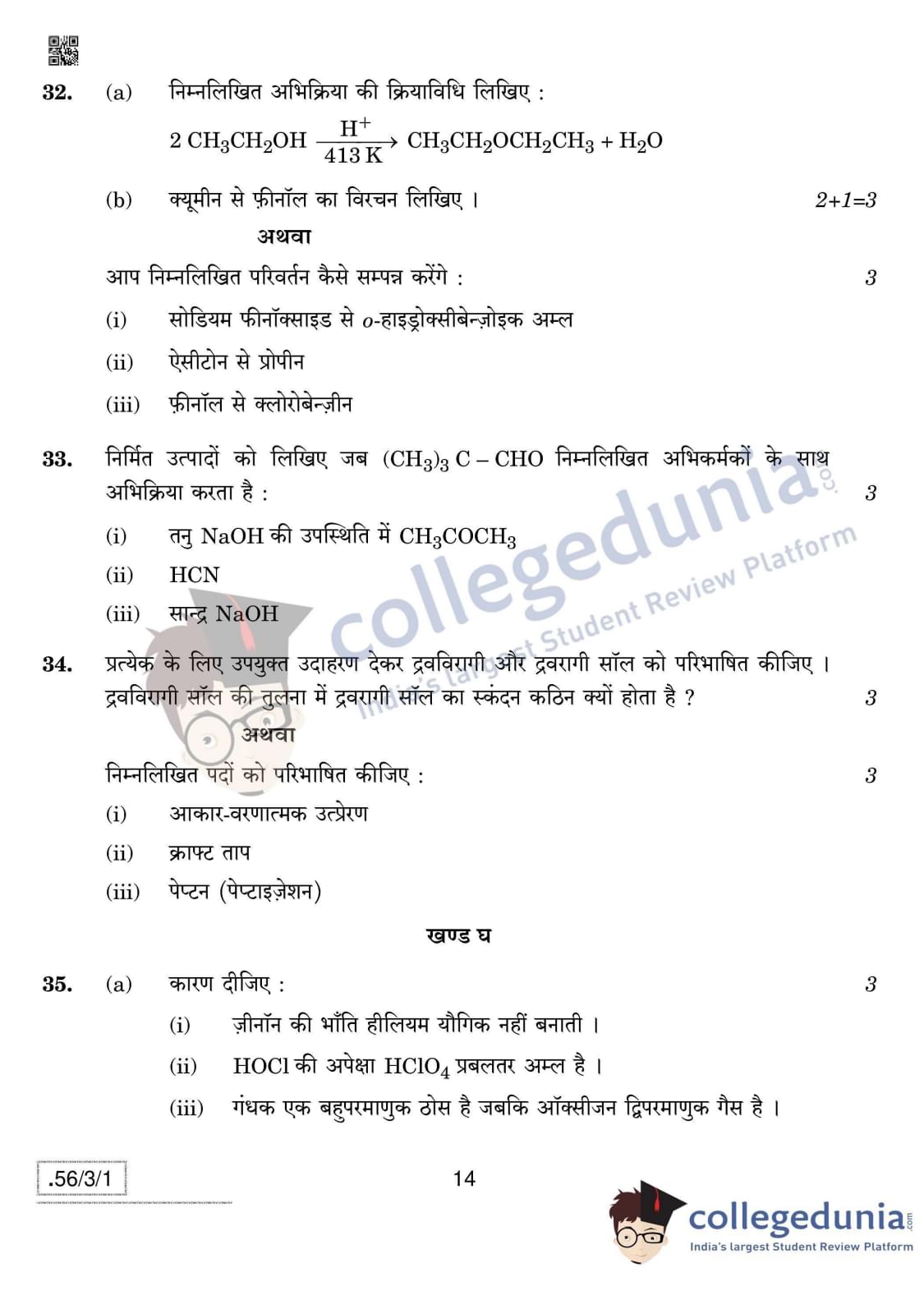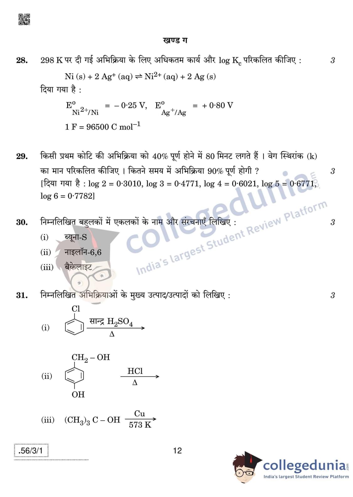 CBSE Class 12 Chemistry Question Paper 2020 with Answer Key Set 1- 56/3/1 is available for download. The exam was conducted by the Central Board of Secondary Education on March 7, 2020 in the Morning Session 10:30 AM to 1:30 PM. The medium of paper was English & Hindi. In terms of difficulty level, CBSE Class 12 Chemistry paper was of Moderate level. The question paper comprised a total of 37 questions divided among 4 sections.