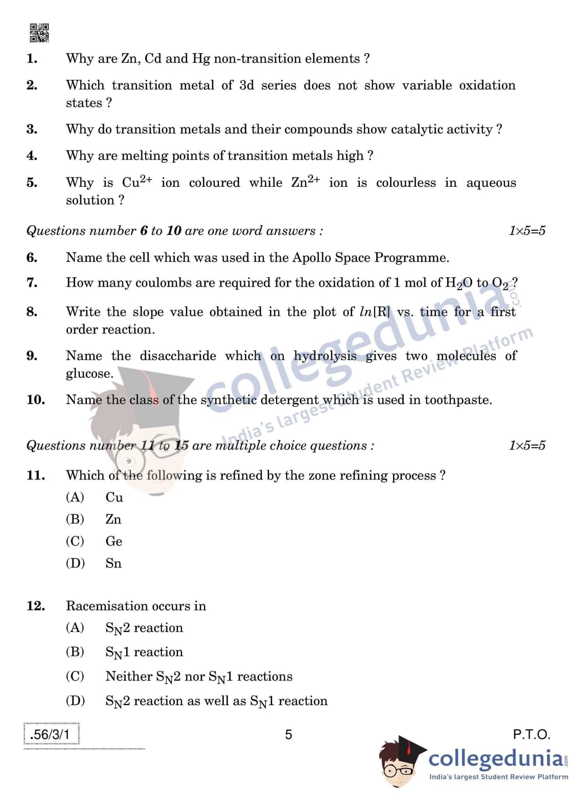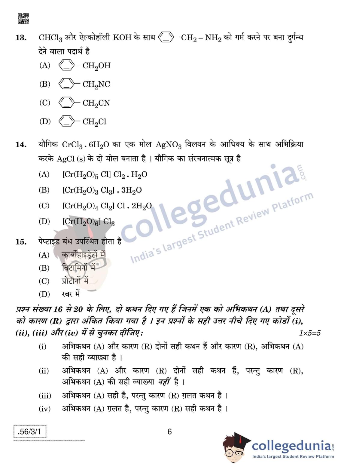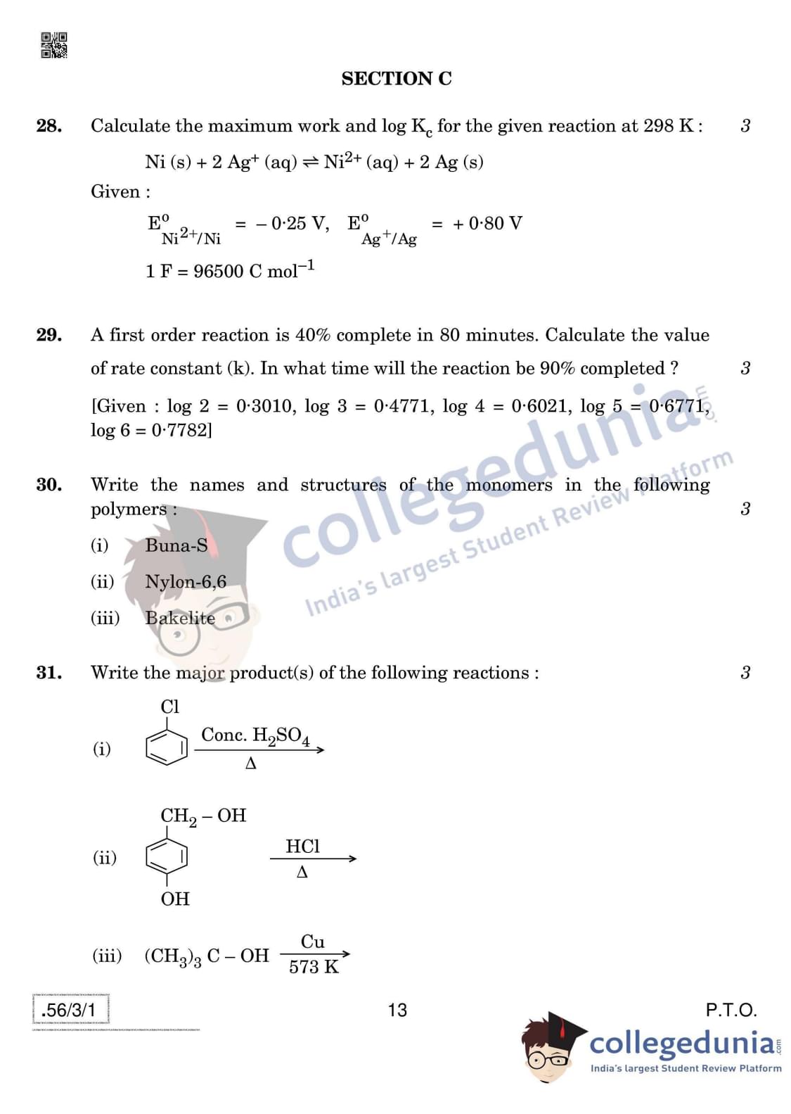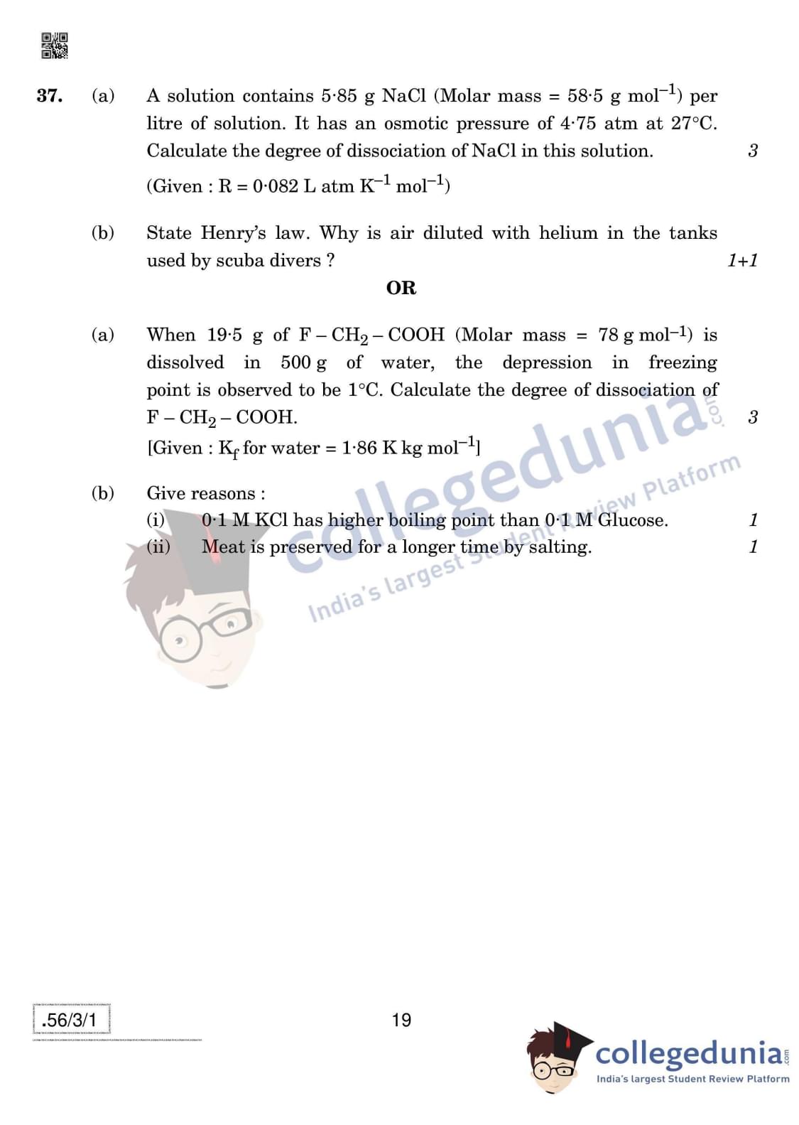 CBSE Class 12 Chemistry Question Paper 2020 with Answer Key Set 1- 56/3/1 is available for download. The exam was conducted by the Central Board of Secondary Education on March 7, 2020 in the Morning Session 10:30 AM to 1:30 PM. The medium of paper was English & Hindi. In terms of difficulty level, CBSE Class 12 Chemistry paper was of Moderate level. The question paper comprised a total of 37 questions divided among 4 sections.