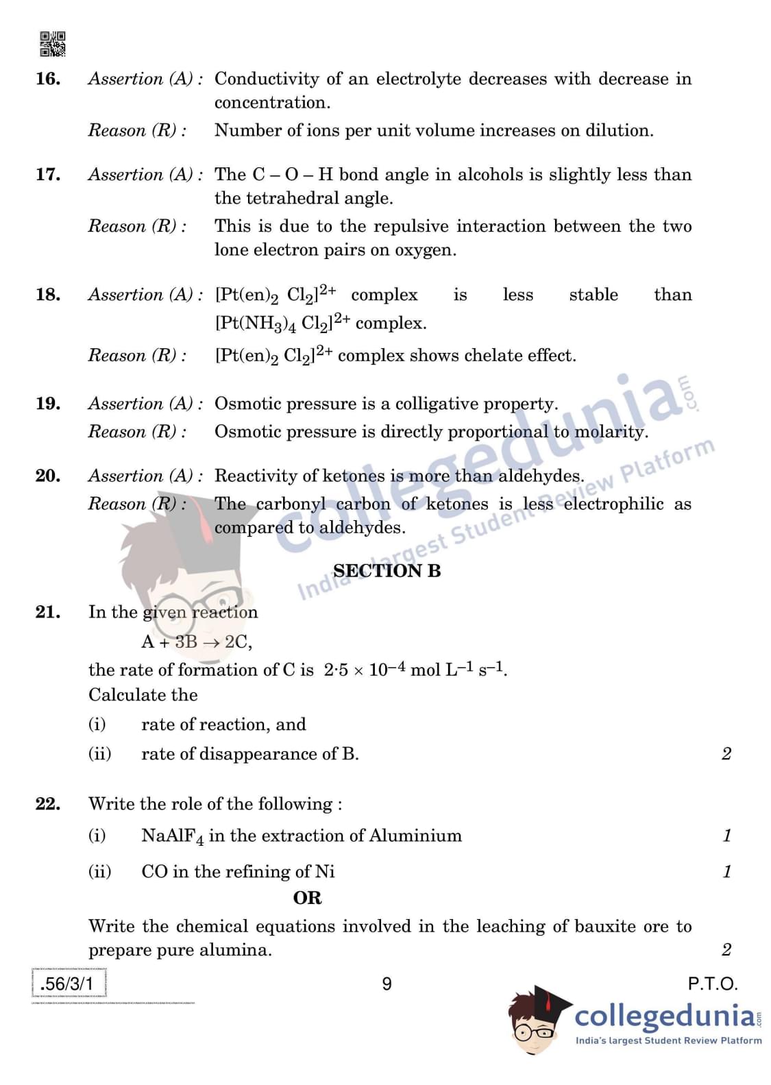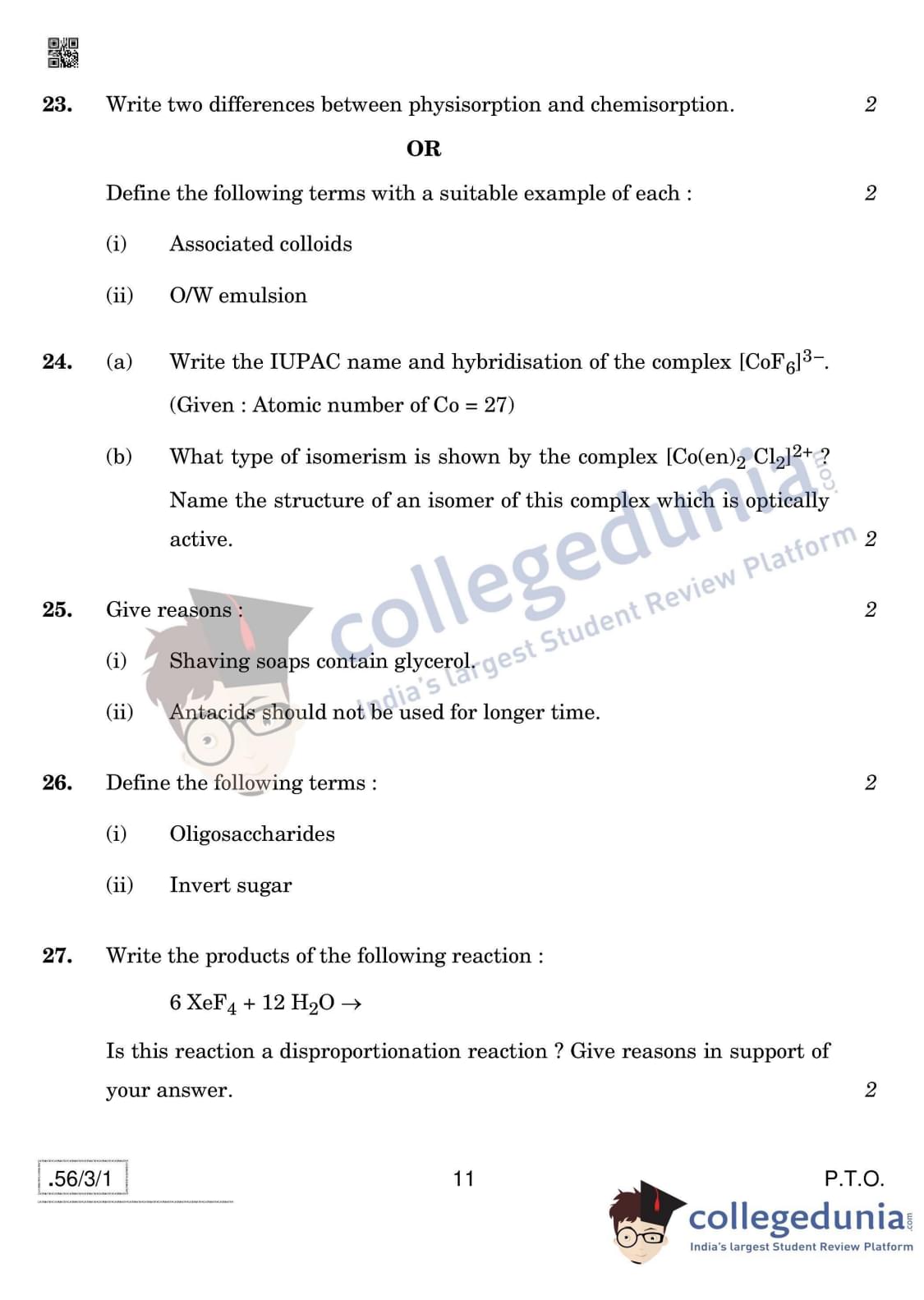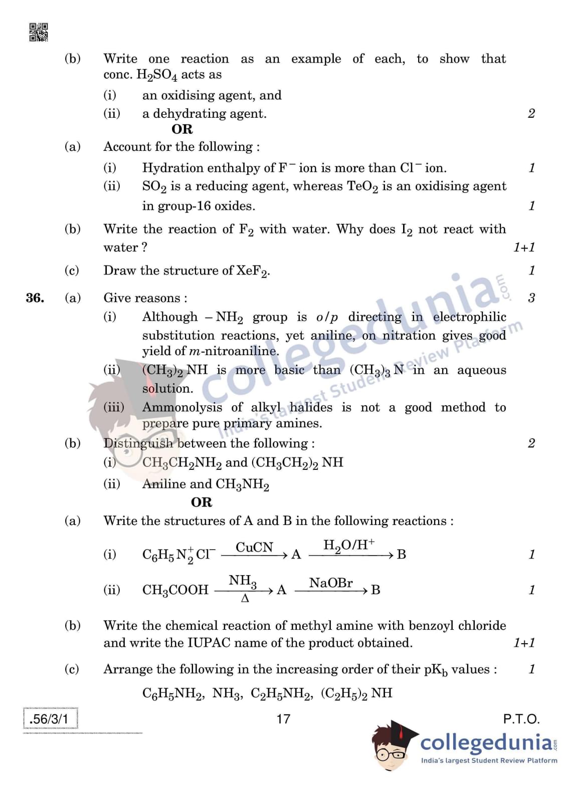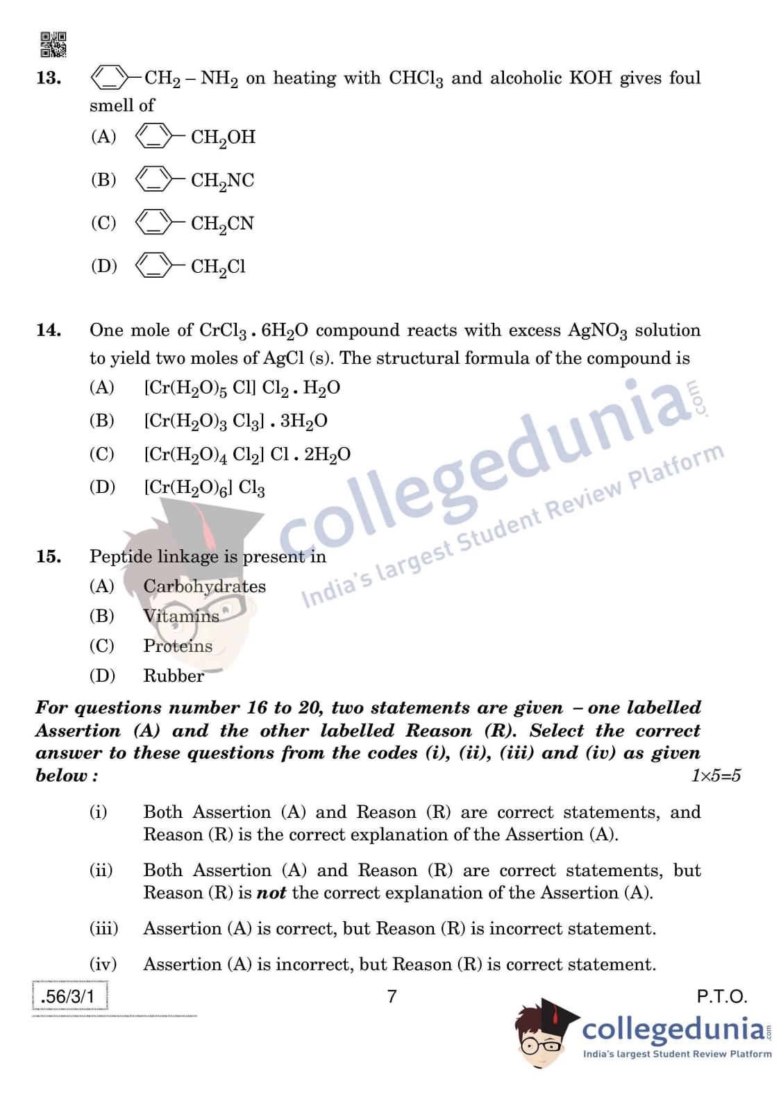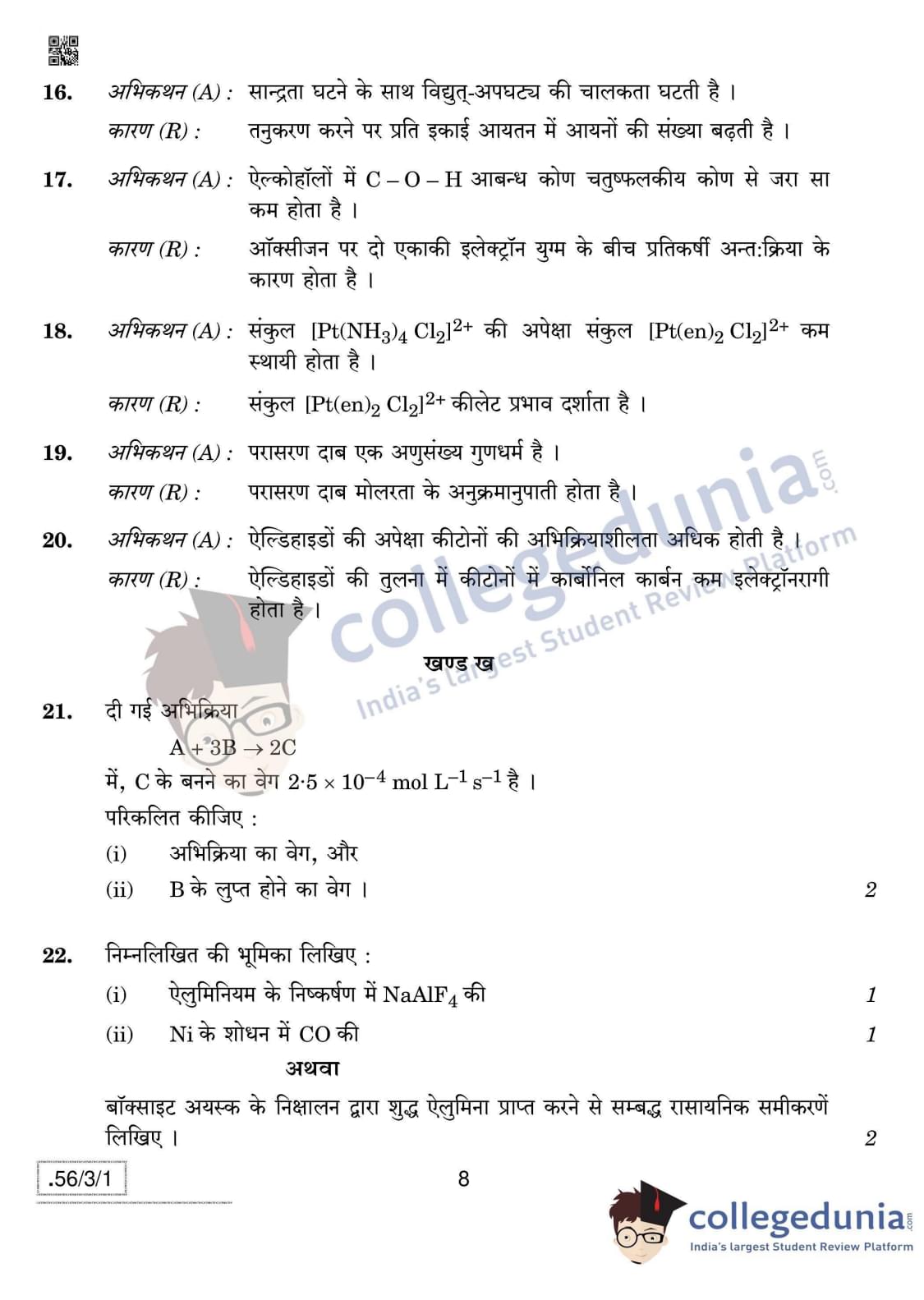 CBSE Class 12 Chemistry Question Paper 2020 with Answer Key Set 1- 56/3/1 is available for download. The exam was conducted by the Central Board of Secondary Education on March 7, 2020 in the Morning Session 10:30 AM to 1:30 PM. The medium of paper was English & Hindi. In terms of difficulty level, CBSE Class 12 Chemistry paper was of Moderate level. The question paper comprised a total of 37 questions divided among 4 sections.