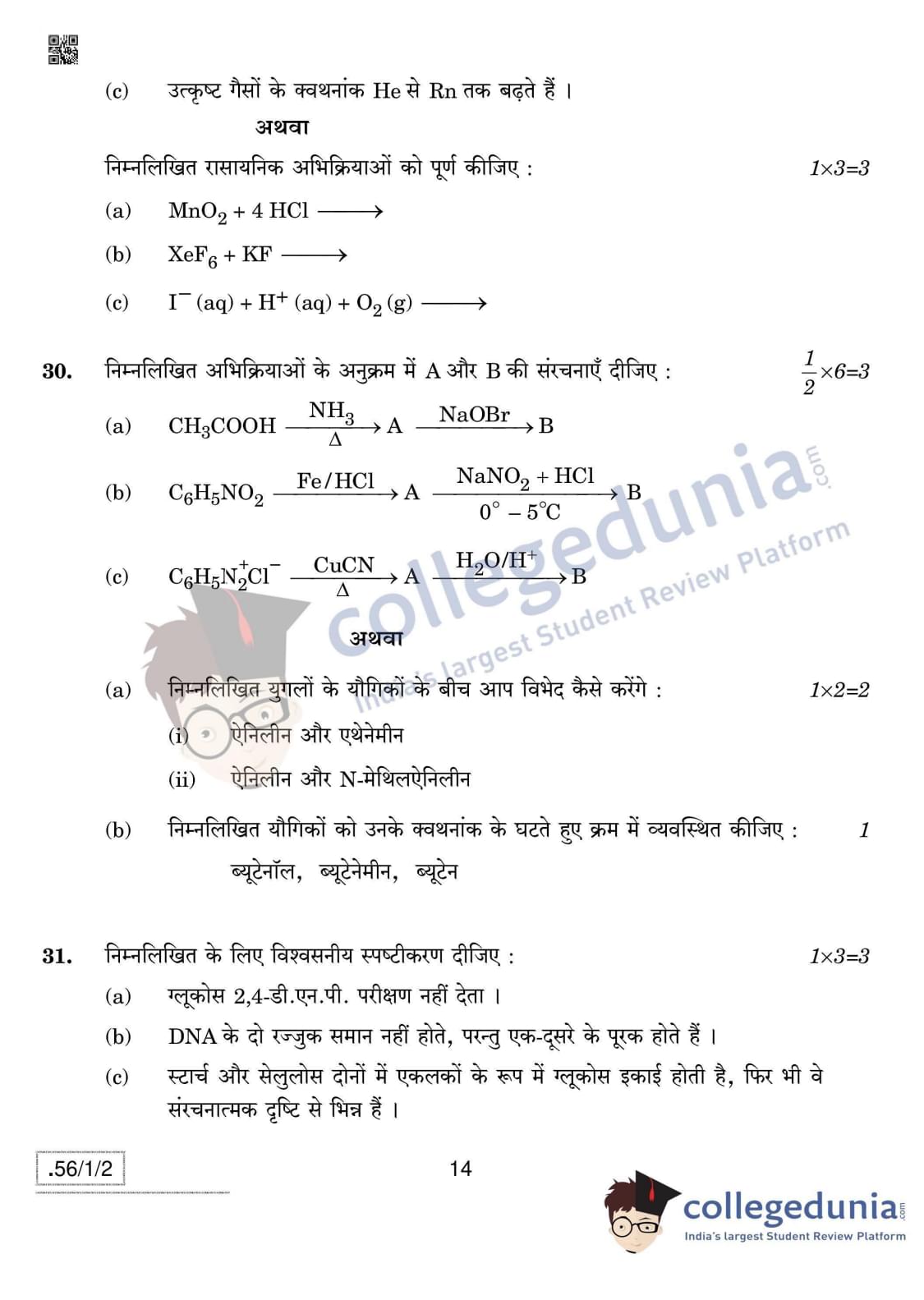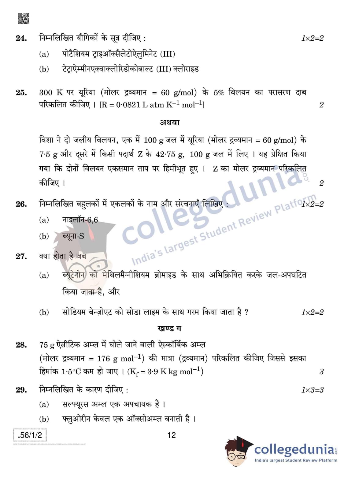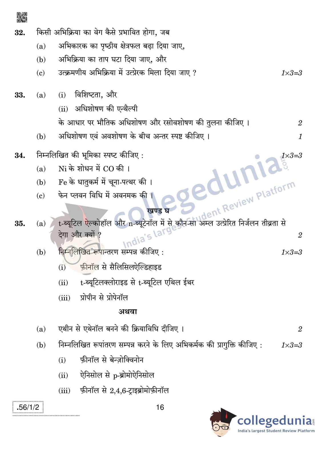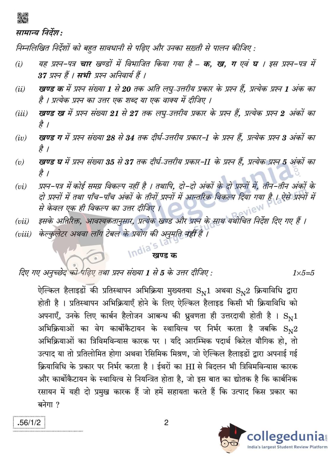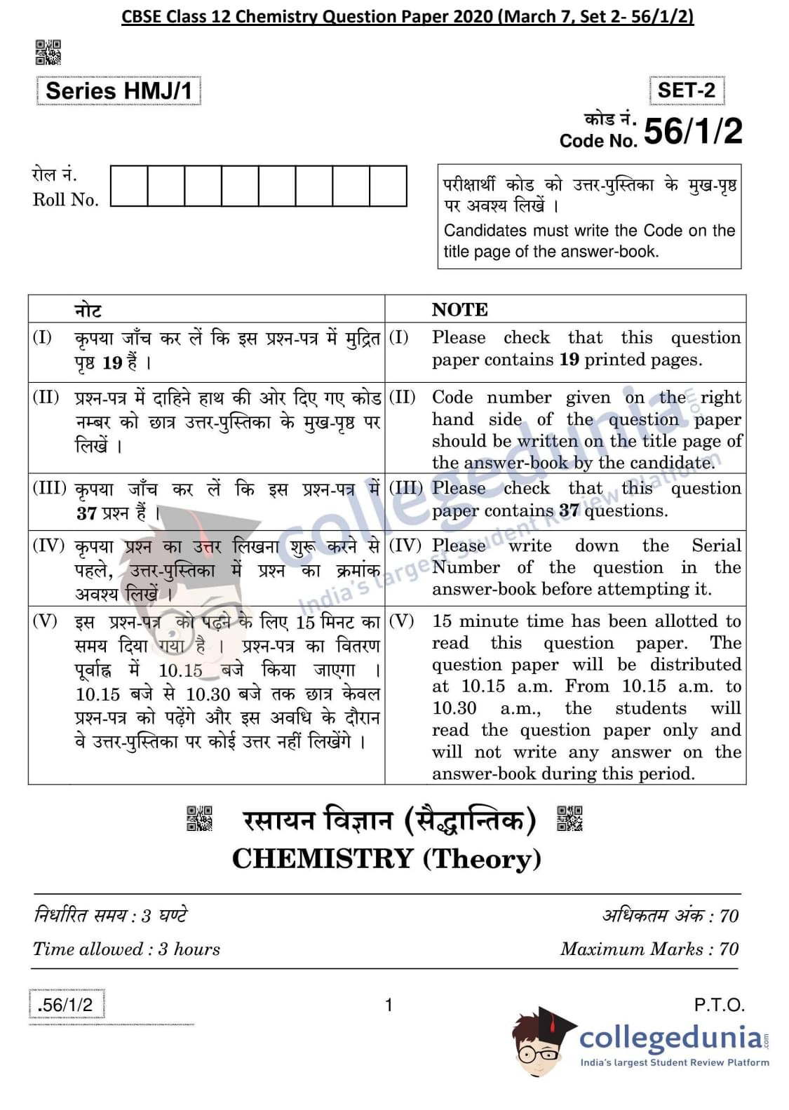 CBSE Class 12 Chemistry Question Paper 2020 with Answer Key Set 2- 56/1/2 is available for download. The exam was conducted by the Central Board of Secondary Education on March 7, 2020 in the Morning Session 10:30 AM to 1:30 PM. The medium of paper was English & Hindi. In terms of difficulty level, CBSE Class 12 Chemistry paper was of Moderate level. The question paper comprised a total of 37 questions divided among 4 sections.