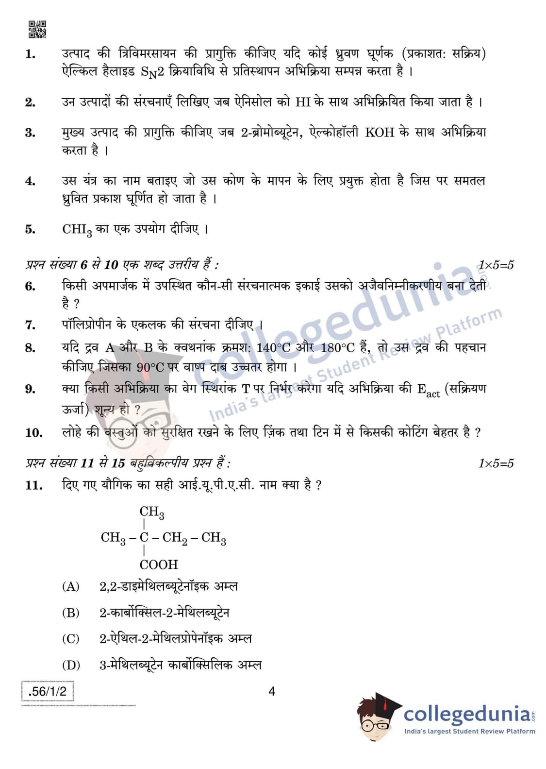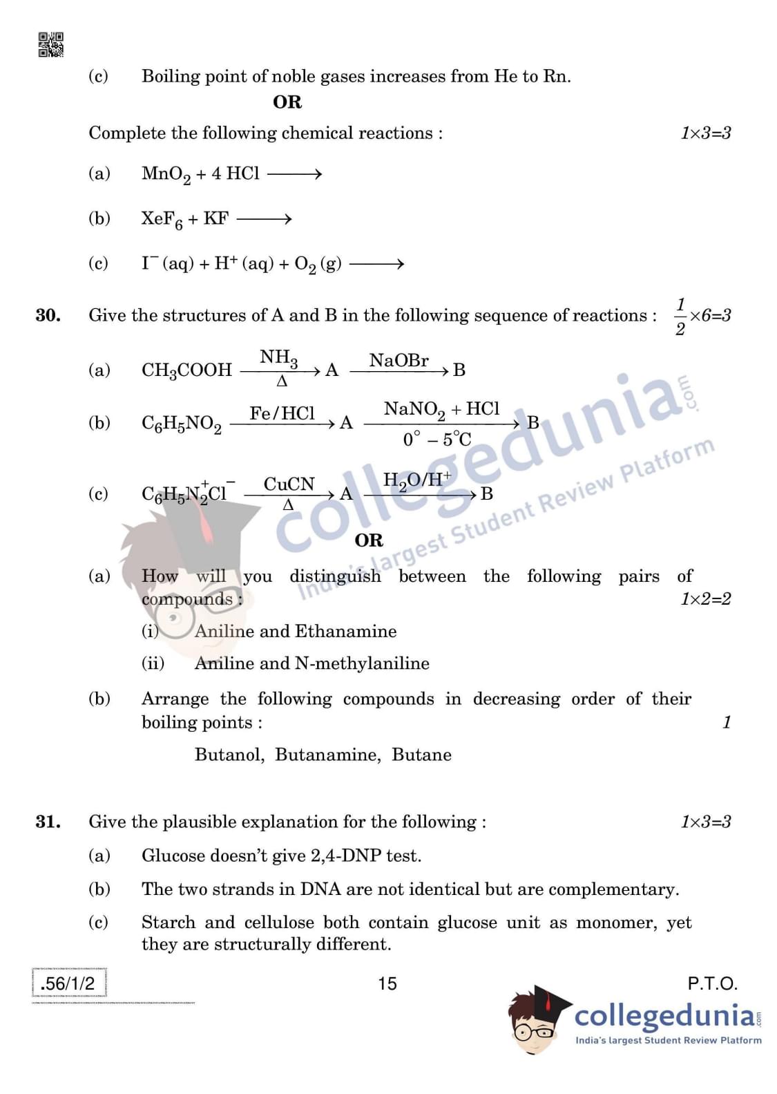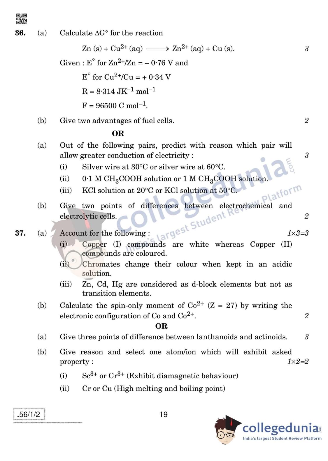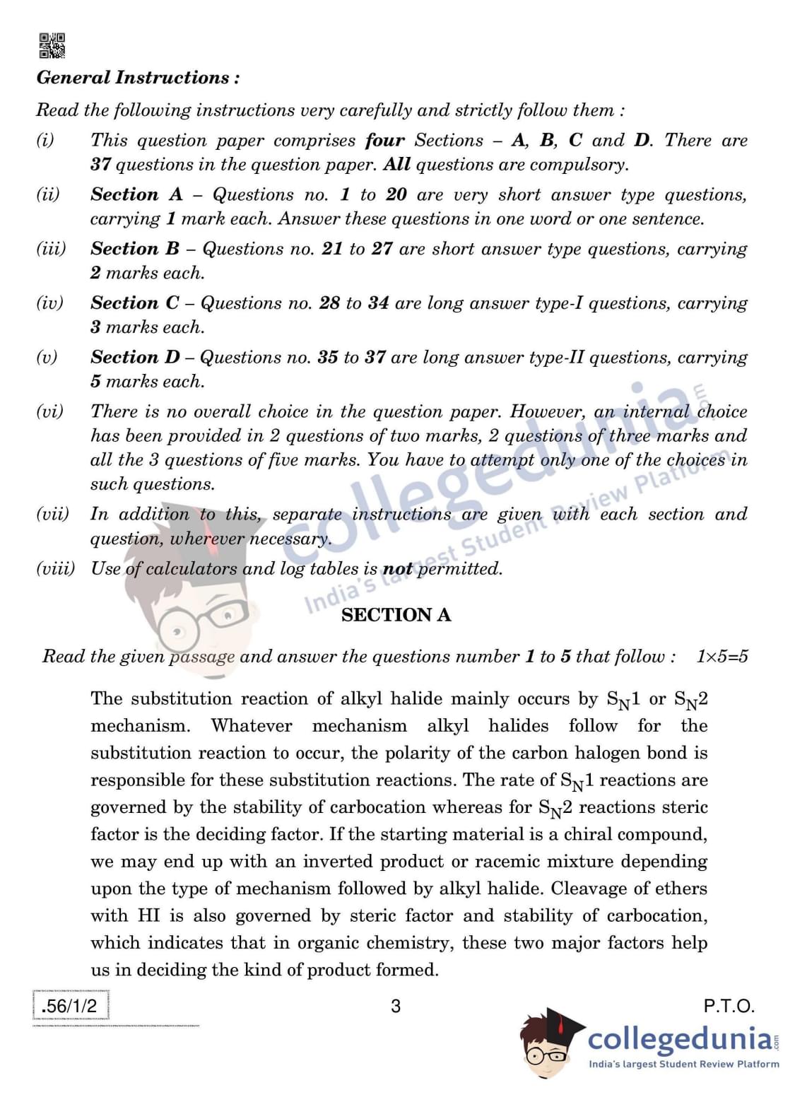 CBSE Class 12 Chemistry Question Paper 2020 with Answer Key Set 2- 56/1/2 is available for download. The exam was conducted by the Central Board of Secondary Education on March 7, 2020 in the Morning Session 10:30 AM to 1:30 PM. The medium of paper was English & Hindi. In terms of difficulty level, CBSE Class 12 Chemistry paper was of Moderate level. The question paper comprised a total of 37 questions divided among 4 sections.
