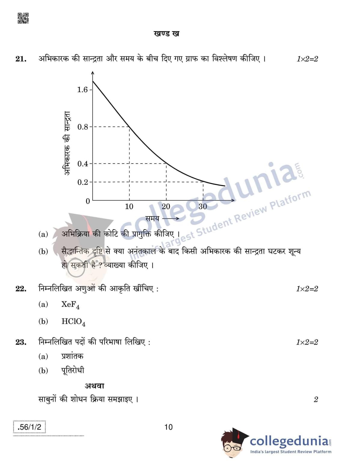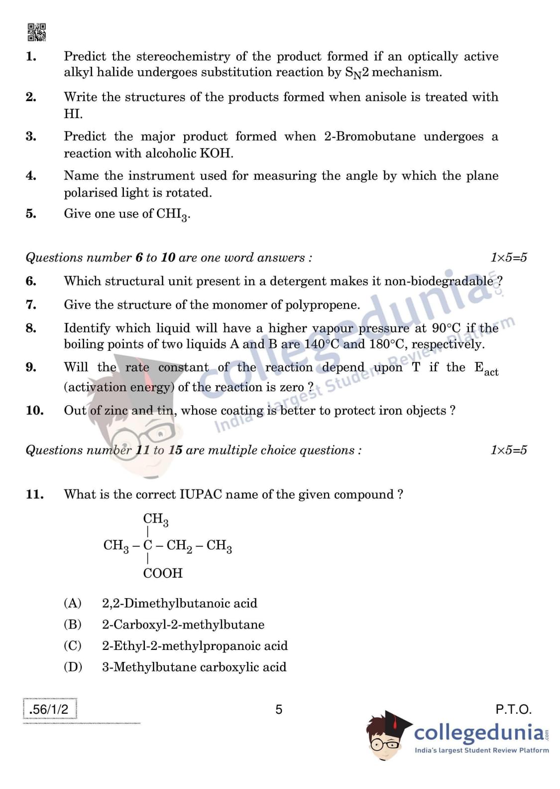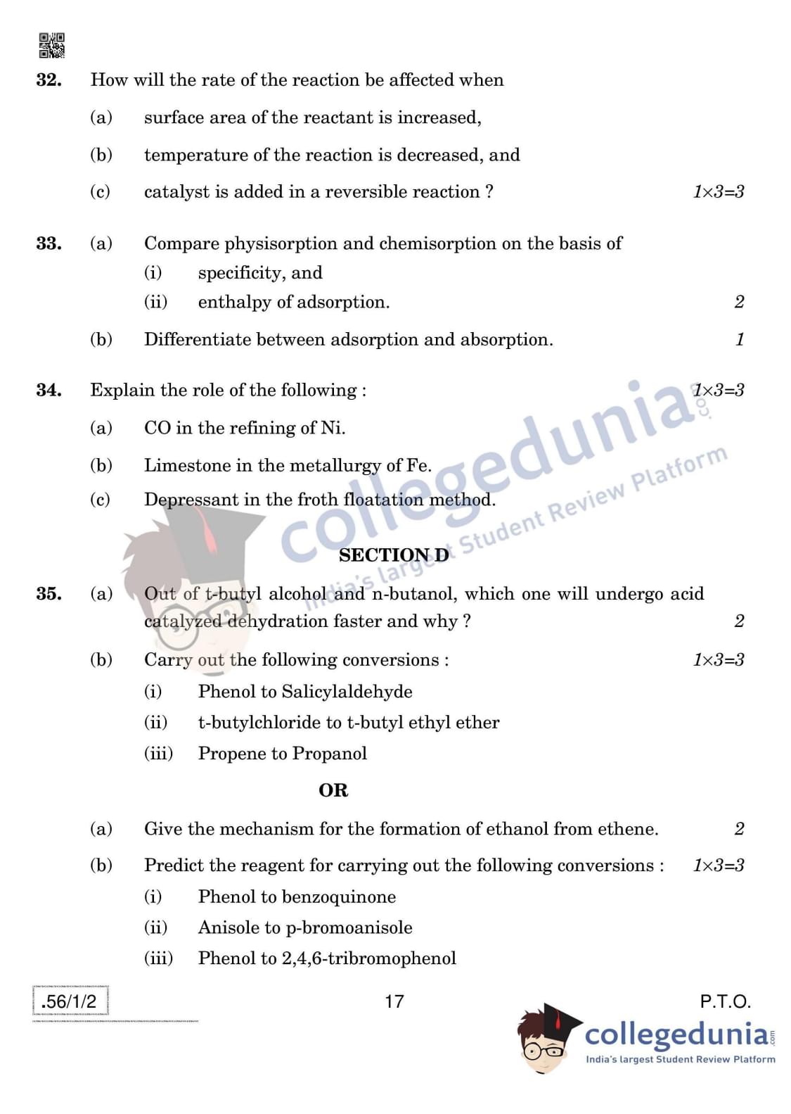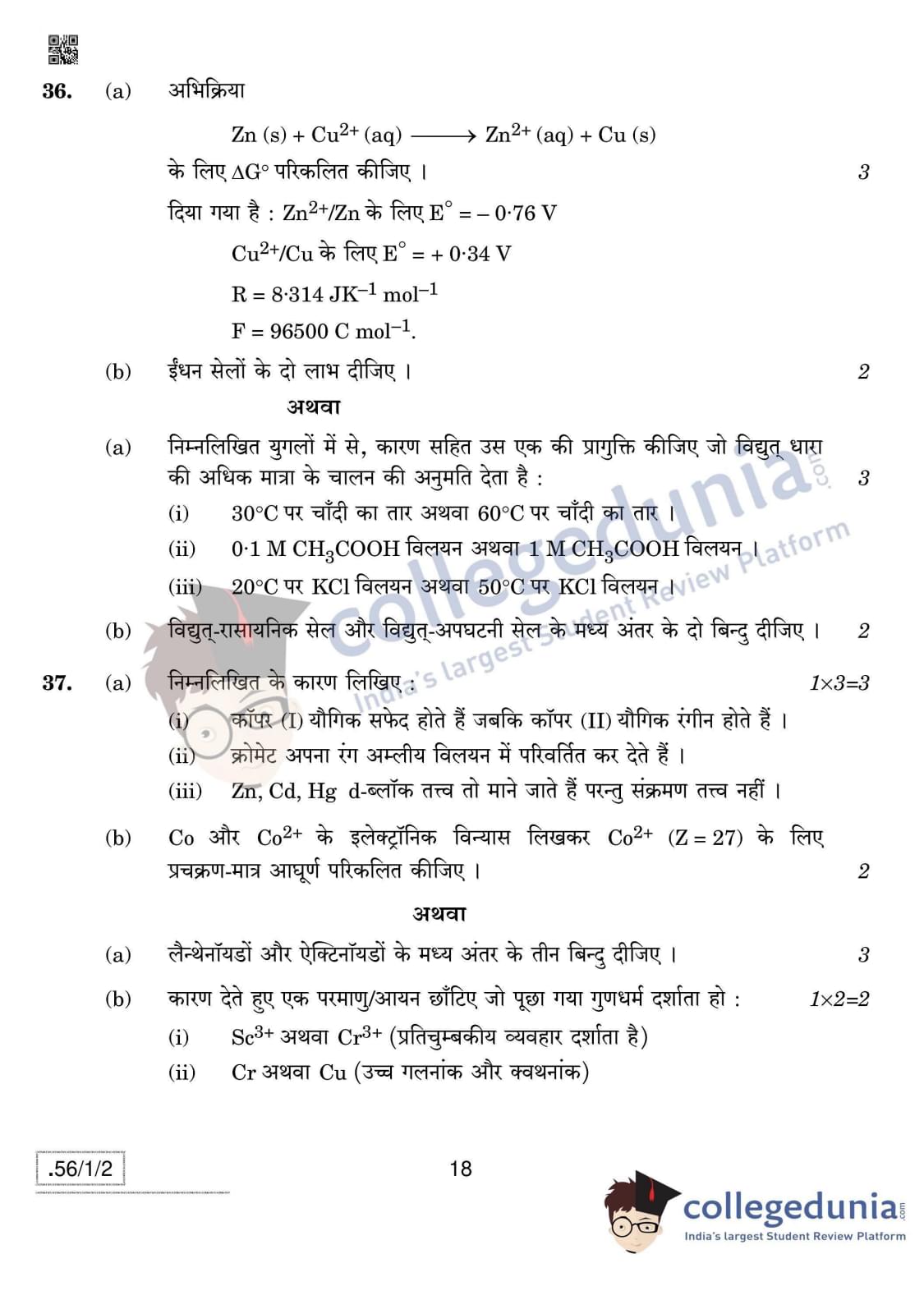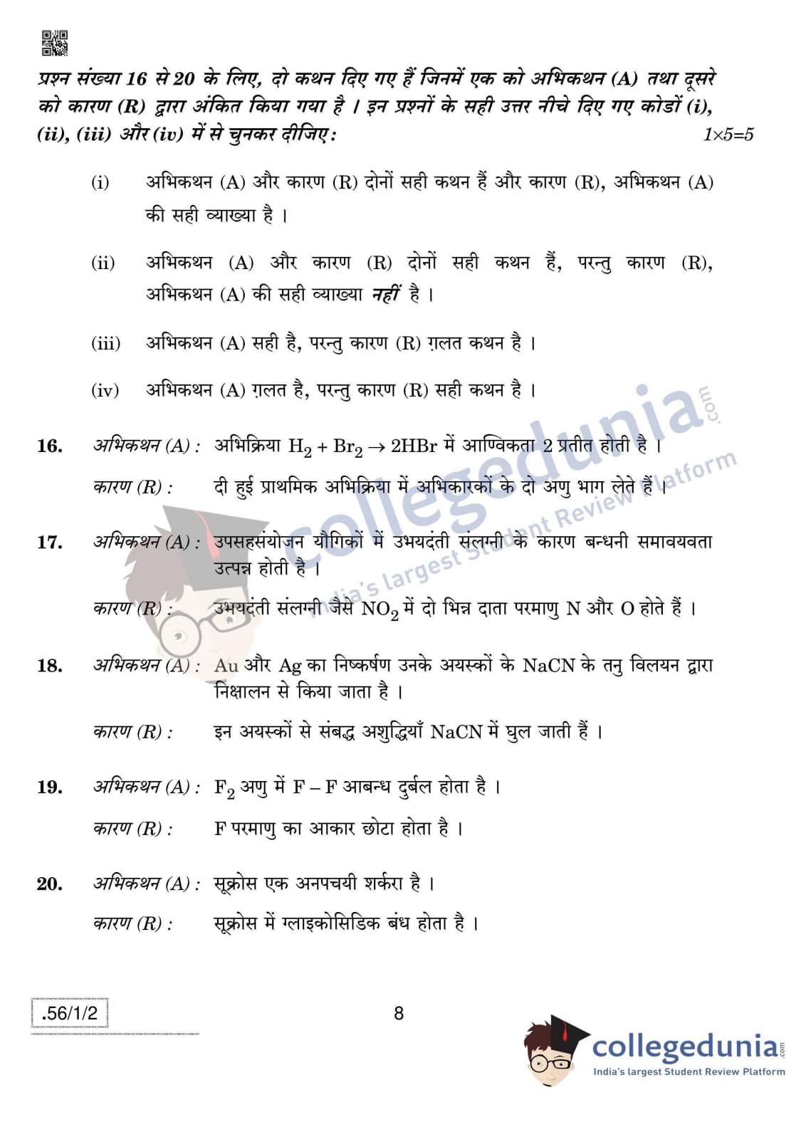 CBSE Class 12 Chemistry Question Paper 2020 with Answer Key Set 2- 56/1/2 is available for download. The exam was conducted by the Central Board of Secondary Education on March 7, 2020 in the Morning Session 10:30 AM to 1:30 PM. The medium of paper was English & Hindi. In terms of difficulty level, CBSE Class 12 Chemistry paper was of Moderate level. The question paper comprised a total of 37 questions divided among 4 sections.