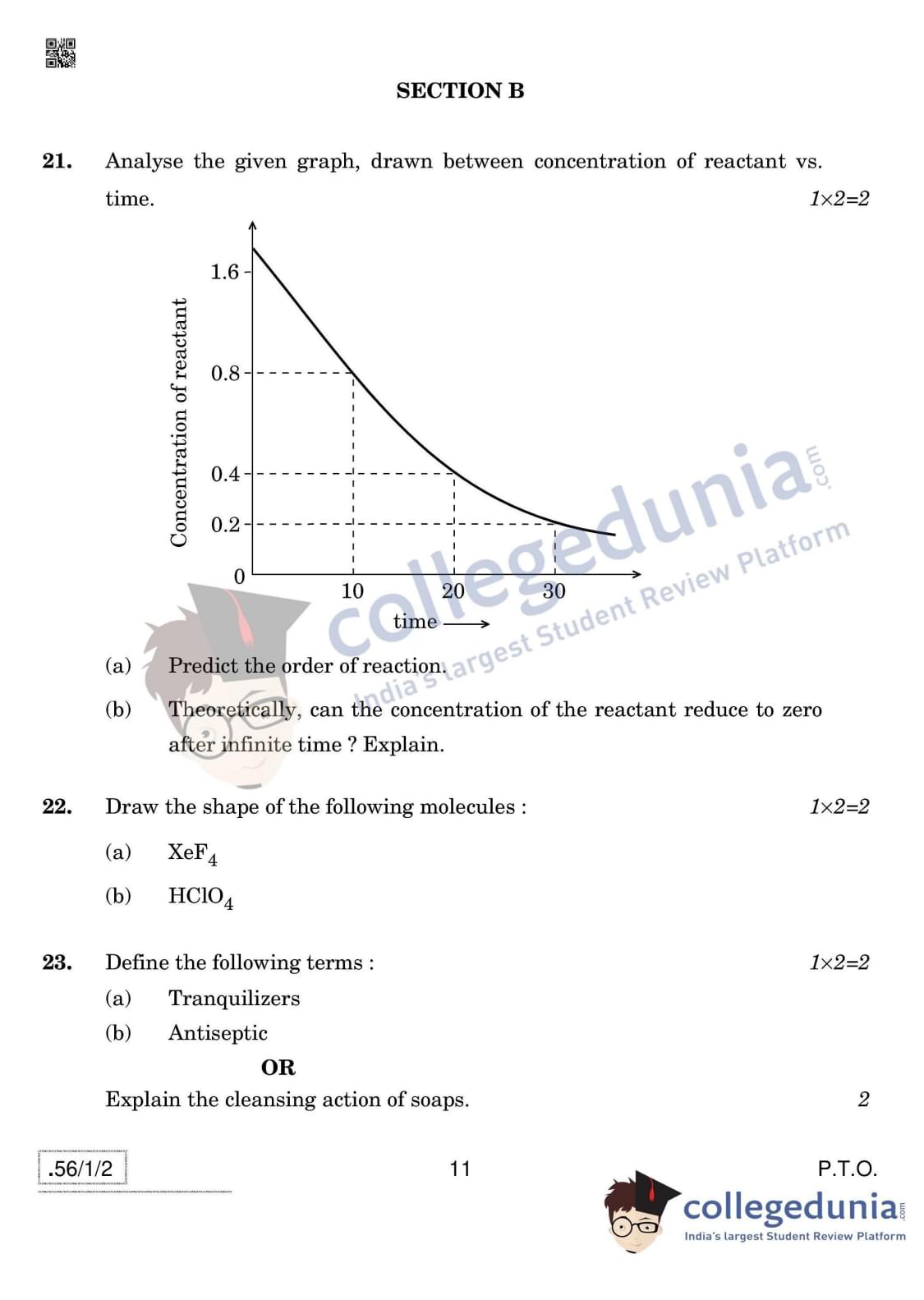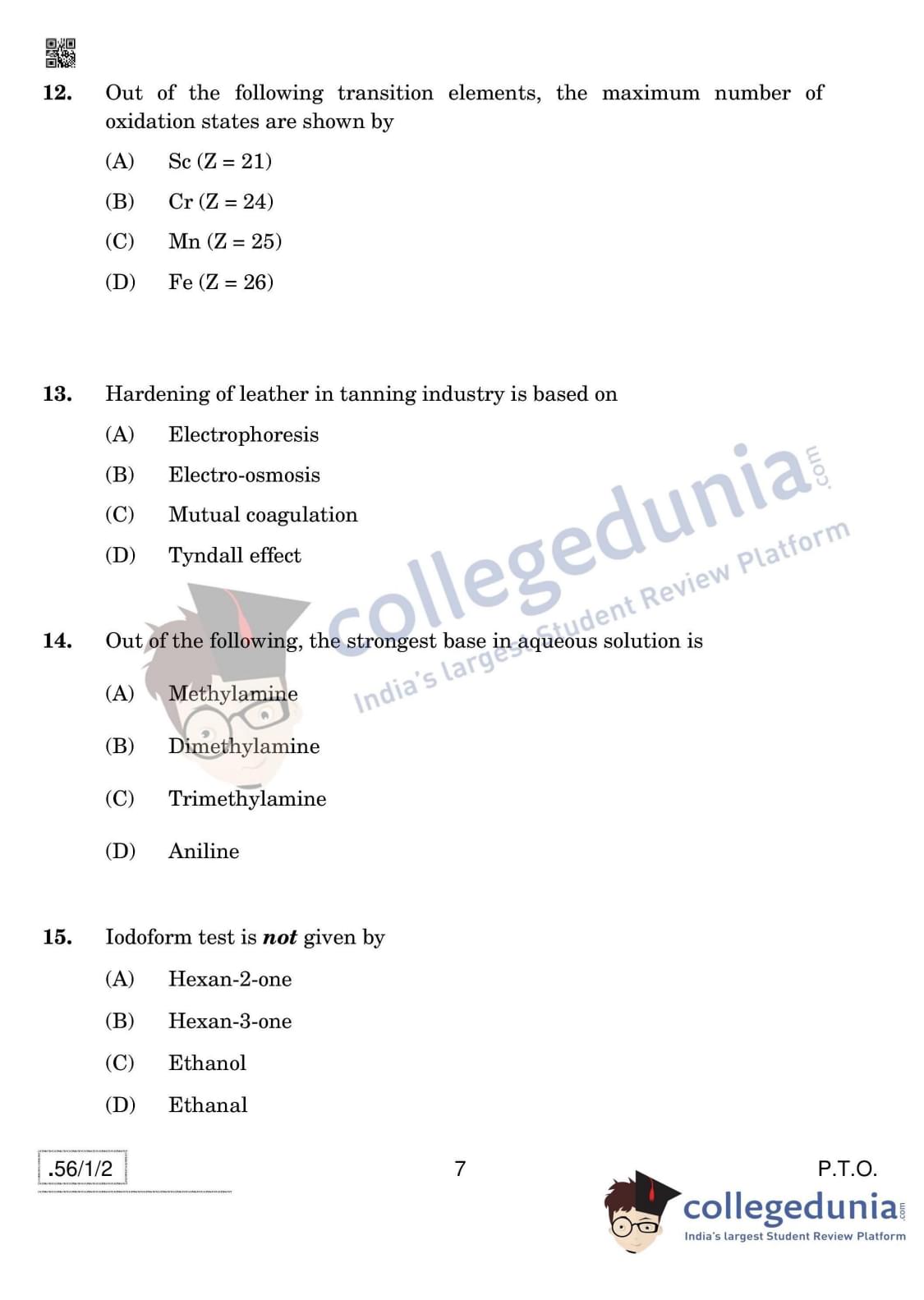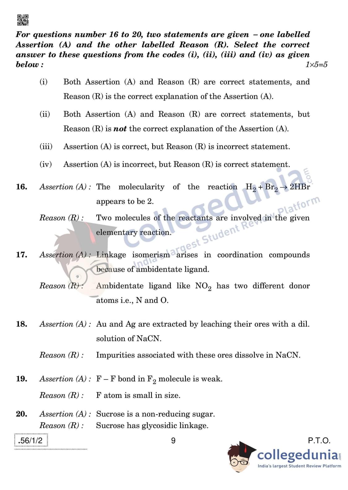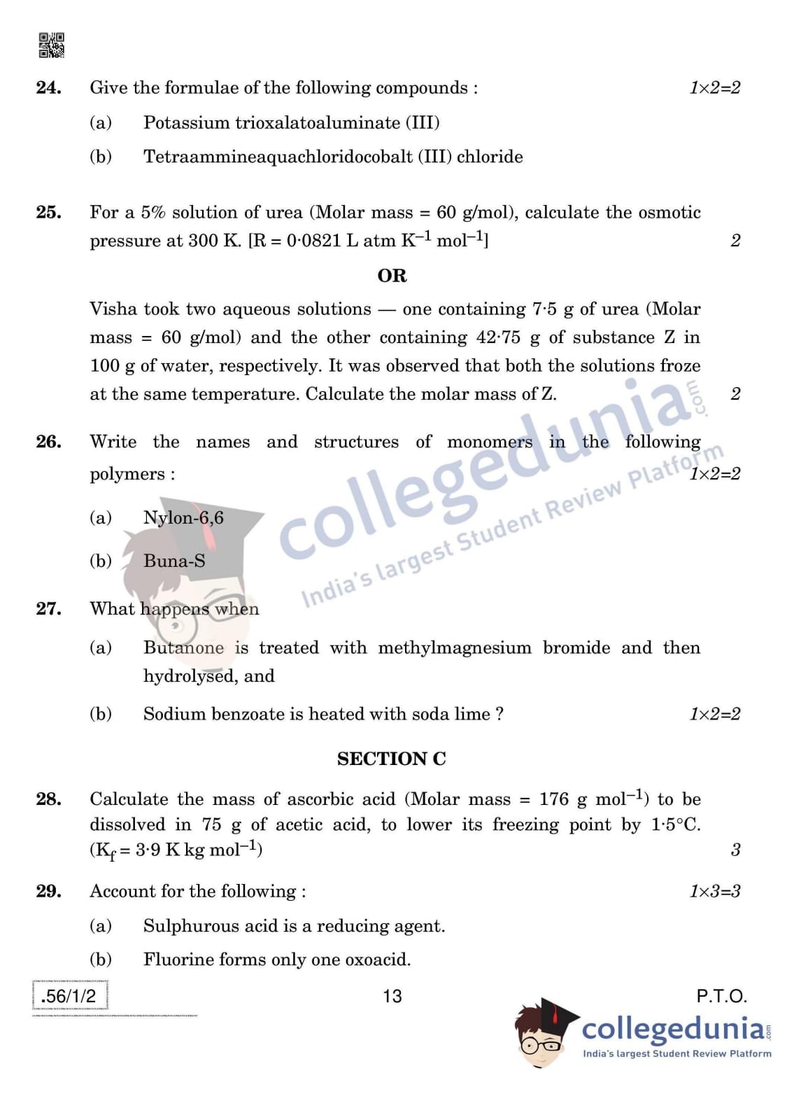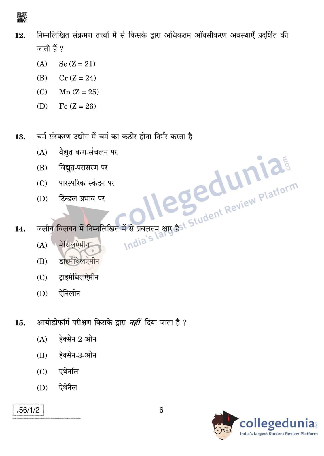CBSE Class 12 Chemistry Question Paper 2020 with Answer Key Set 2- 56/1/2 is available for download. The exam was conducted by the Central Board of Secondary Education on March 7, 2020 in the Morning Session 10:30 AM to 1:30 PM. The medium of paper was English & Hindi. In terms of difficulty level, CBSE Class 12 Chemistry paper was of Moderate level. The question paper comprised a total of 37 questions divided among 4 sections.