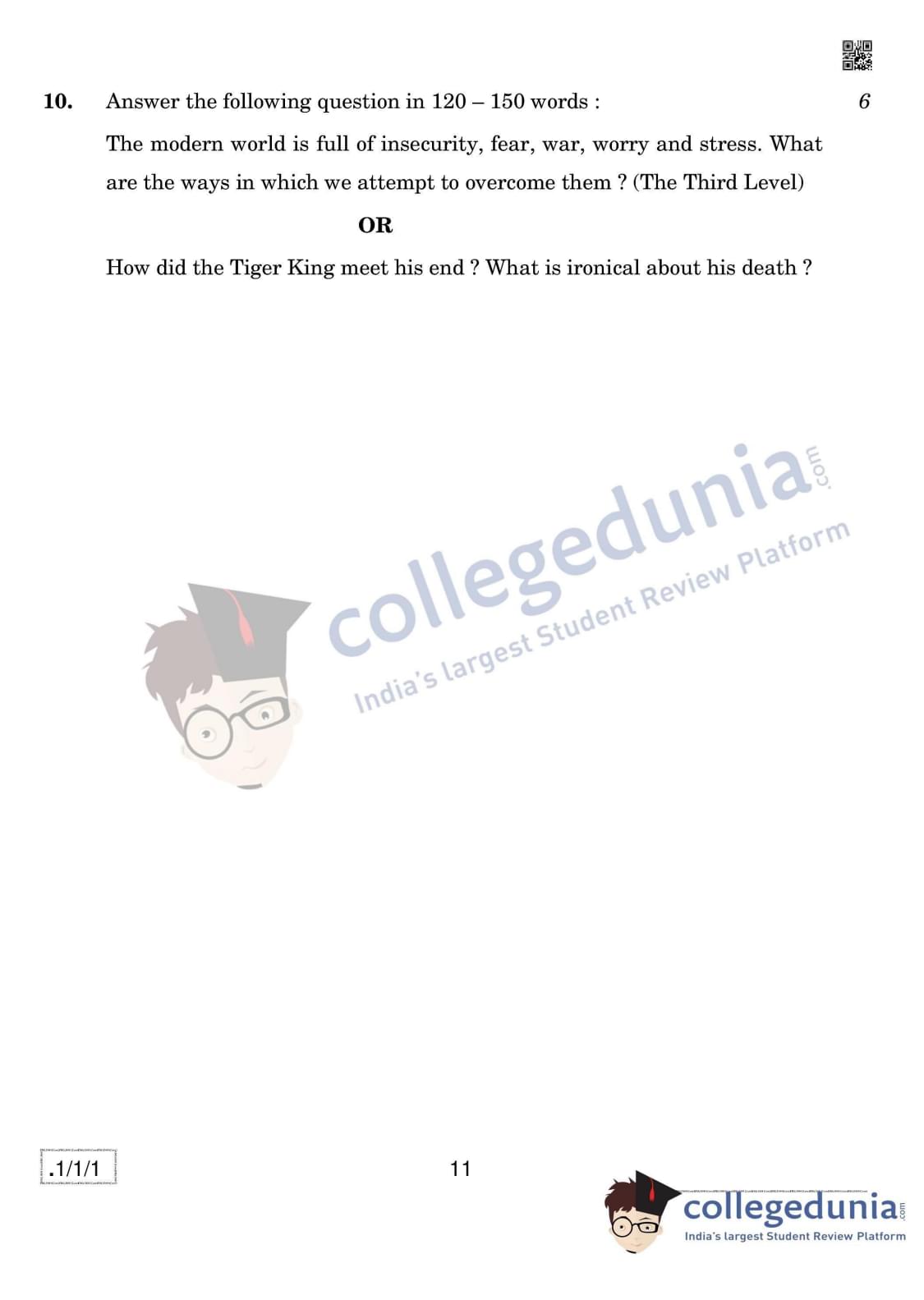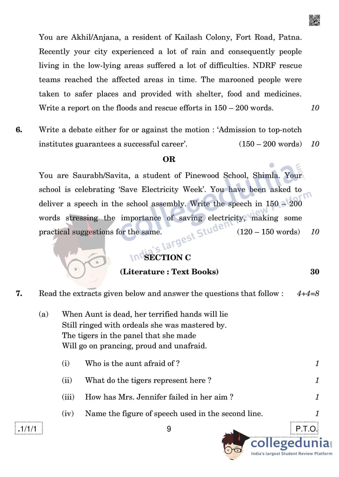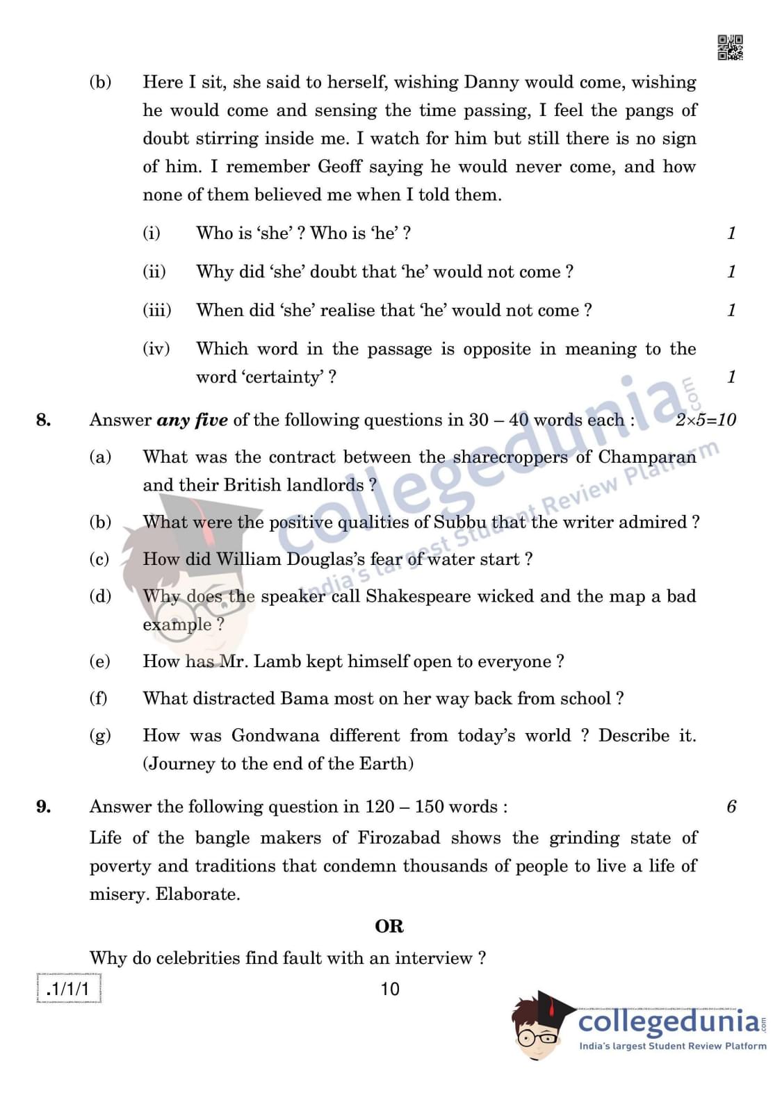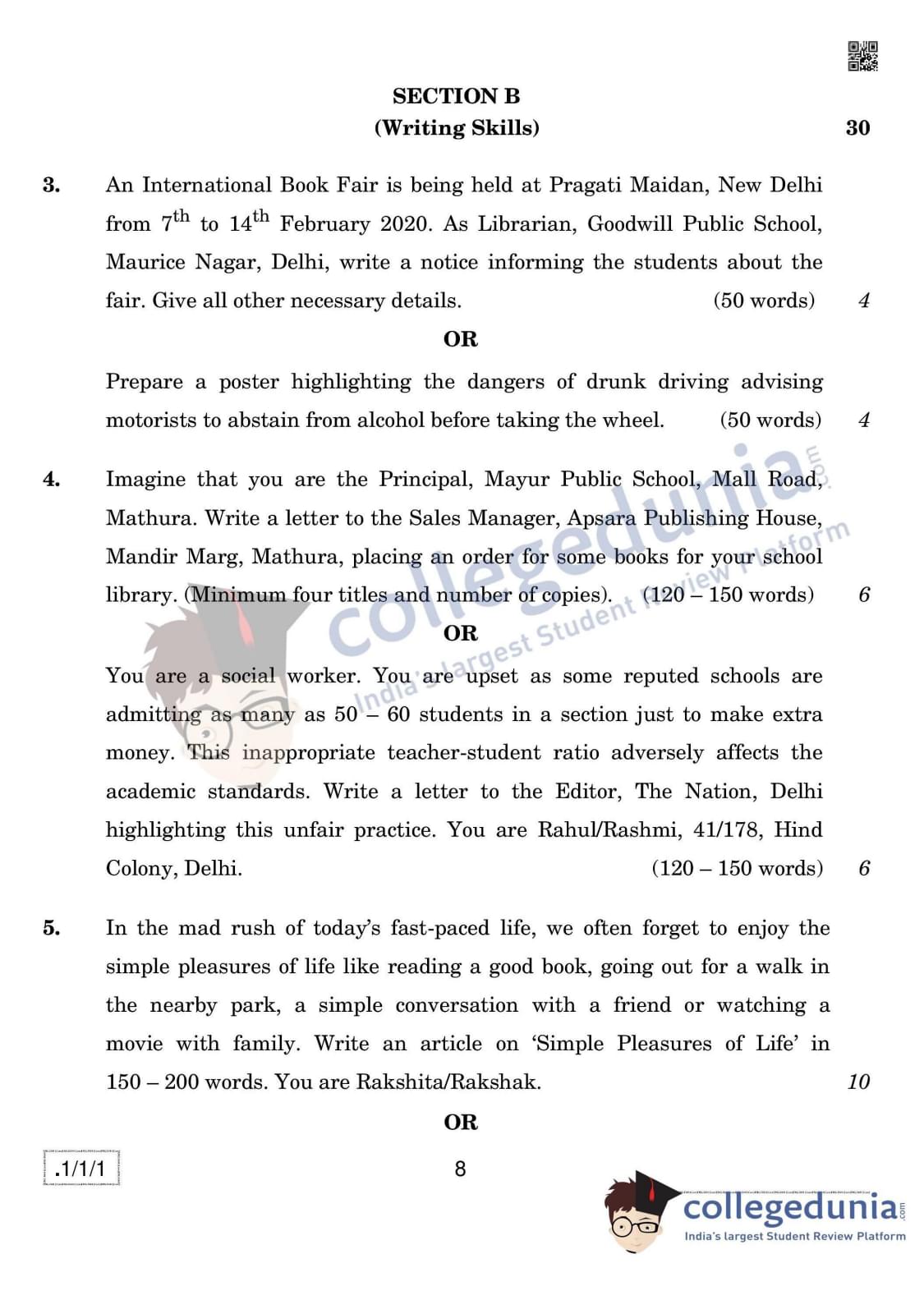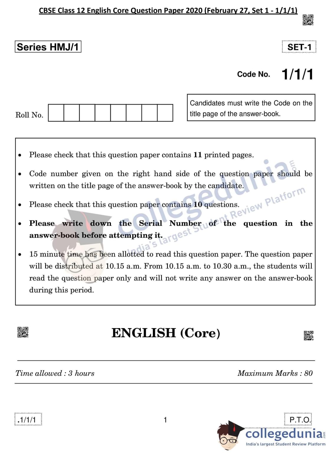 CBSE Class 12 English Core Set 1 - 1/1/1 Question Paper 2020 with Answer Key (February 27)