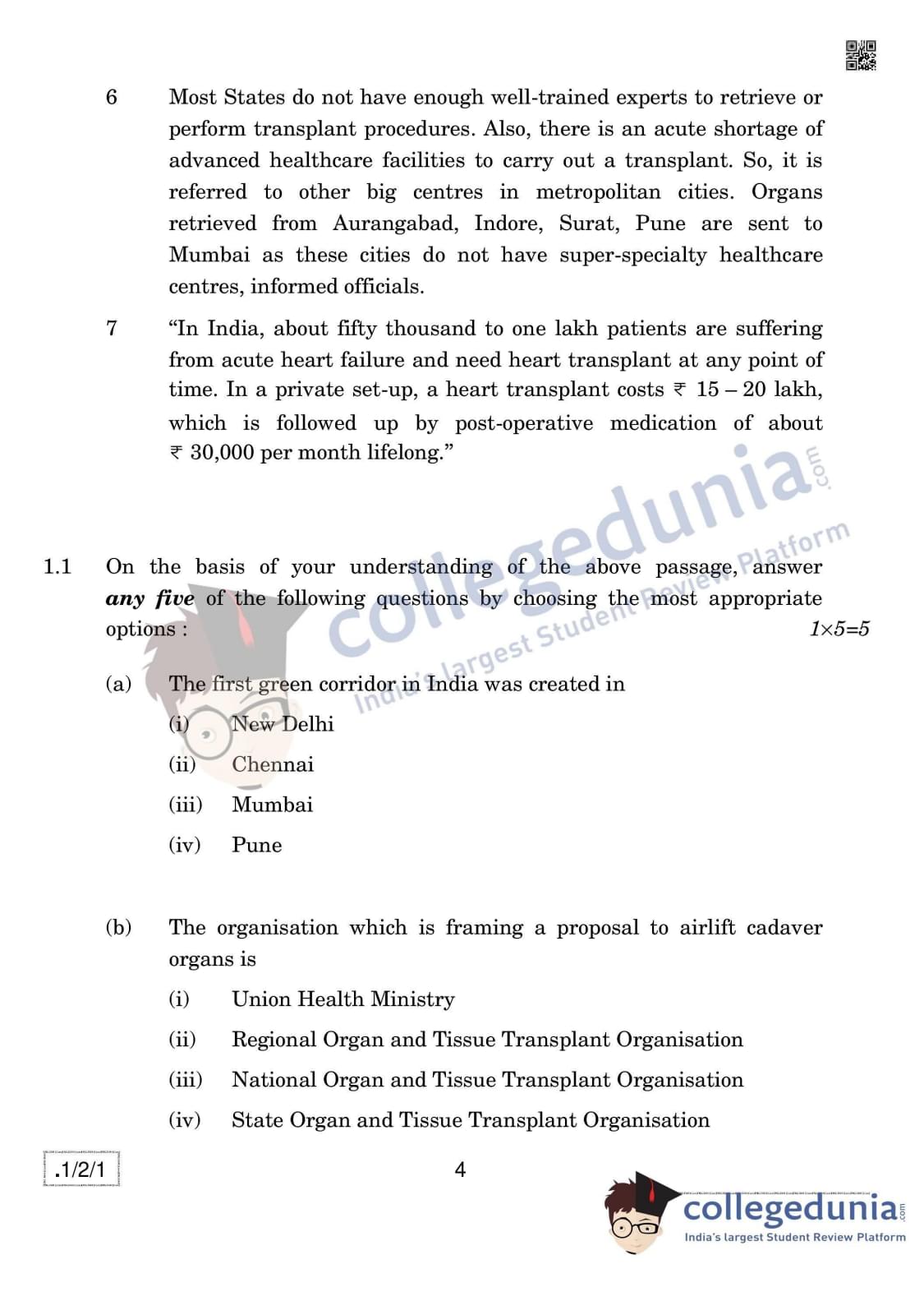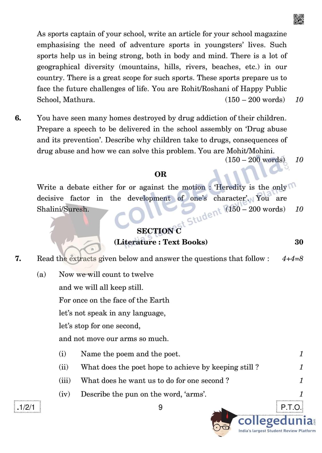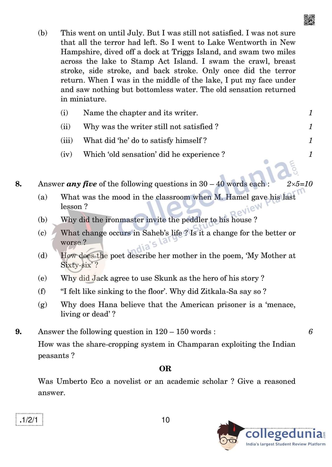 CBSE Class 12 English Core Set 1 - 1/2/1 Question Paper 2020 with Answer Key (February 27)