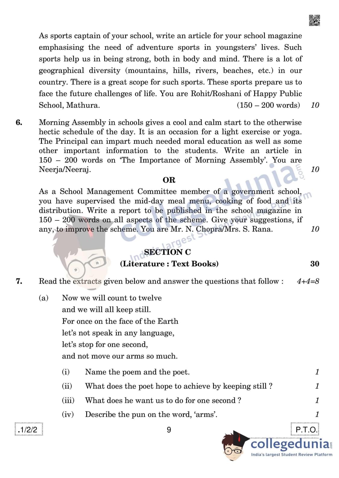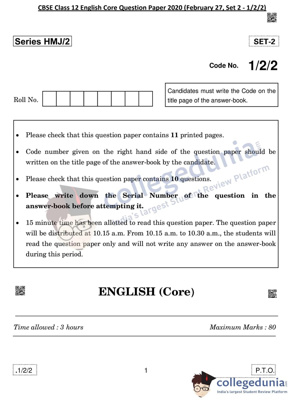CBSE Class 12 English Core Set 2 - 1/2/2 Question Paper 2020 with Answer Key (February 27)