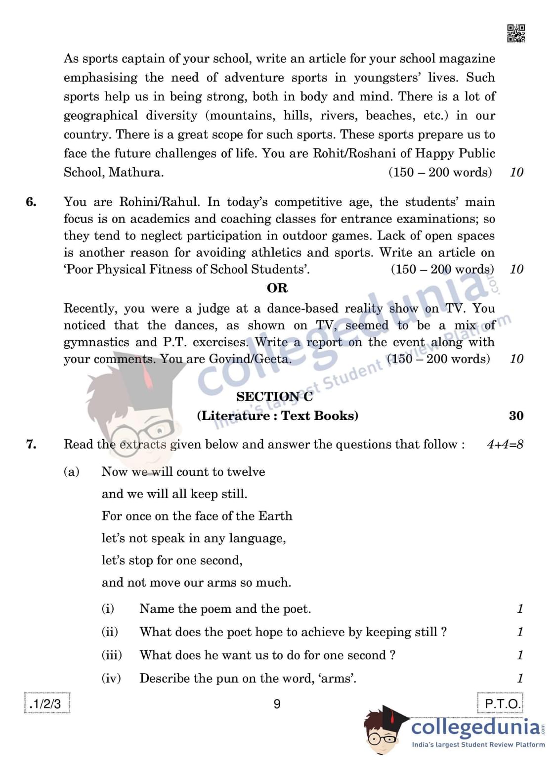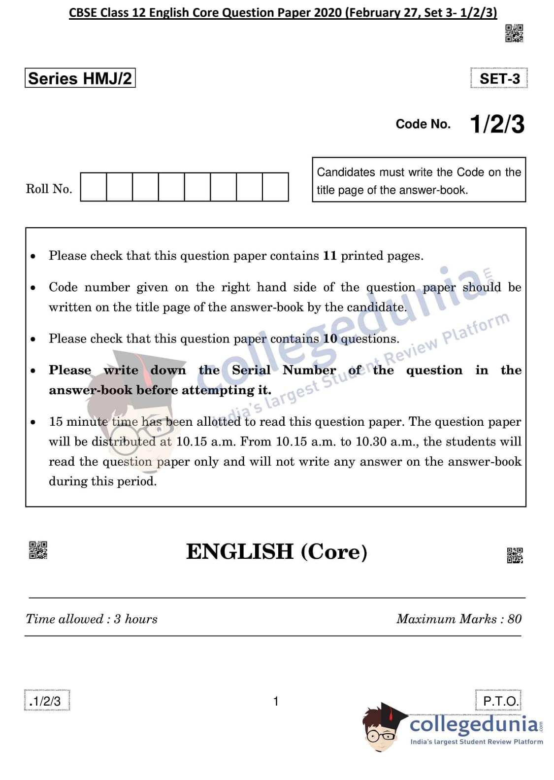 CBSE Class 12 English Core Set 3- 1/2/3 Question Paper 2020 with Answer Key (February 27)