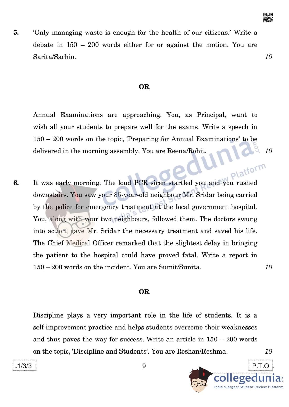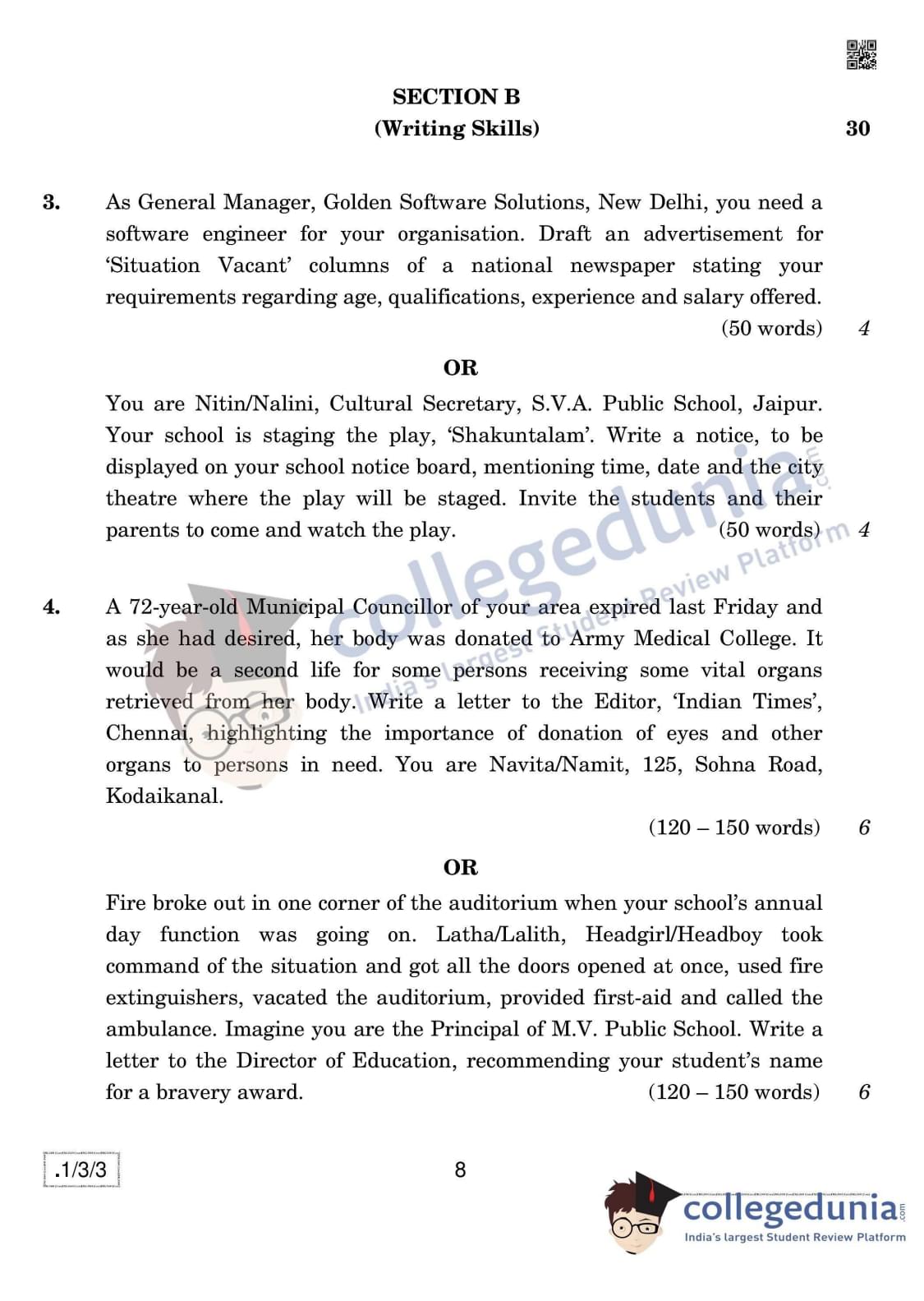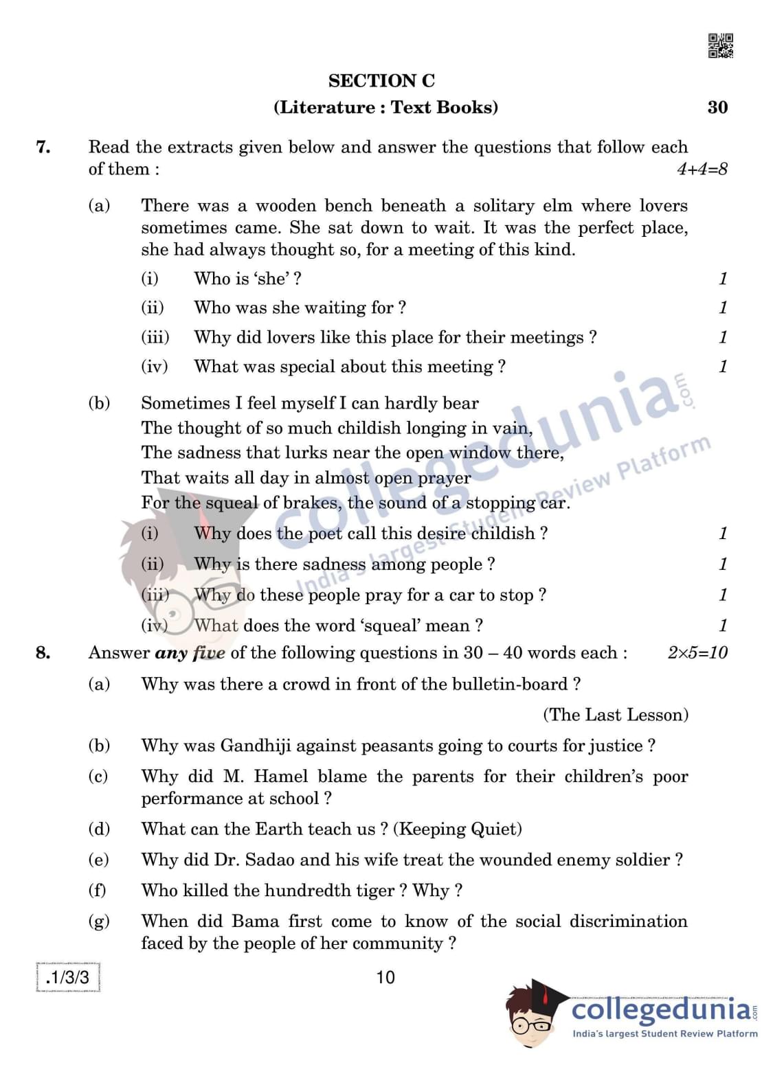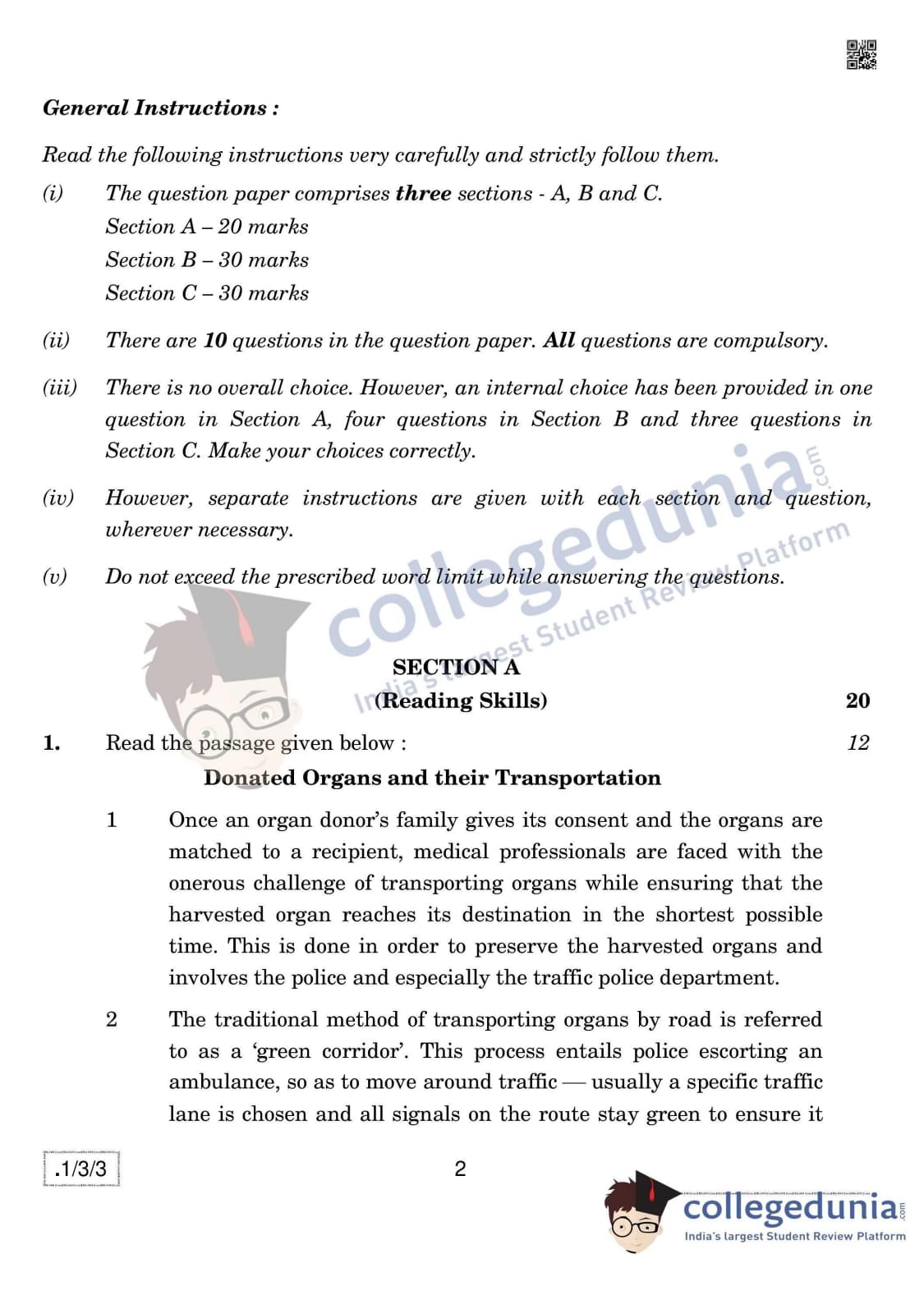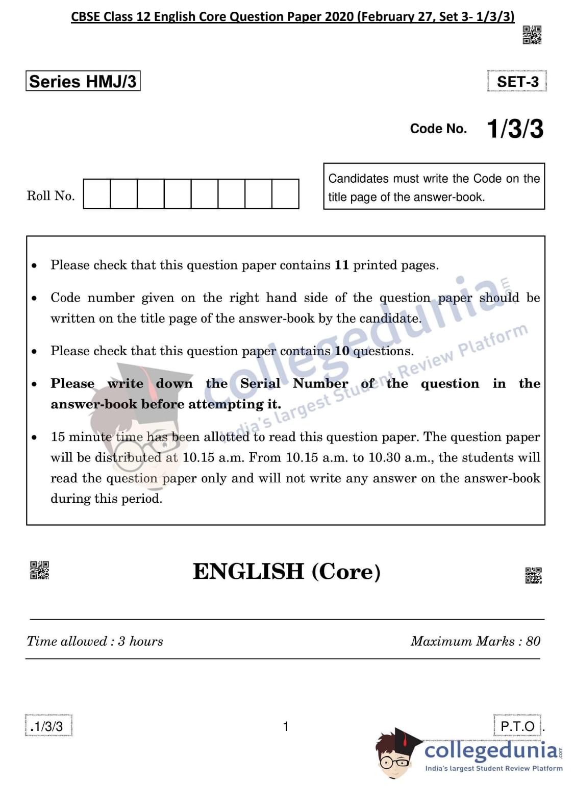 CBSE Class 12 English Core Question Paper 2020 with Answer Key Set 3- 1/3/3 is available for download. The exam was conducted by the Central Board of Secondary Education on February 27, 2020 in the Morning Session 10:30 AM to 1:30 PM. The medium of paper was English. In terms of difficulty level, CBSE Class 12 English Core paper was of Easy to Moderate level. The question paper comprised a total of 10 questions divided among 3 sections.