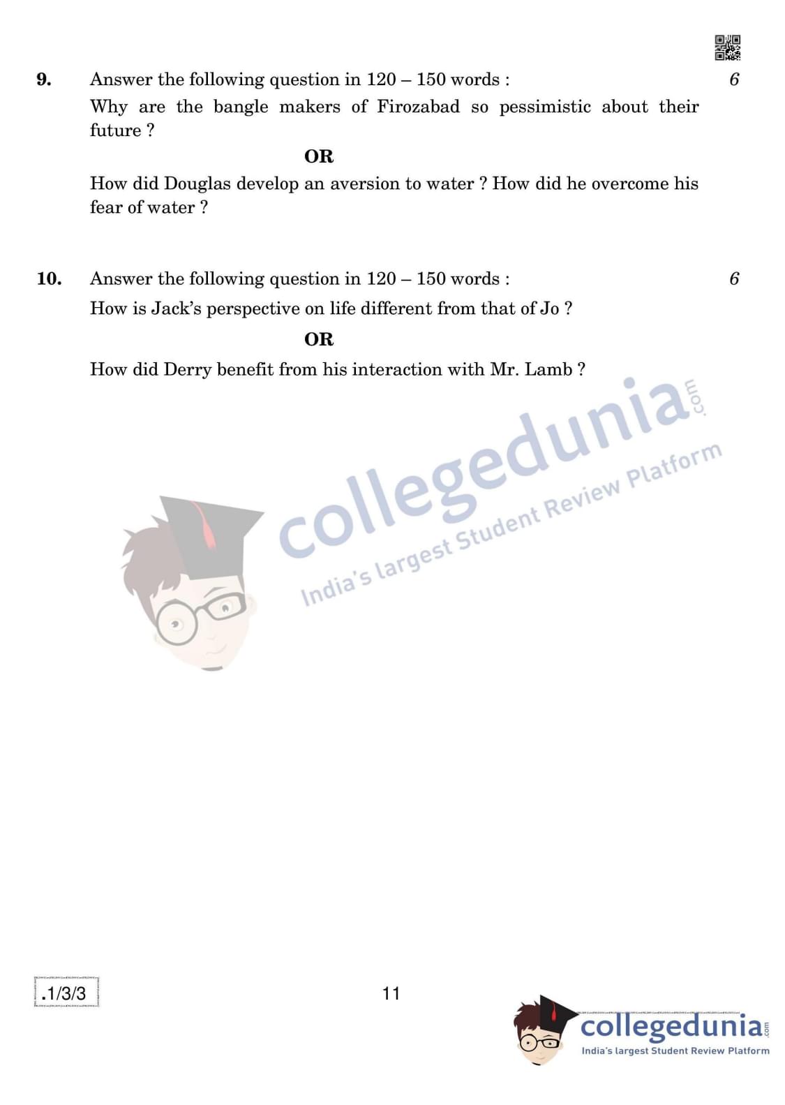 CBSE Class 12 English Core Set 3- 1/3/3 Question Paper 2020 with Answer Key (February 27)