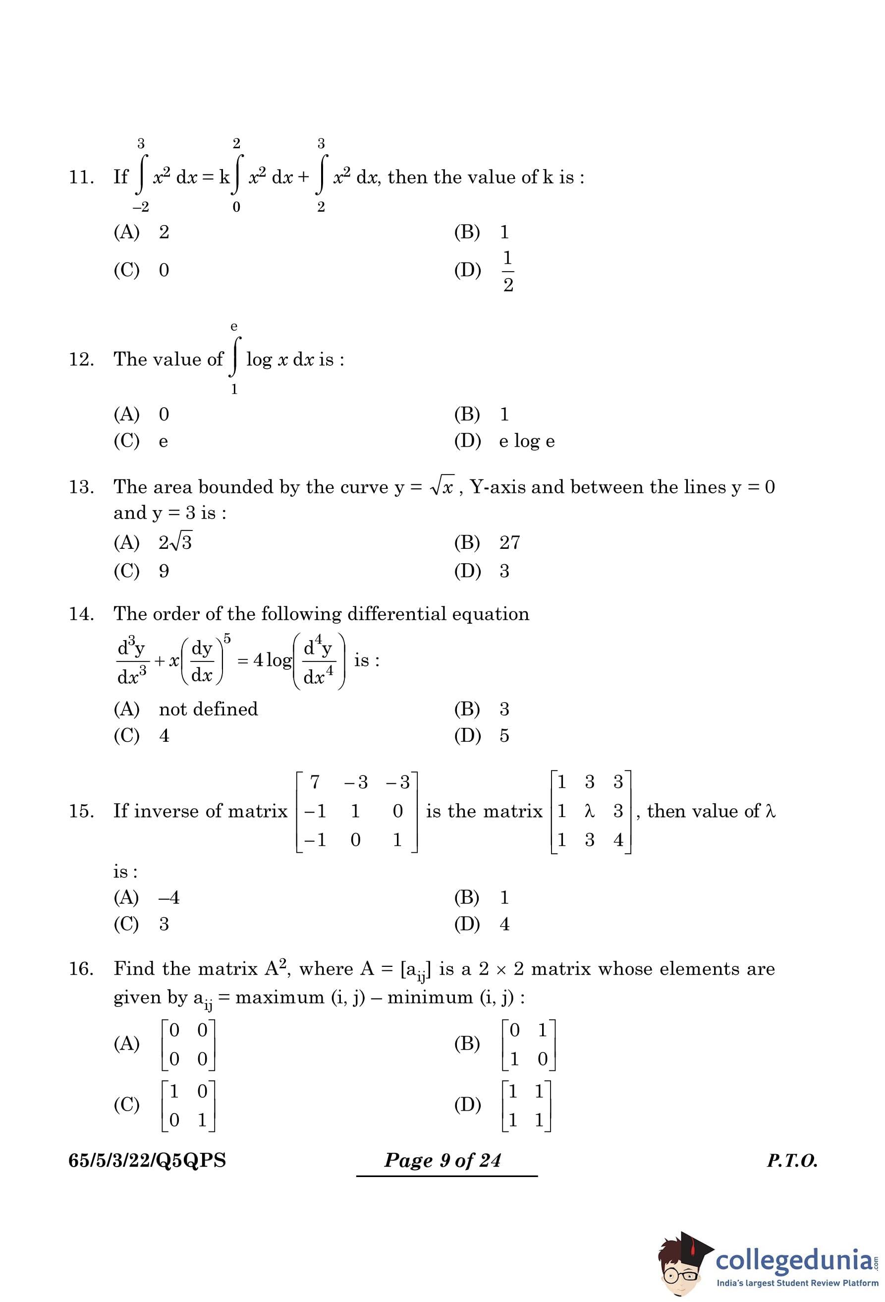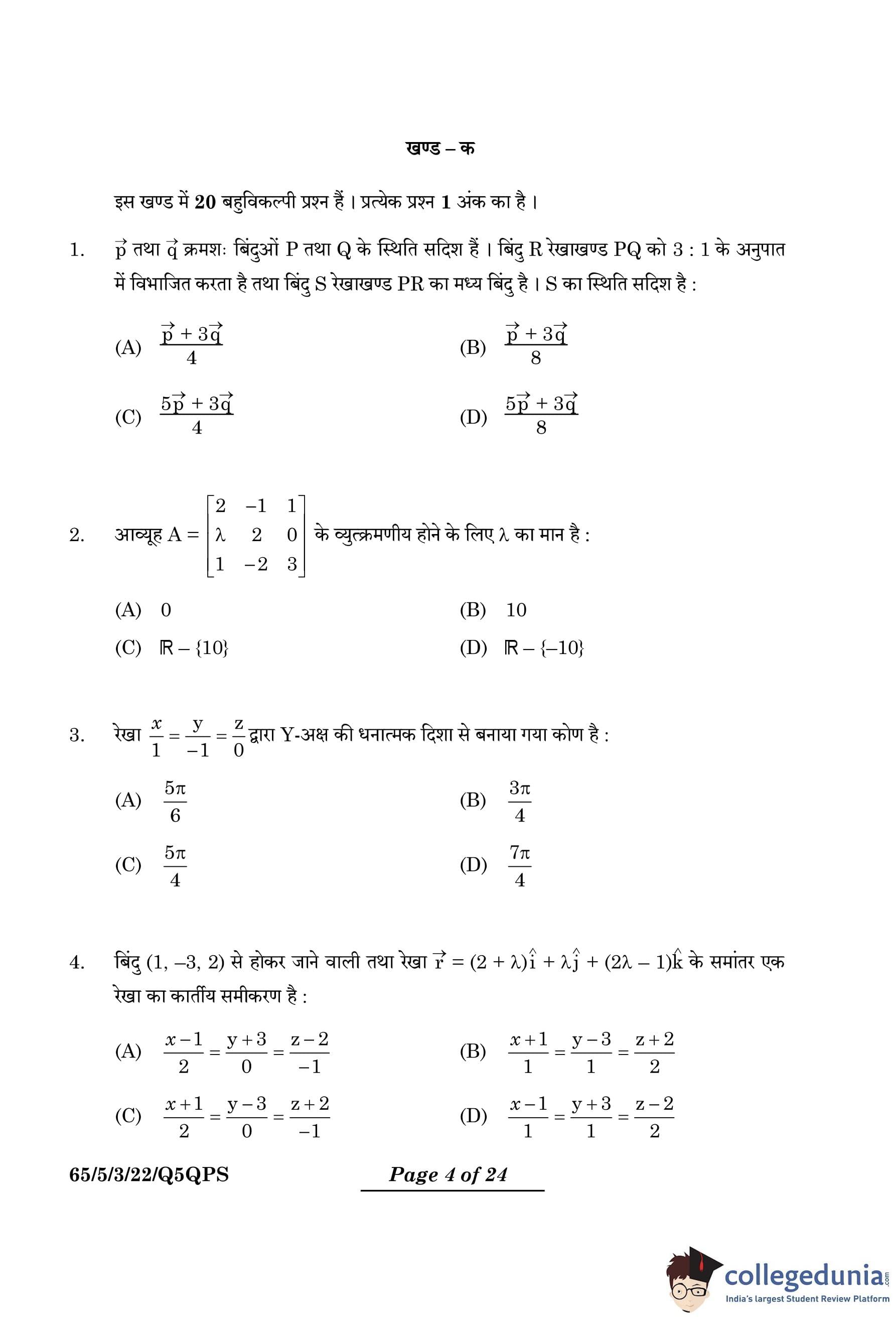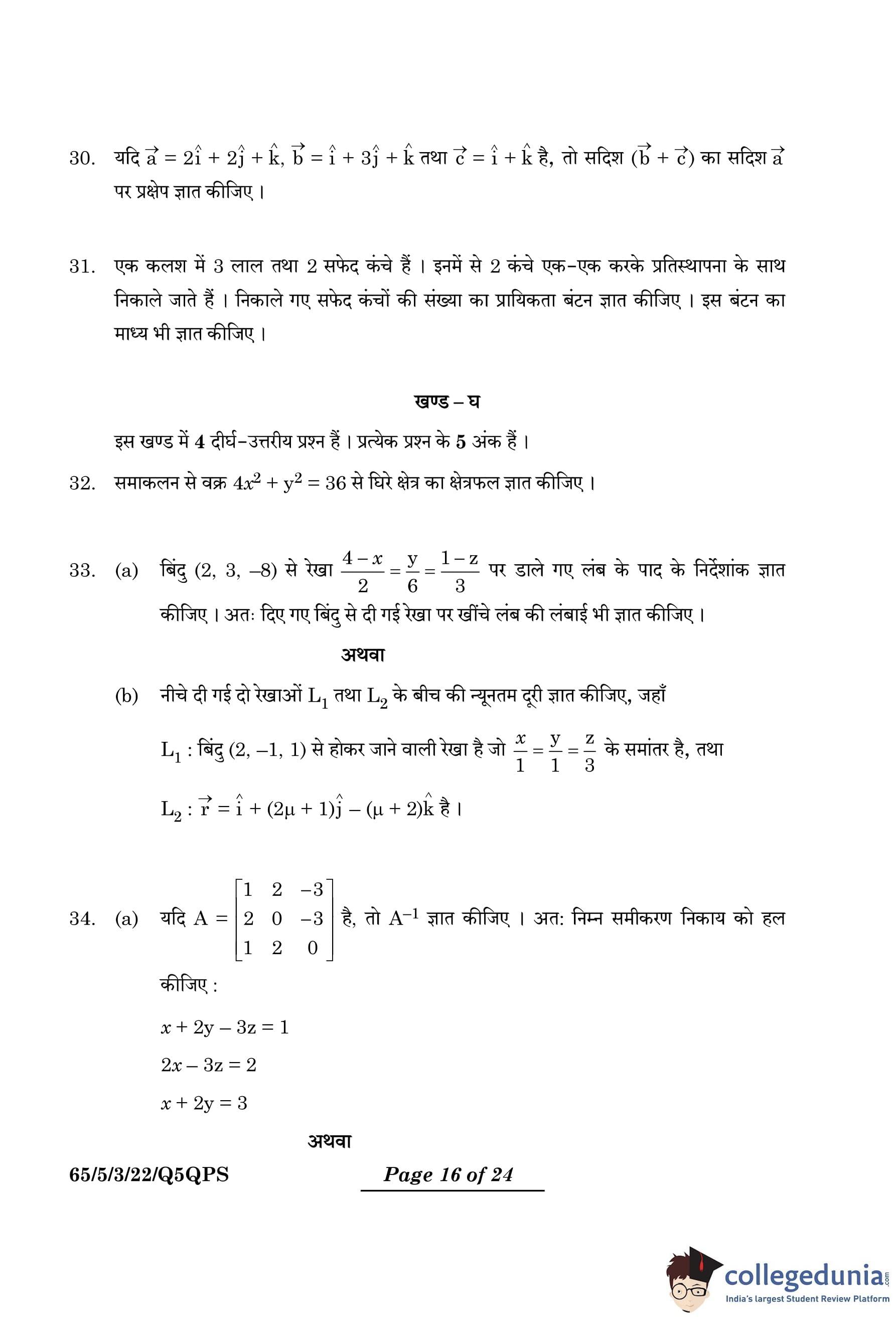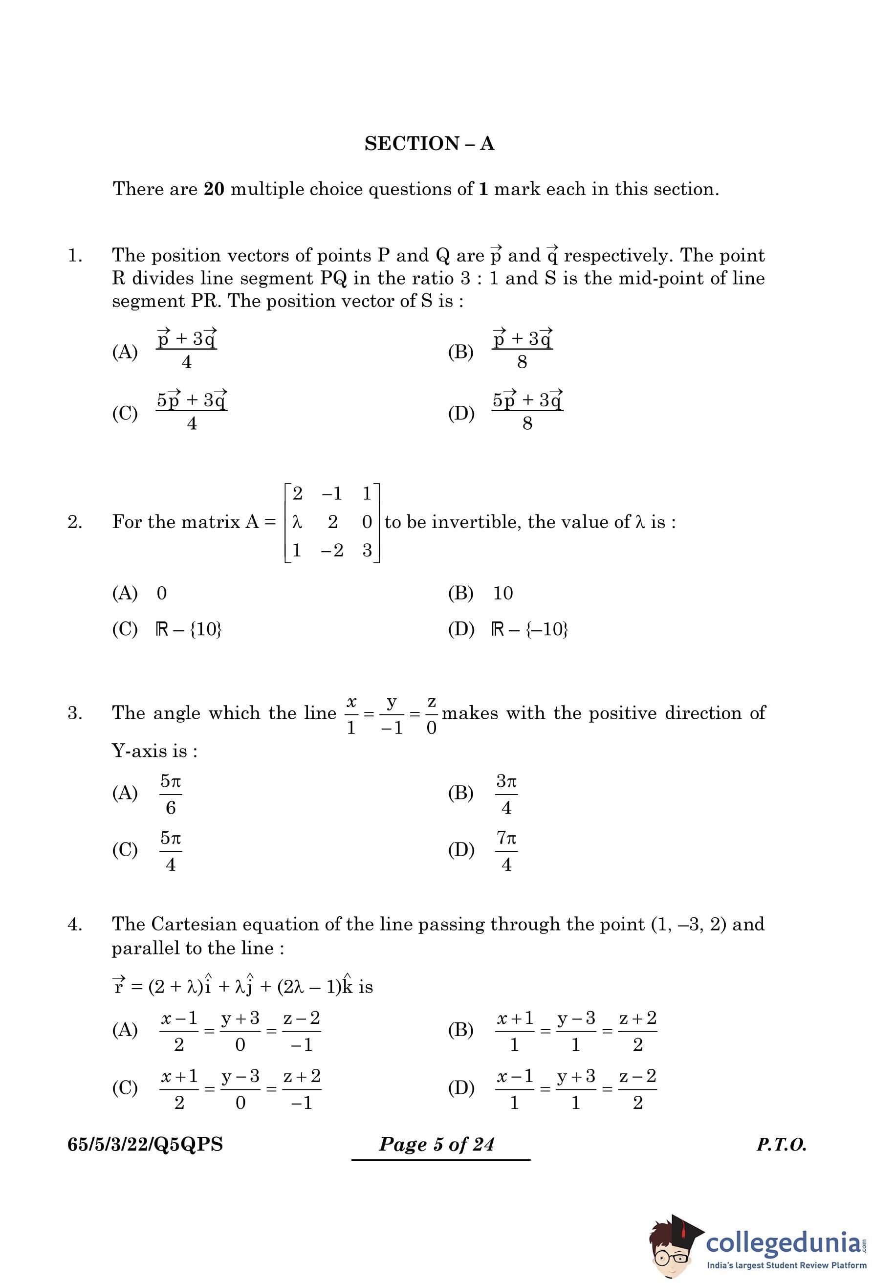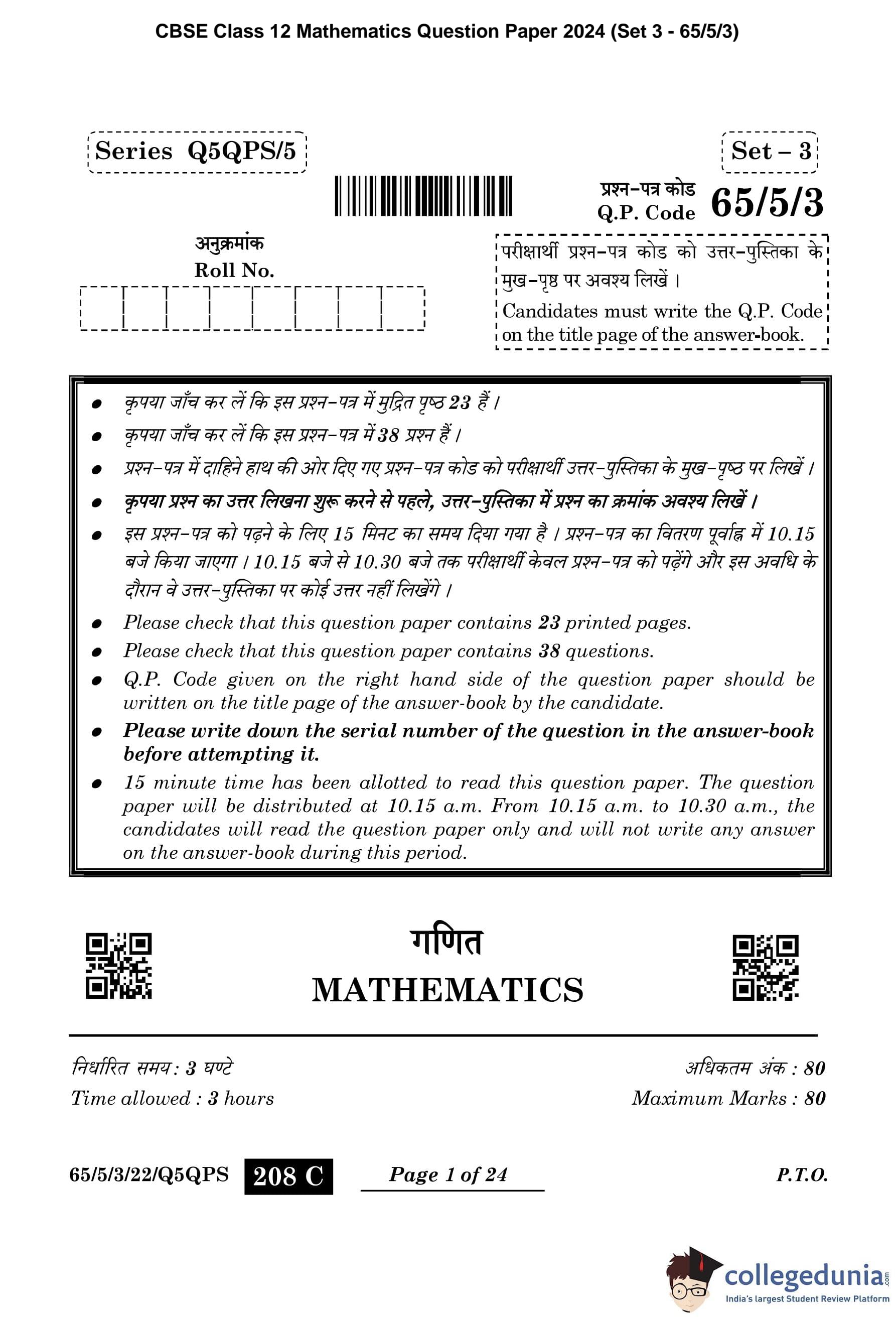 CBSE Class 12 Mathematics Question Paper 2024 PDF (Set 3- 65/5/3) is available for download here. CBSE conducted the Mathematics exam on March 9, 2024 from 10:30 AM to 1:30 PM. The total marks for the theory paper are 80. The question paper contains 20% MCQ-based questions, 40% competency-based questions, and 40% short and long answer type questions.