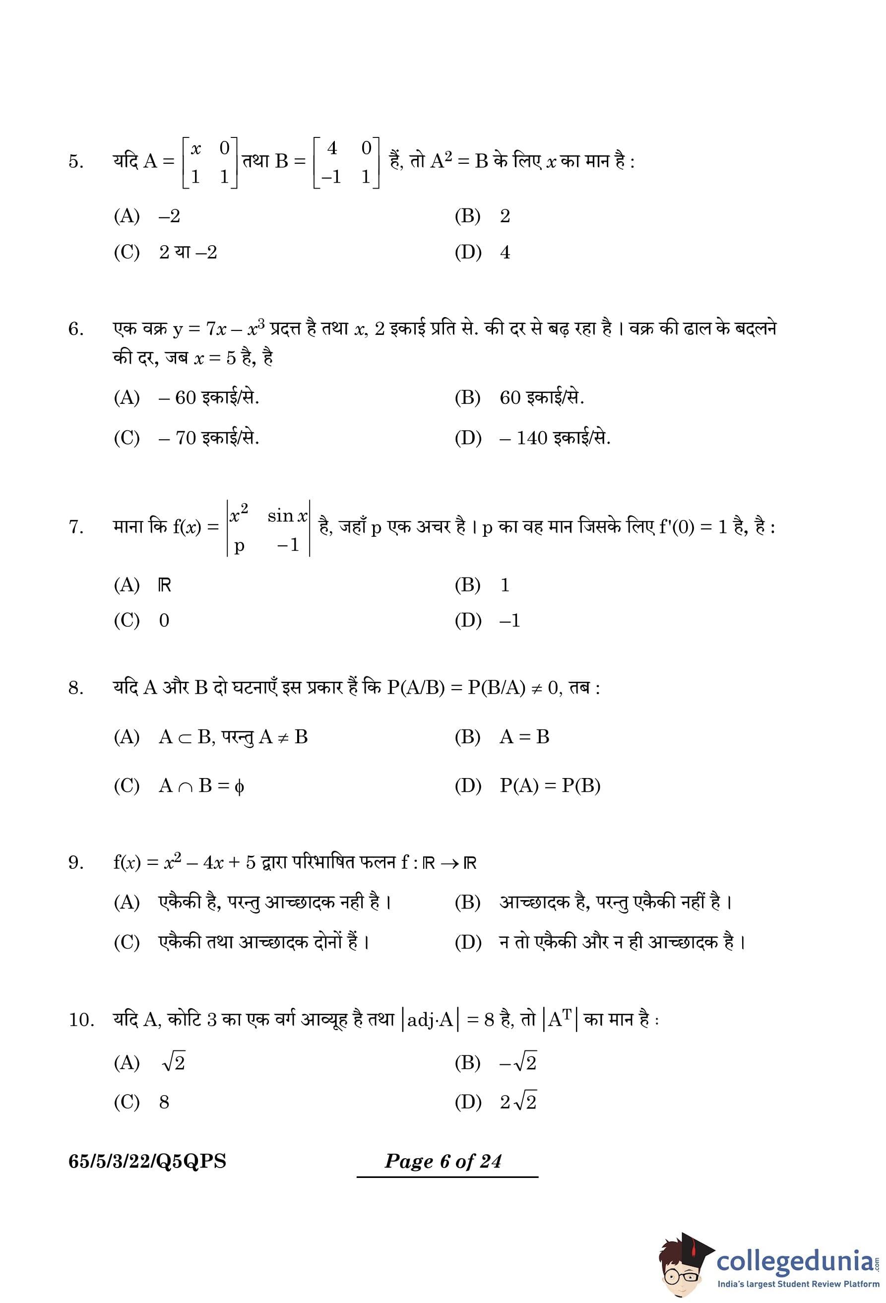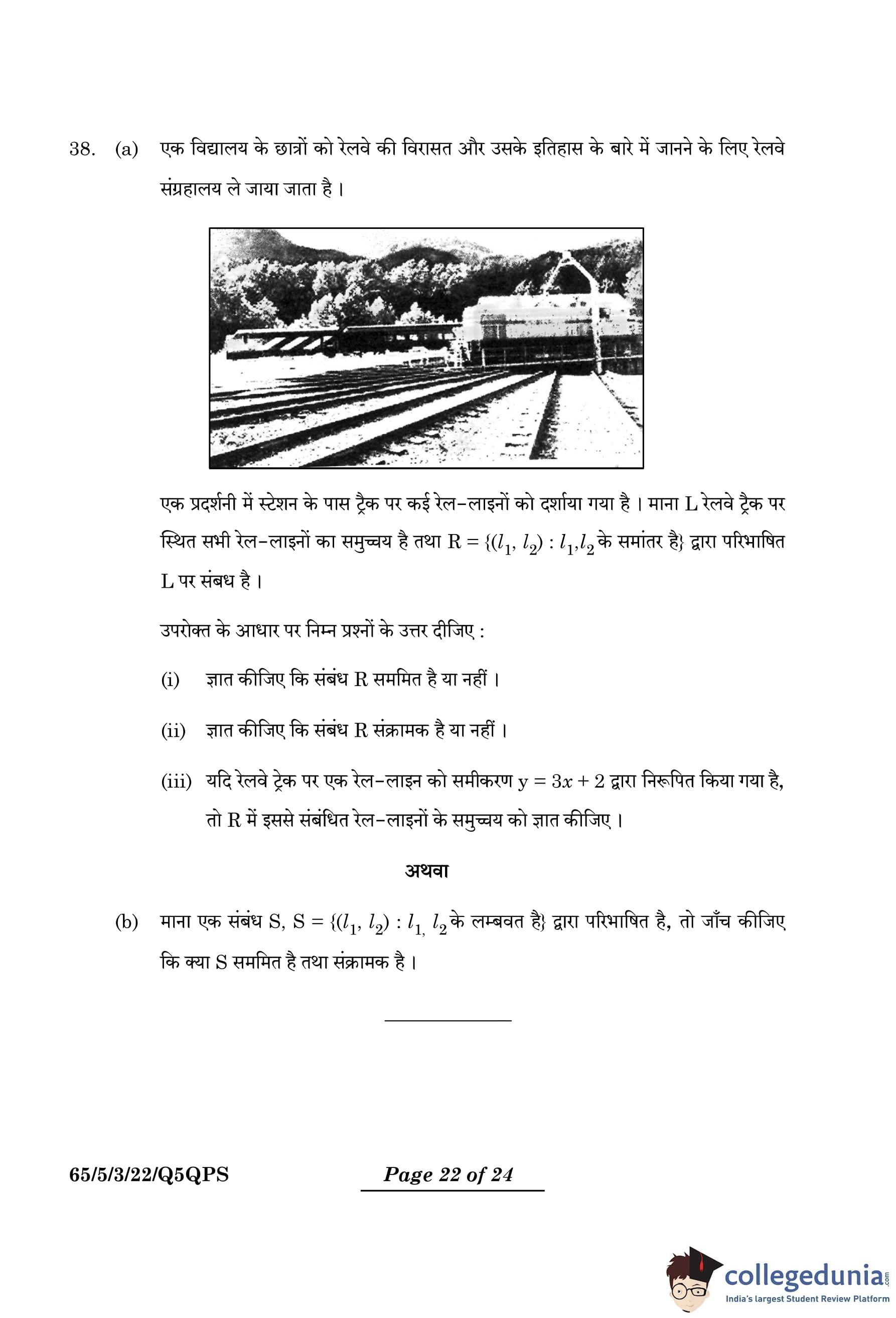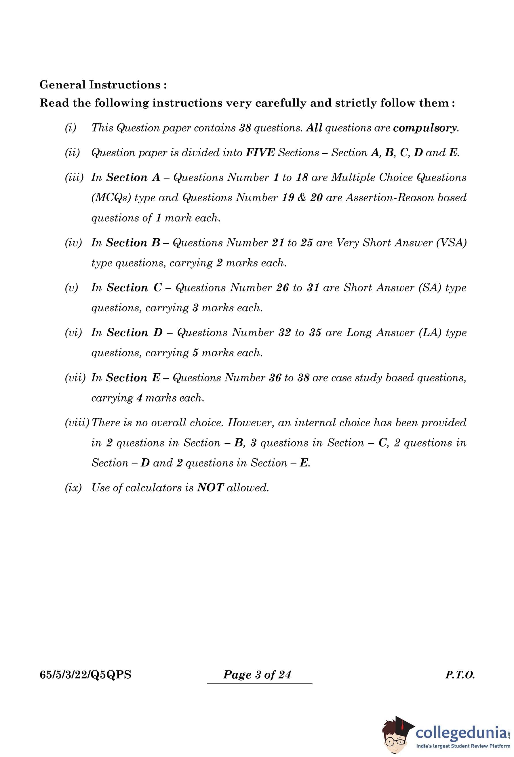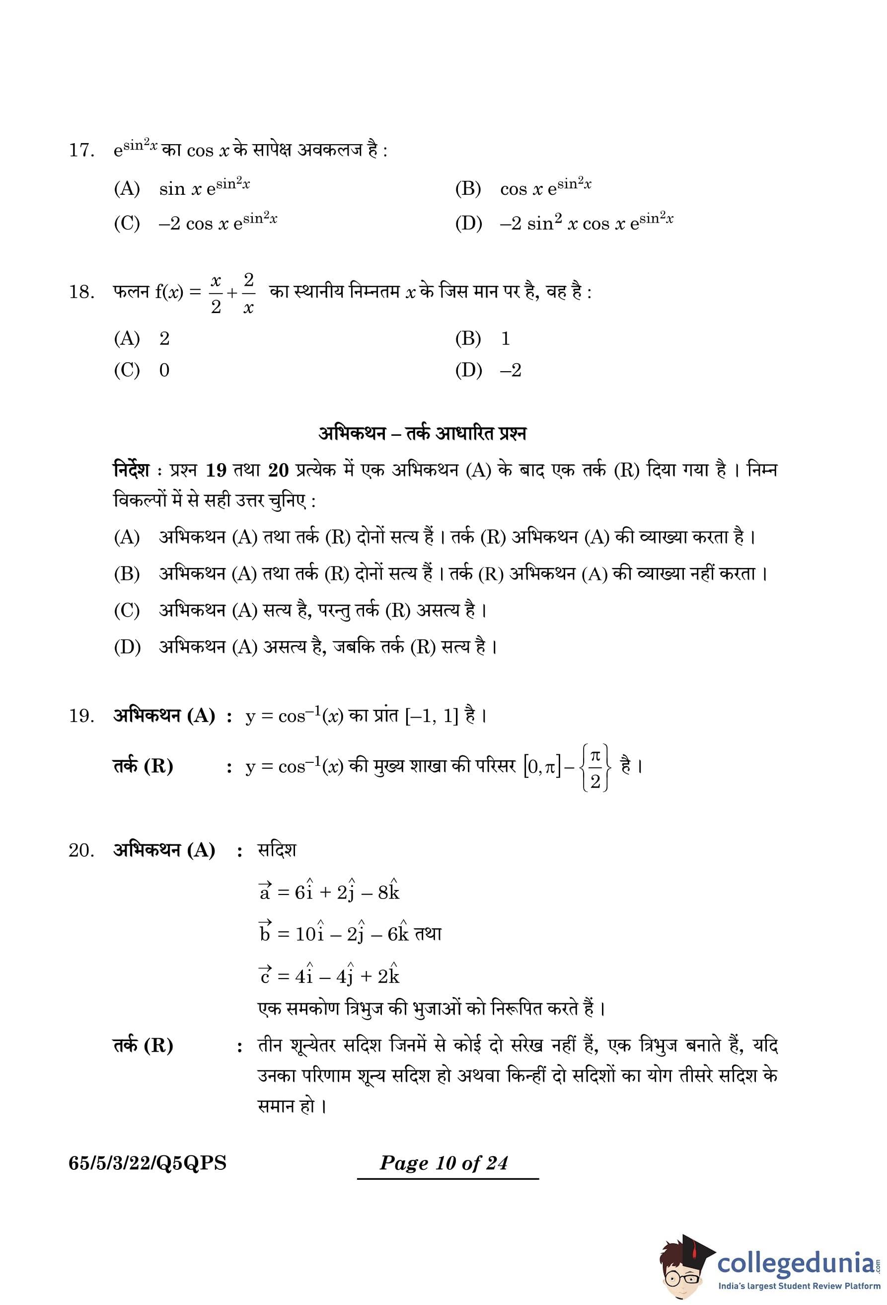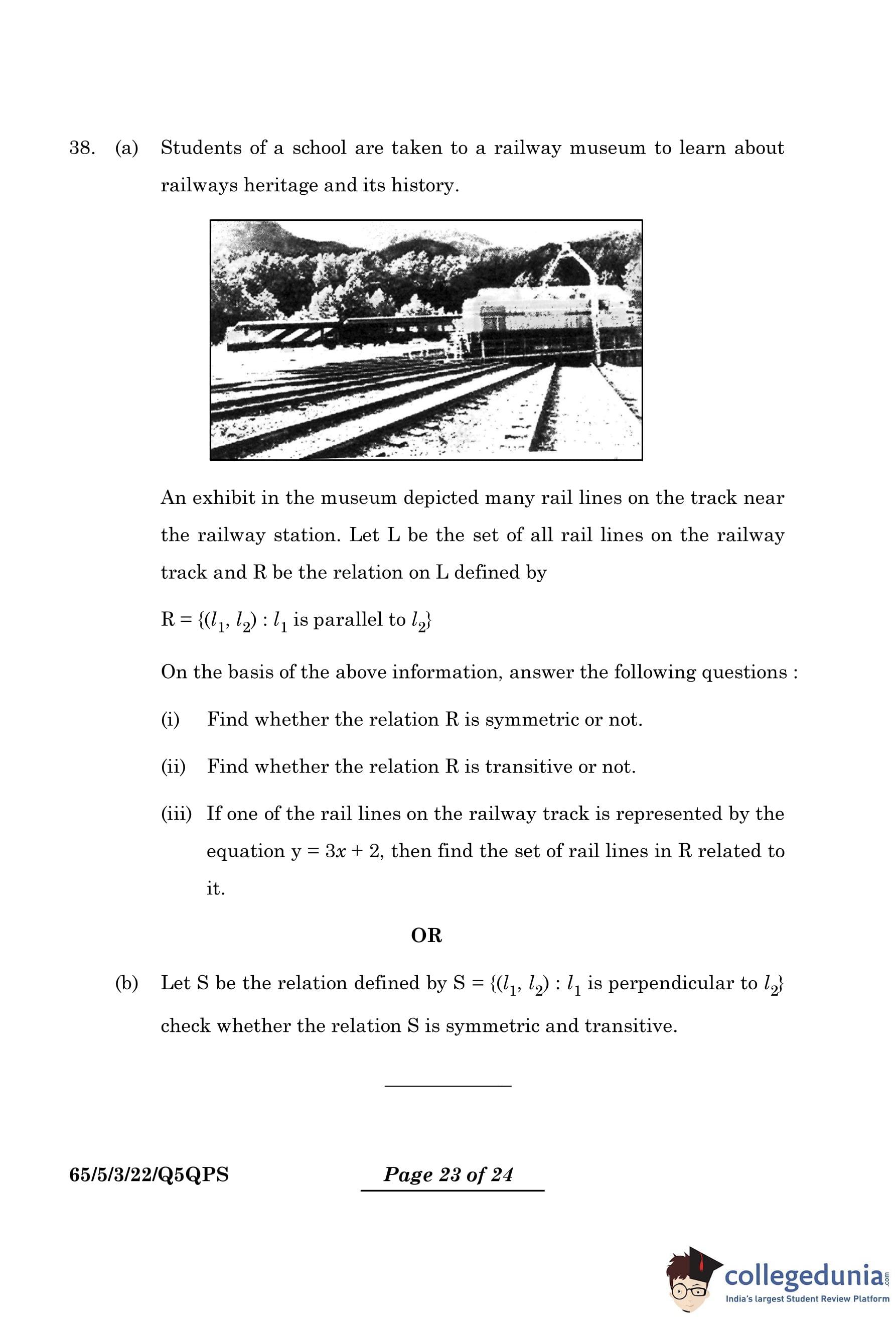 CBSE Class 12 Mathematics Question Paper 2024 PDF (Set 3- 65/5/3) is available for download here. CBSE conducted the Mathematics exam on March 9, 2024 from 10:30 AM to 1:30 PM. The total marks for the theory paper are 80. The question paper contains 20% MCQ-based questions, 40% competency-based questions, and 40% short and long answer type questions.