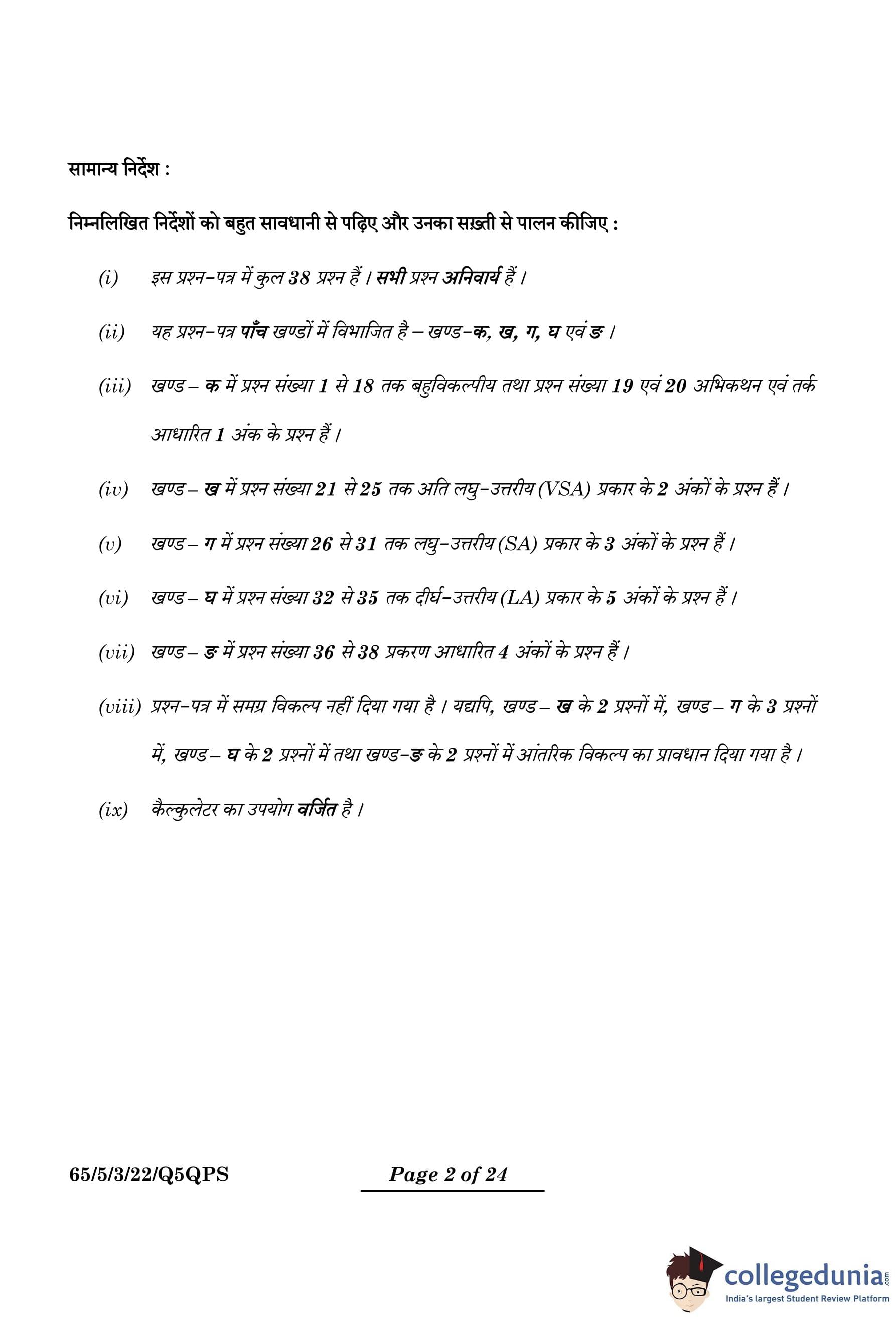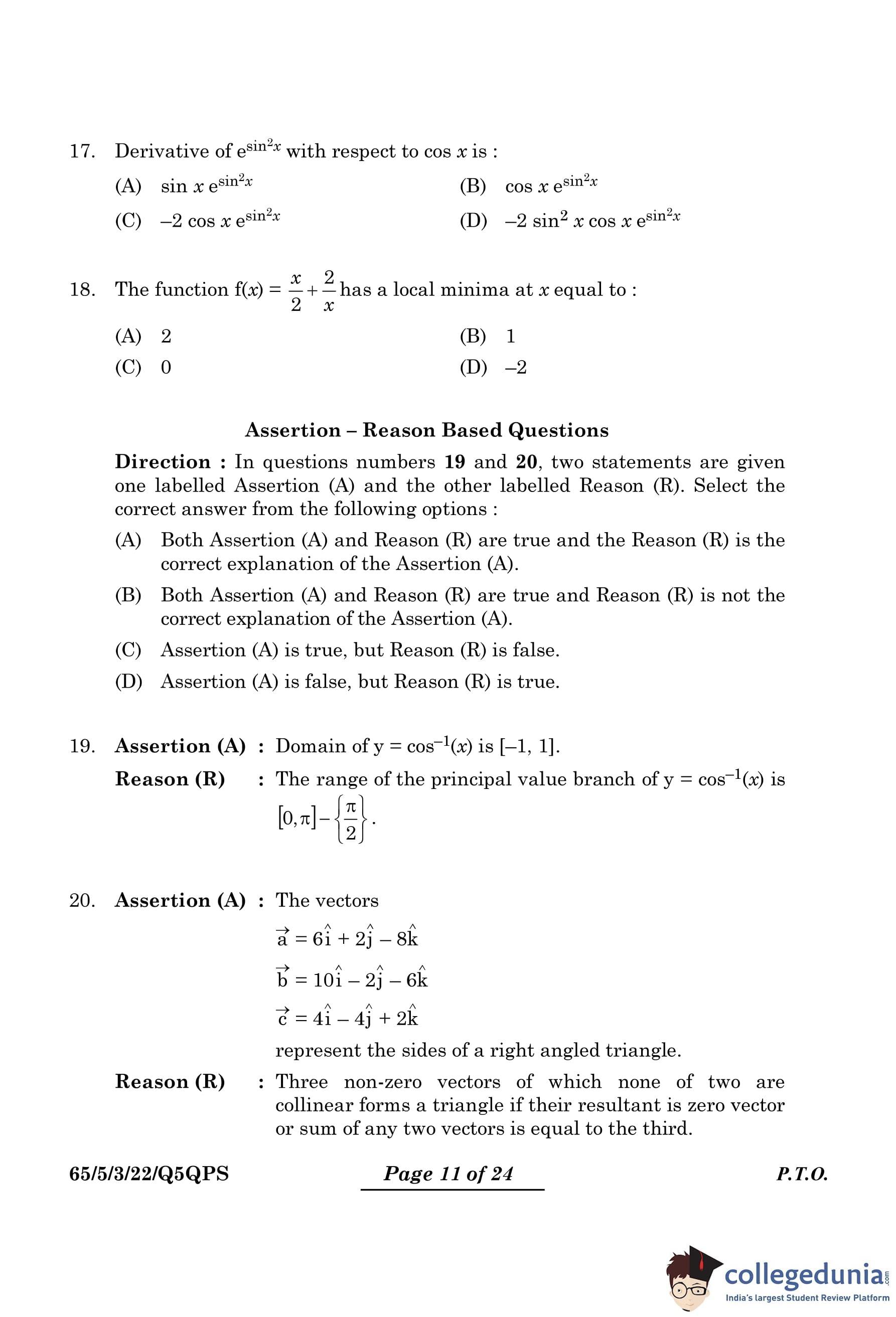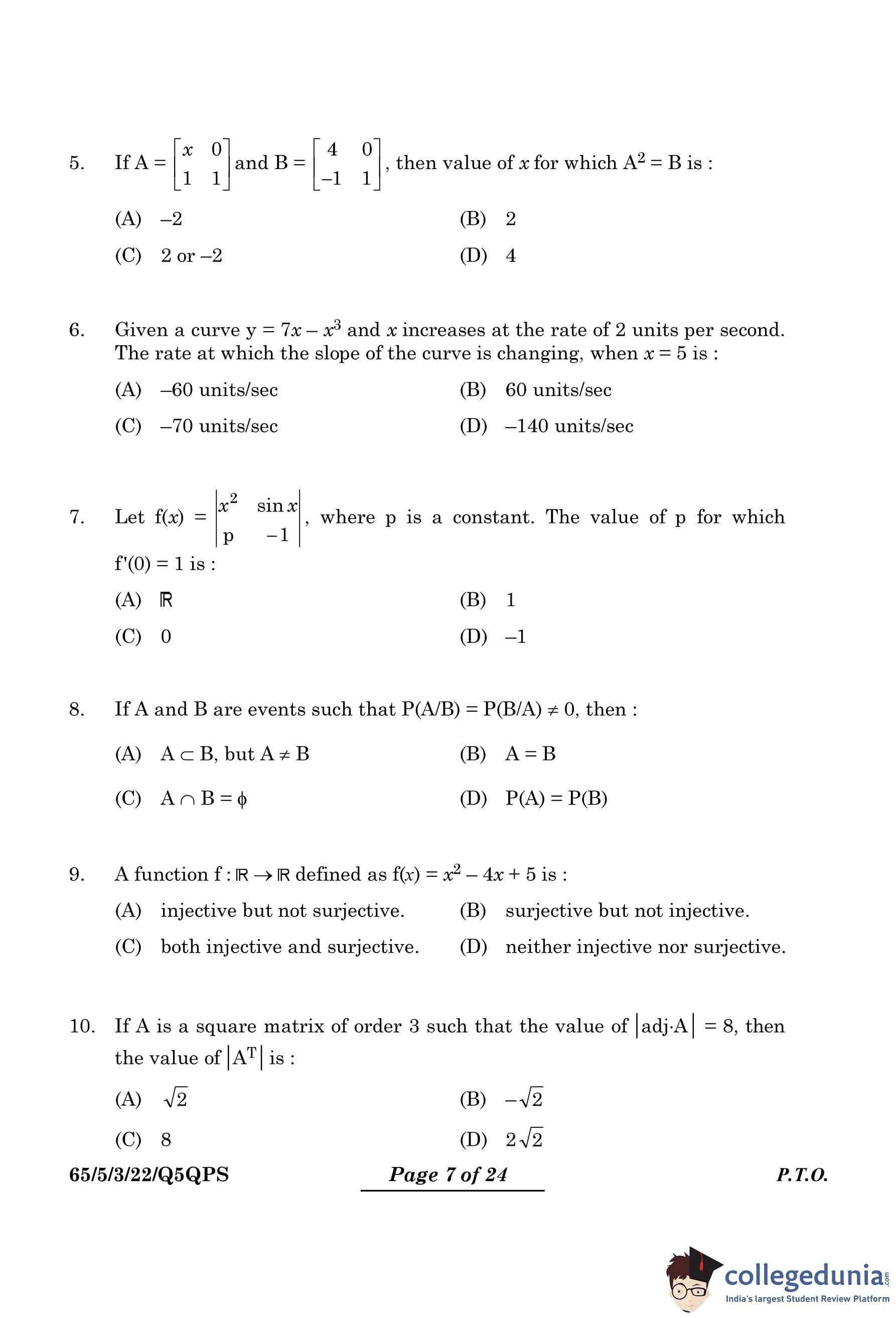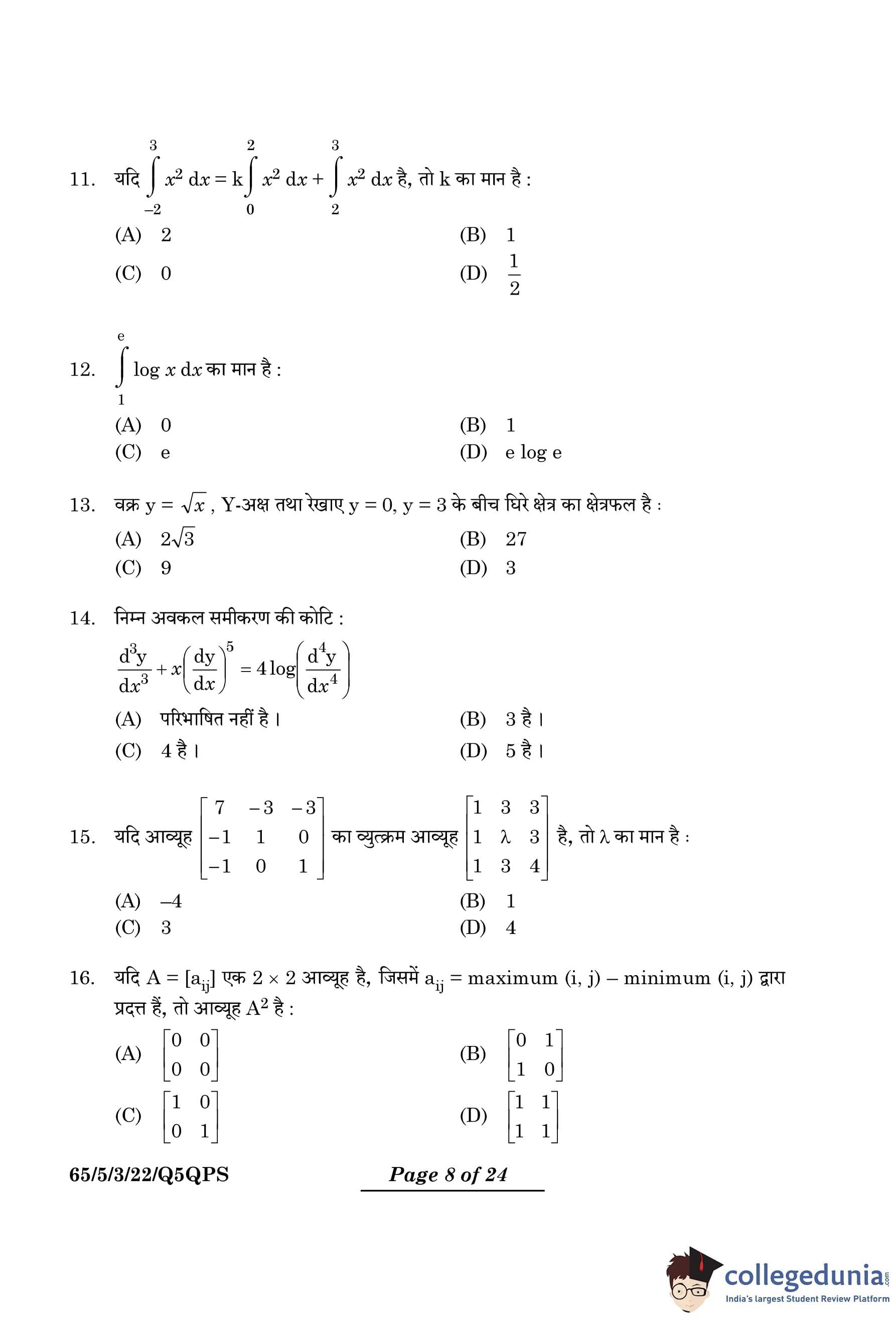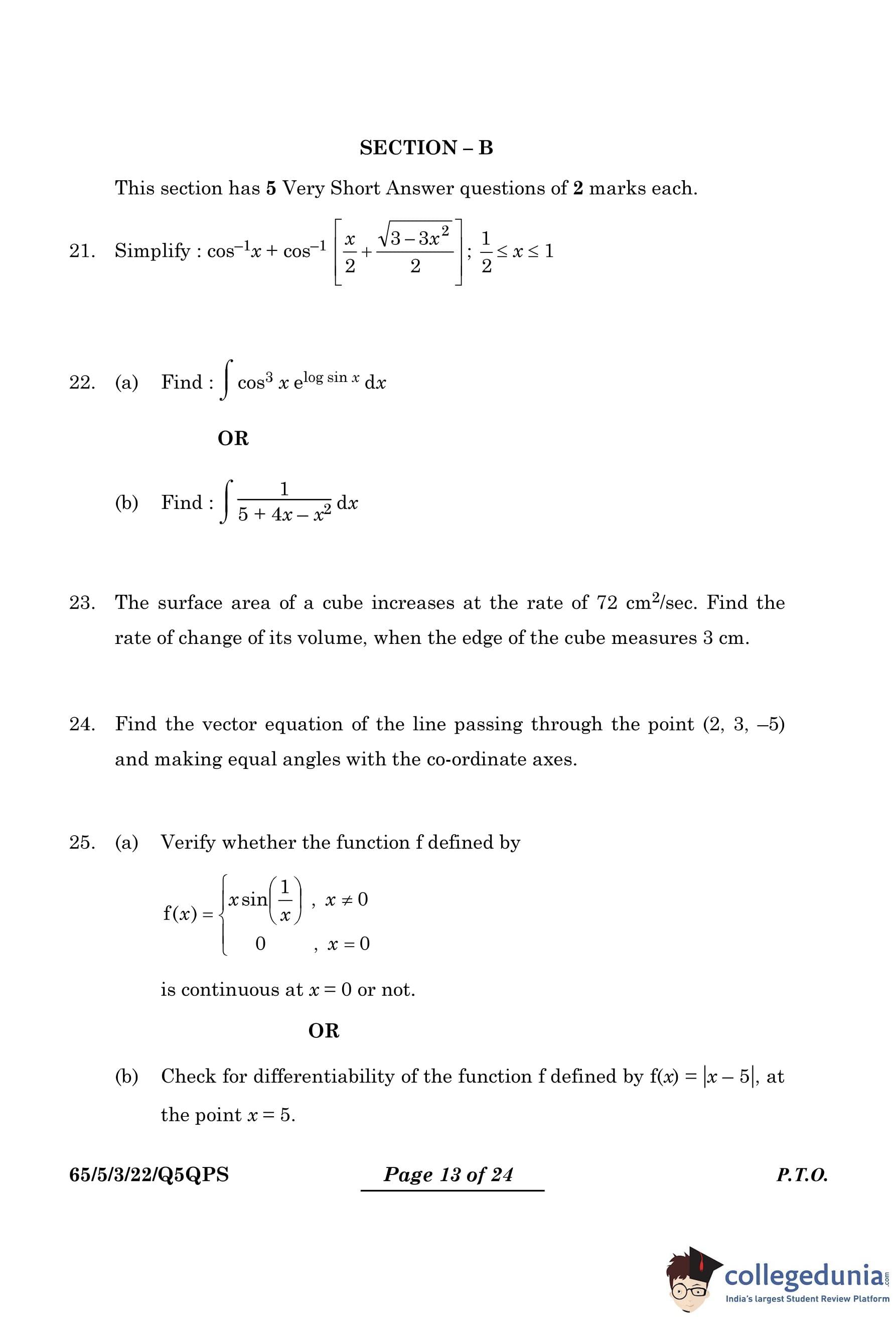 CBSE Class 12 Mathematics Question Paper 2024 PDF (Set 3- 65/5/3) is available for download here. CBSE conducted the Mathematics exam on March 9, 2024 from 10:30 AM to 1:30 PM. The total marks for the theory paper are 80. The question paper contains 20% MCQ-based questions, 40% competency-based questions, and 40% short and long answer type questions.