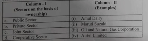 Hence, the correct option is (C). Quick Tip: \textbf{Examples to remember:} ONGC – Public Sector, Airtel – Private Sector, Maruti Suzuki – Joint Sector, Amul – Cooperative Sector.