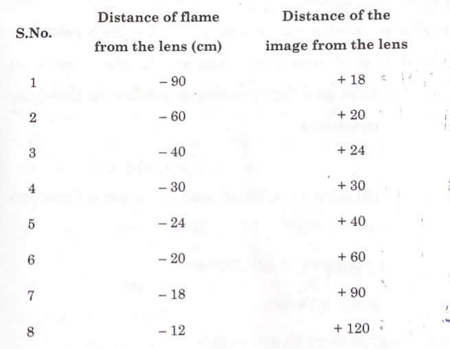 A student placed a candle flame at different distances from a convex lens and focused its image on a screen. He recorded his observation in tabular form as given below:
