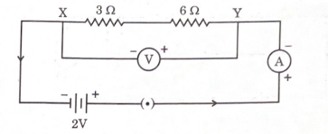Study the circuit shown in which two resistors X and Y of resistances 3 Ω and 6 Ω respectively are joined in series, with a battery of 2 V