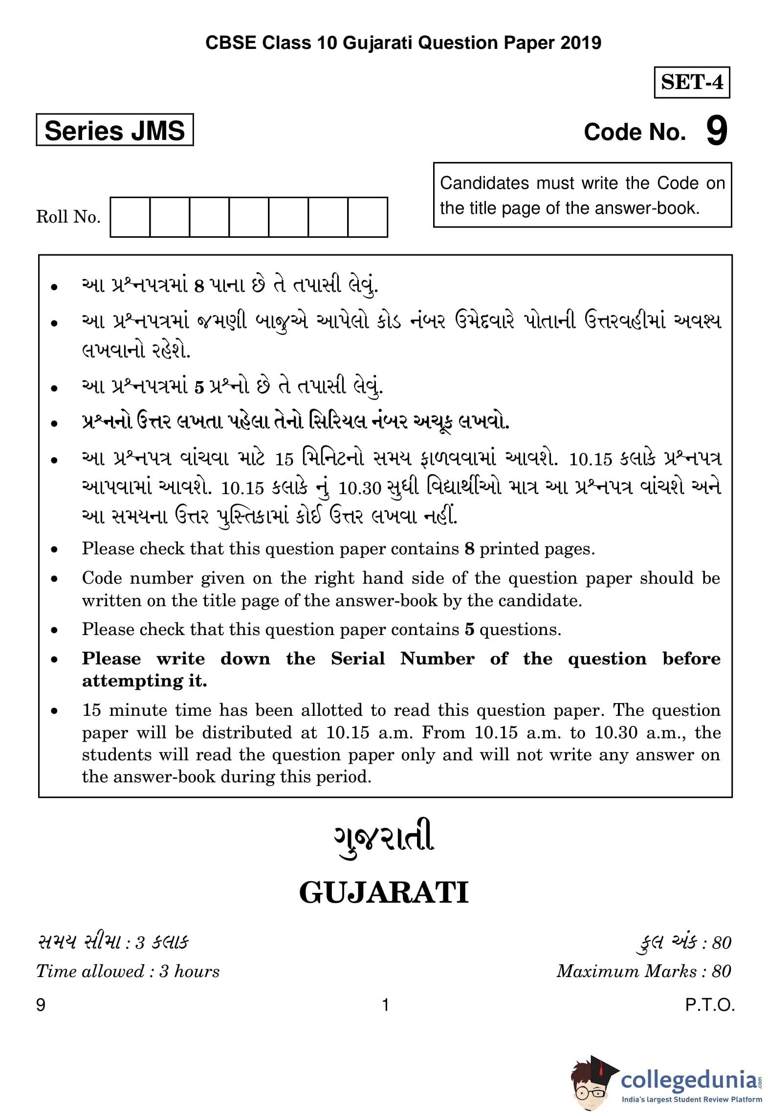 CBSE Class 10 Gujarati Question Paper 2019 with Answer Key Set 4 is available for download. The exam was conducted by the Central Board of Secondary Education on March 5, 2019 in the Morning Session 10:30 AM to 1:30 PM. The medium of paper was Gujarati. The question paper comprised a total of 5 questions divided among 4 sections.