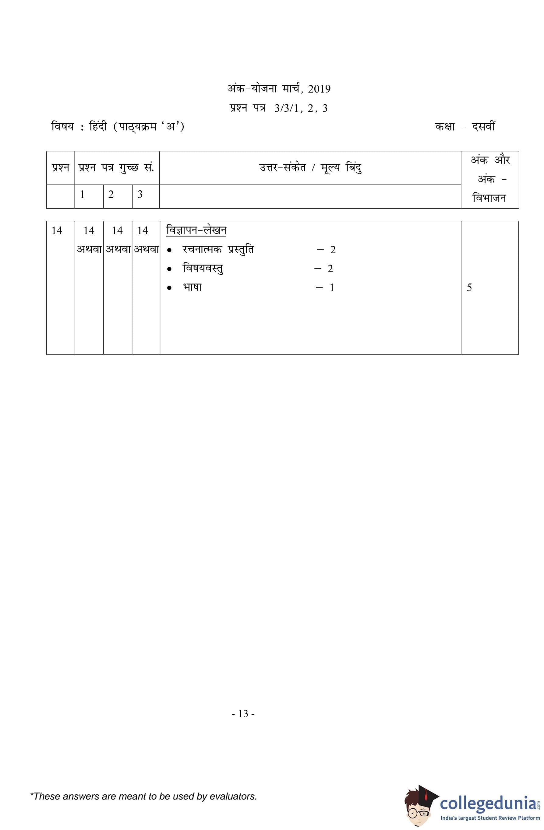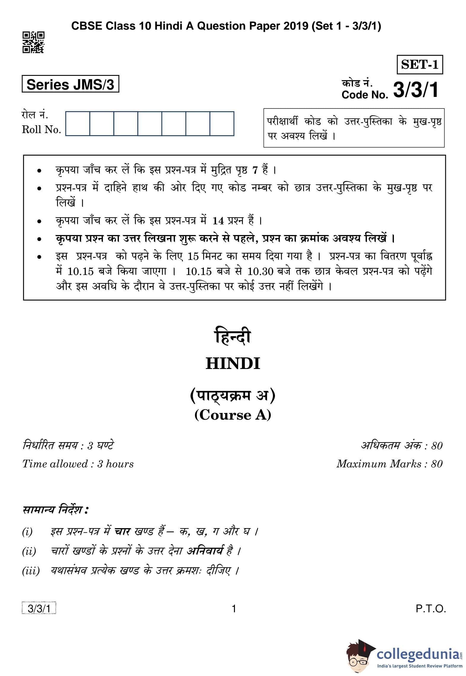 CBSE Class 10 Hindi A Question Paper 2019 with Answer Key Set 1 - 3/3/1 is available for download. The exam was conducted by the Central Board of Secondary Education on March 19, 2019 in the Morning Session 10:30 AM to 1:30 PM. The medium of paper was Hindi. The question paper comprised a total of 14 questions divided among 4 sections.