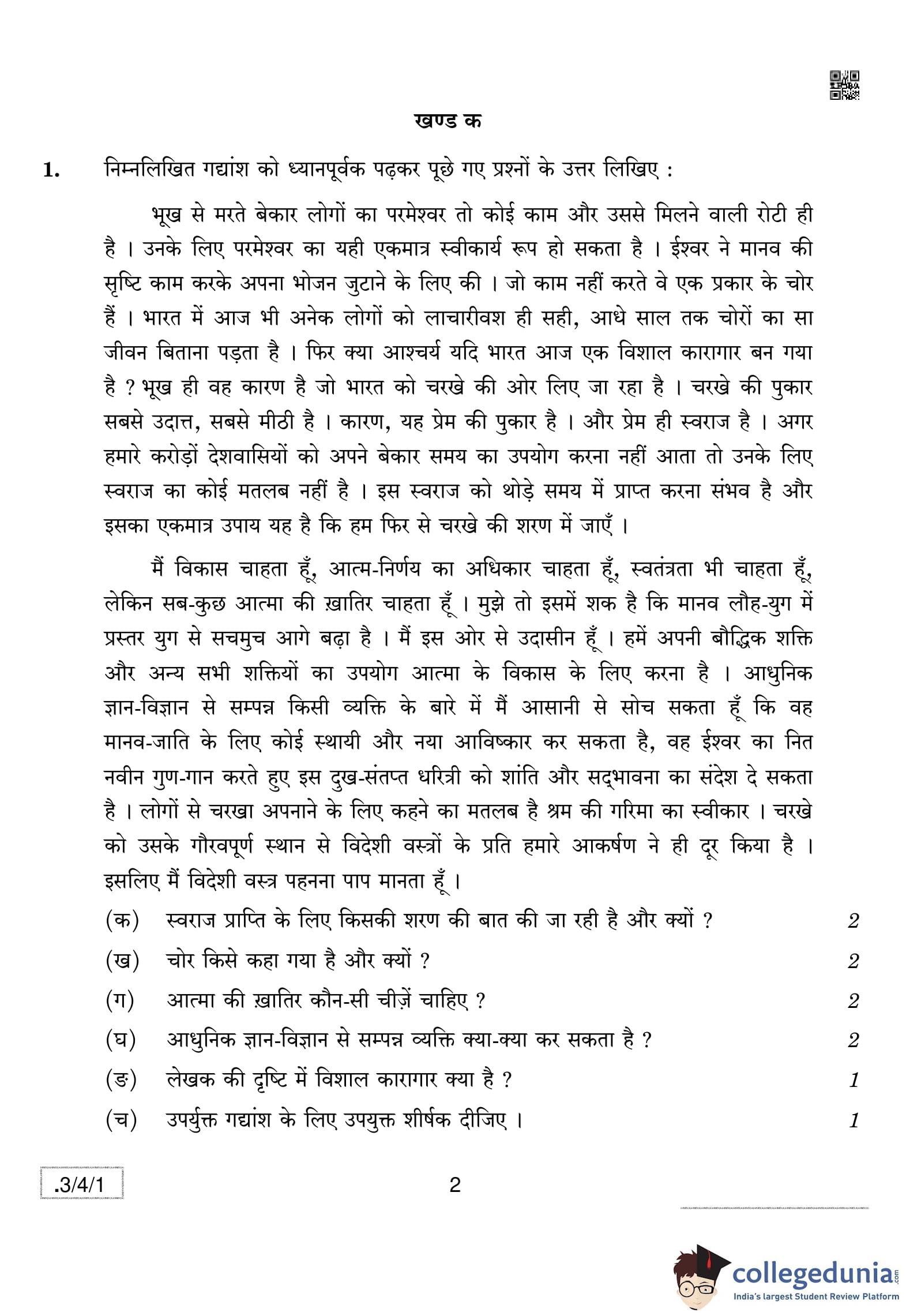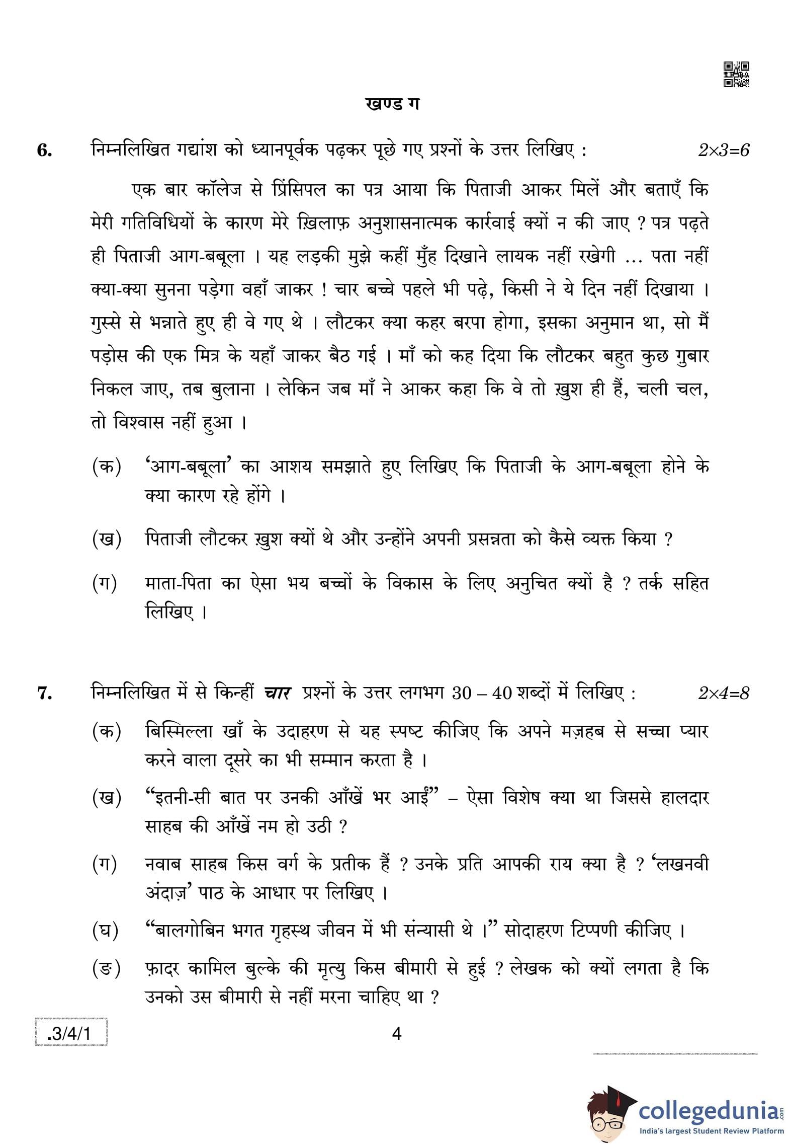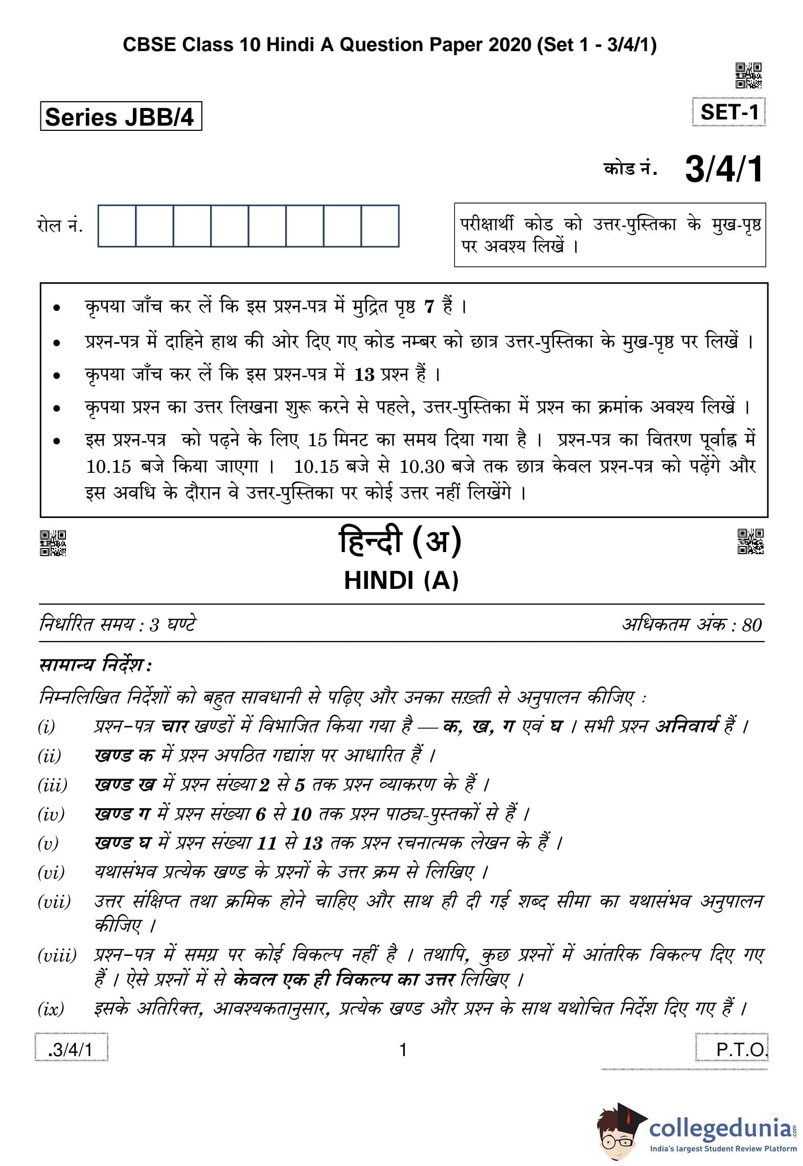 CBSE Class 10 Hindi A Question Paper 2020 with Answer Key Set 1 - 3/4/1 is available for download. The exam was conducted by the Central Board of Secondary Education on February 29, 2020 in the Morning Session 10:30 AM to 1:30 PM. The medium of paper was Hindi. The question paper comprised a total of 13 questions divided among 4 sections.