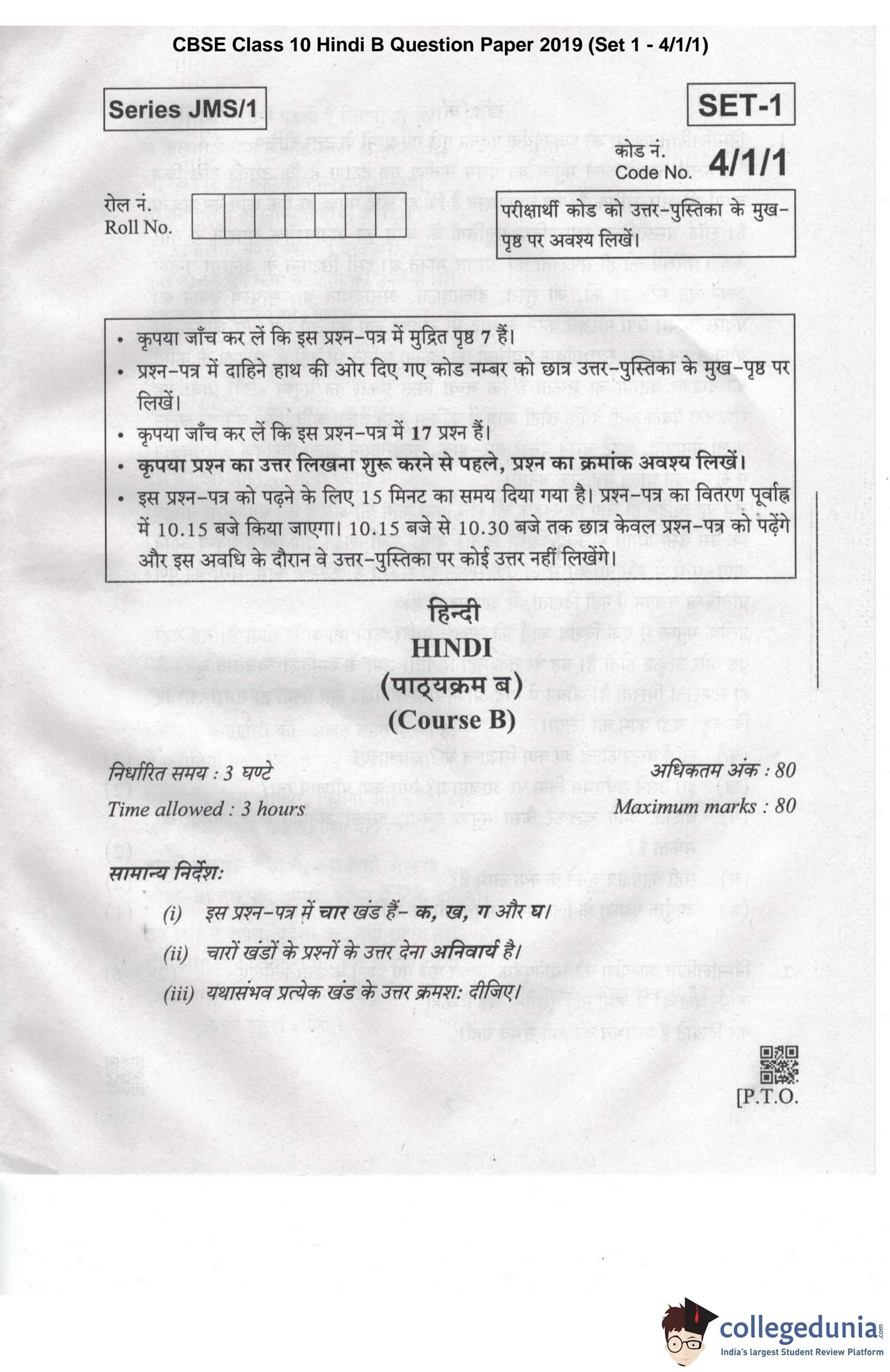 CBSE Class 10 Hindi B Question Paper 2019 with Answer Key Set 1 - 4/1/1 is available for download. The exam was conducted by the Central Board of Secondary Education on March 19, 2019 in the Morning Session 10:30 AM to 1:30 PM. The medium of paper was Hindi. The question paper comprised a total of 17 questions divided among 4 sections.