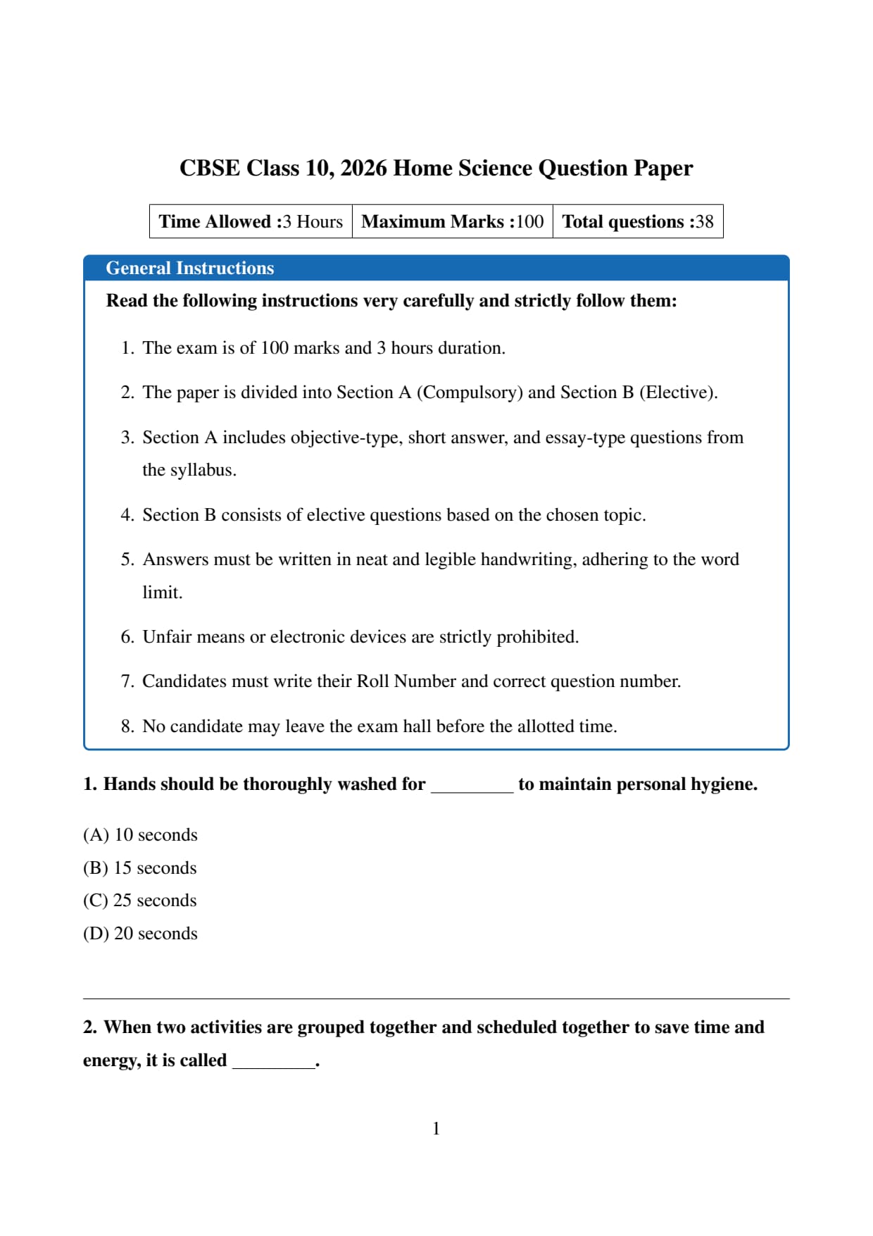 The official question paper of CBSE Class 10 Home Science Board Exam 2026 is provided below. Students can download the official paper in PDF format for reference.