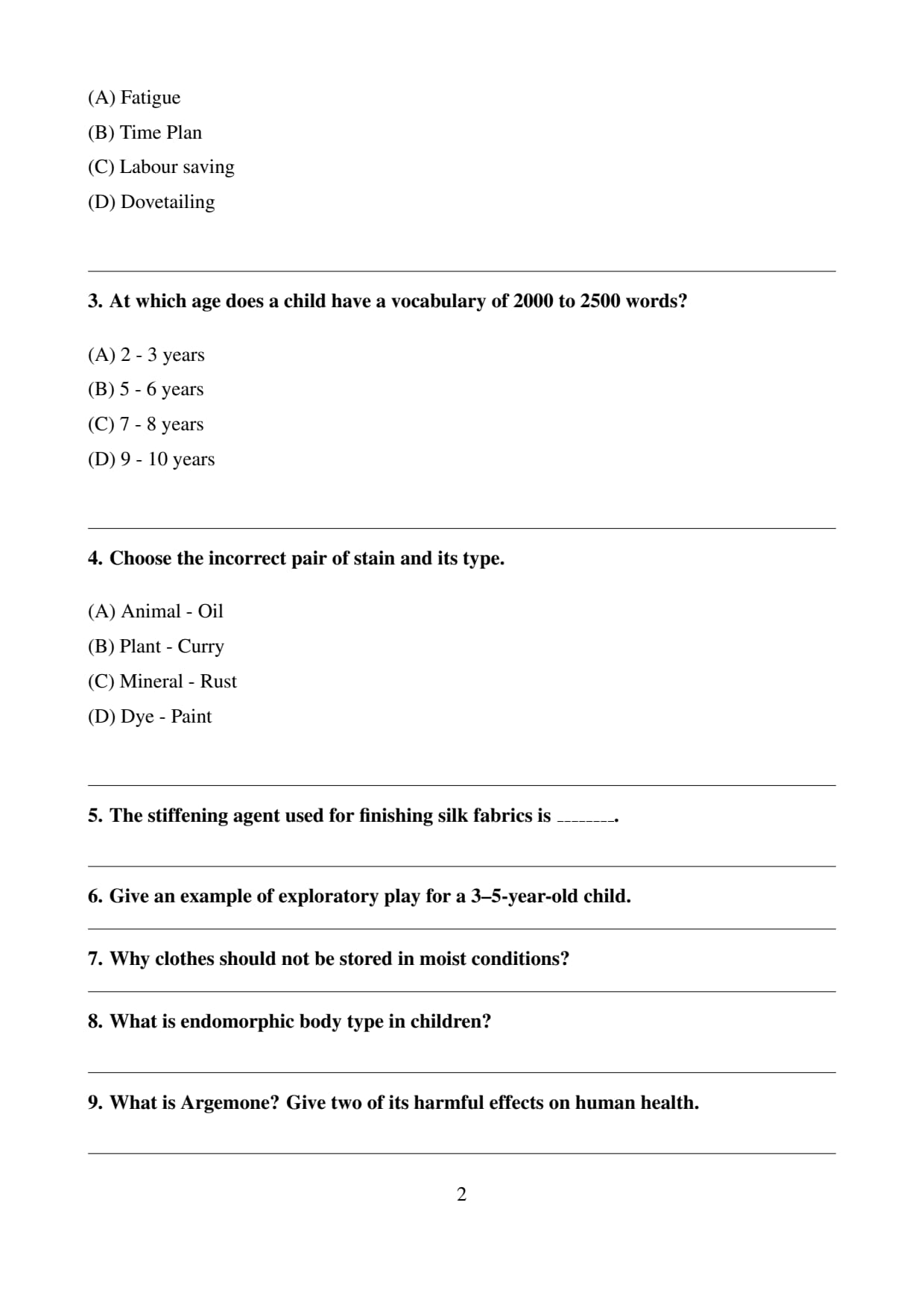 Final Answer: \[ \boxed{(B) \, 5 - 6 years} \] Quick Tip: By the age of 5-6 years, a child’s vocabulary typically includes 2000 to 2500 words. Encourage language development through conversation and reading.