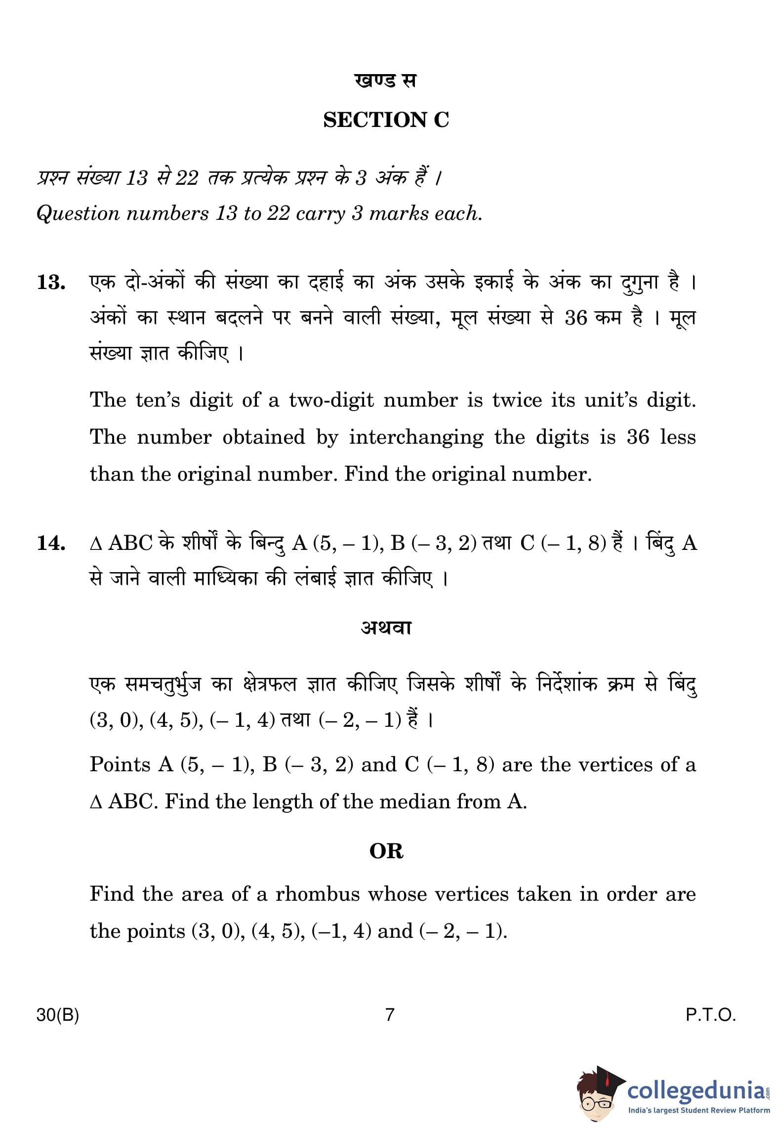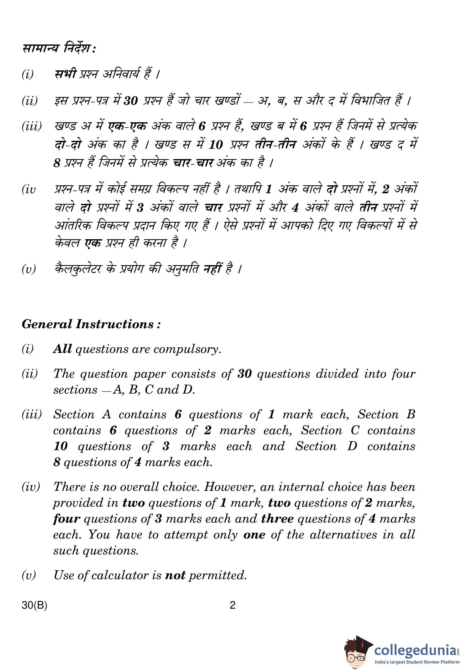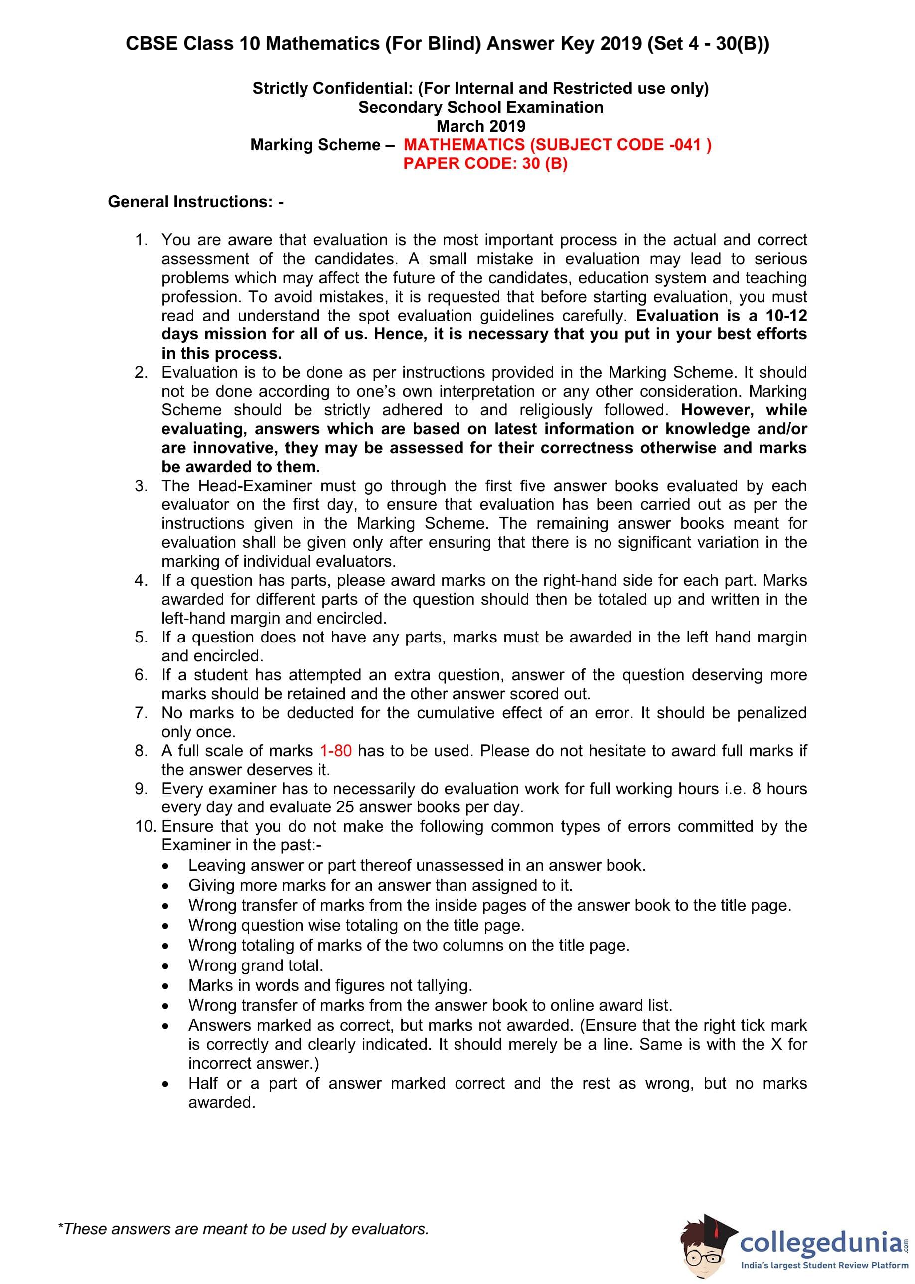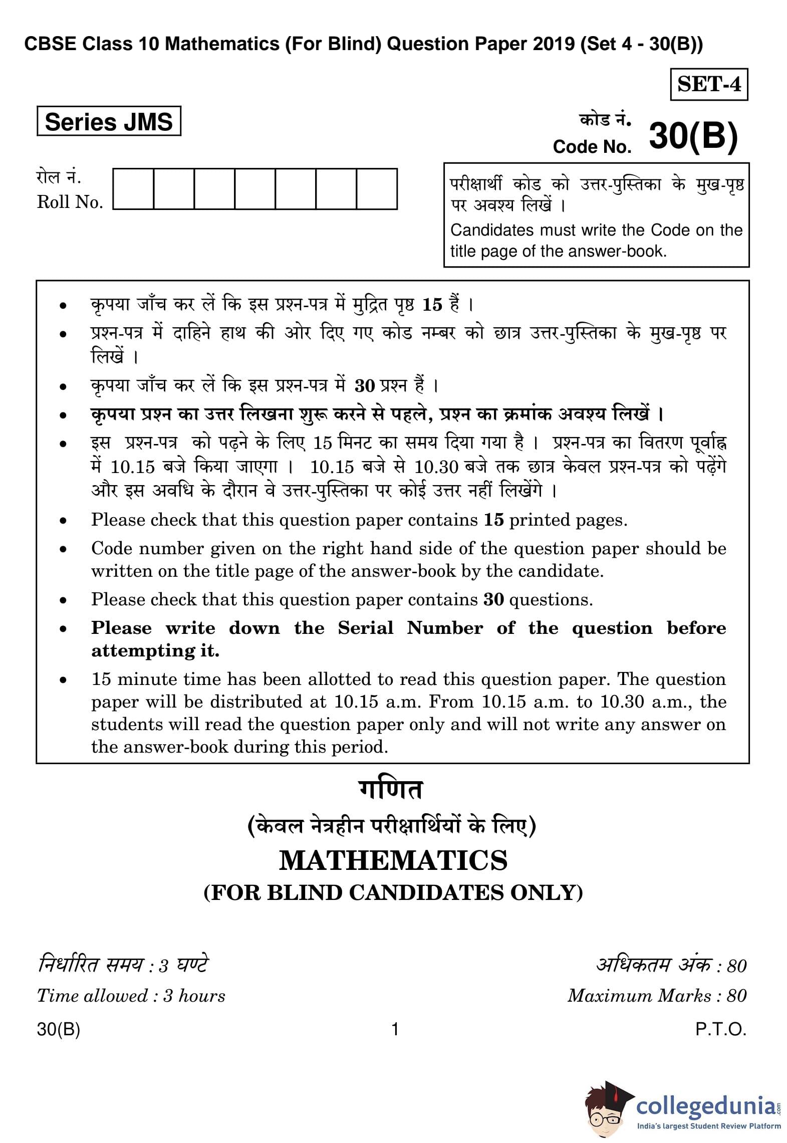 CBSE Class 10 Mathematics (For Blind) Question Paper 2019 with Answer Key Set 4 - 30(B) is available for download. The exam was conducted by the Central Board of Secondary Education on March 7, 2019 in the Morning Session 10:30 AM to 1:30 PM. The medium of paper was English and Hindi. The question paper comprised a total of 30 questions divided among 4 sections.