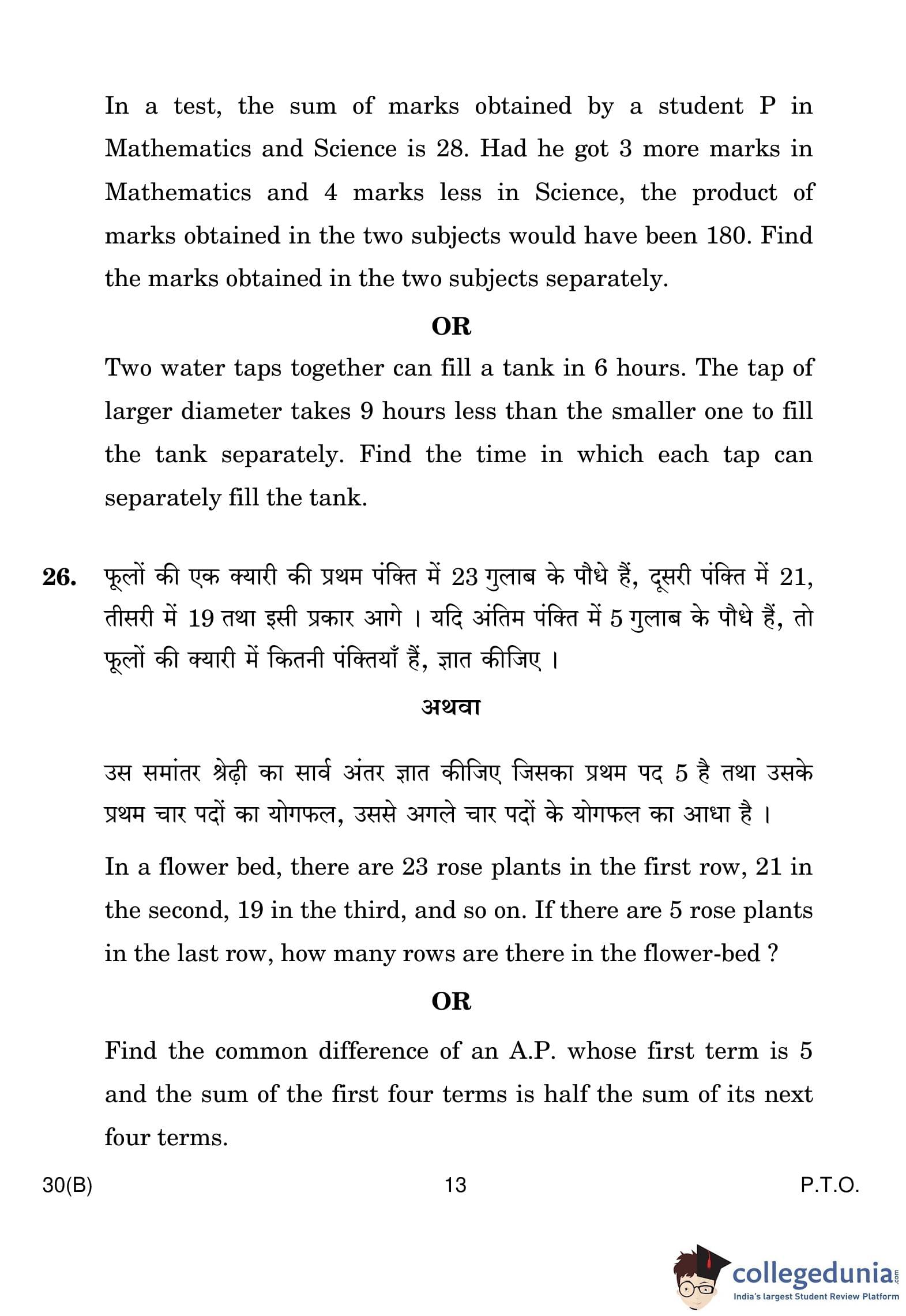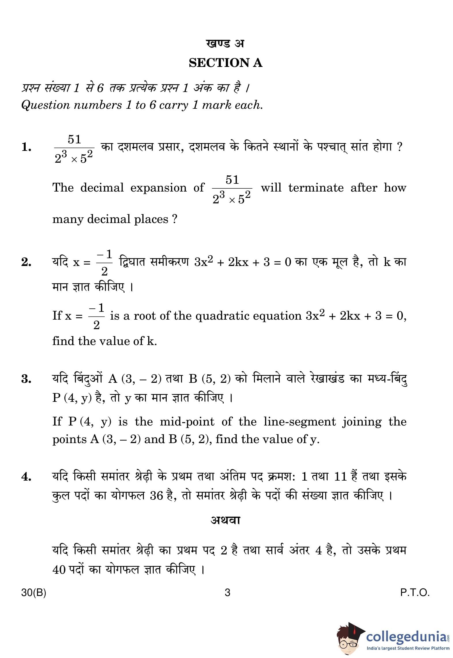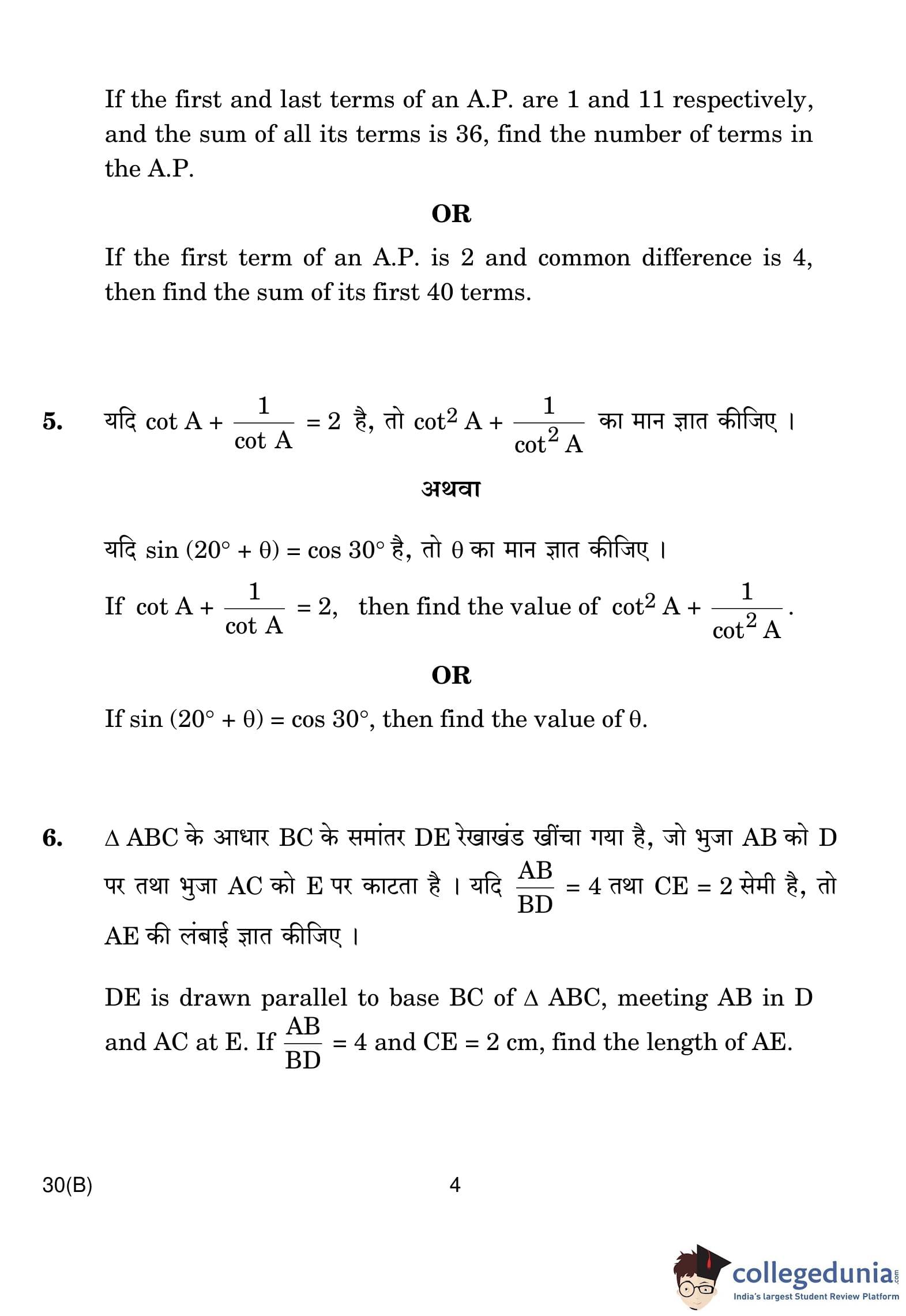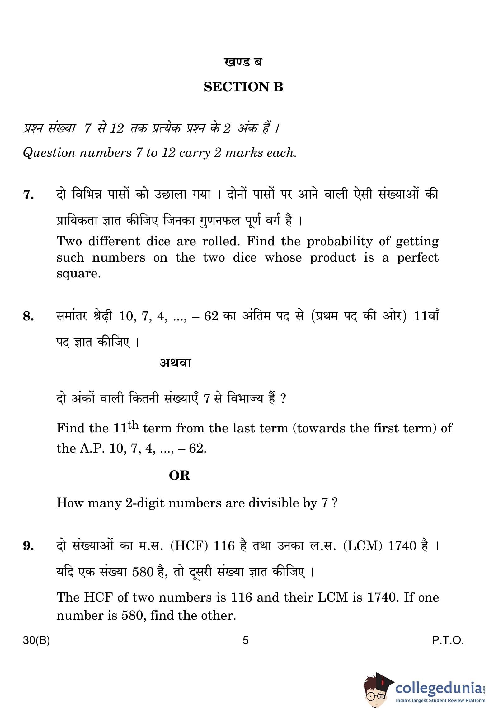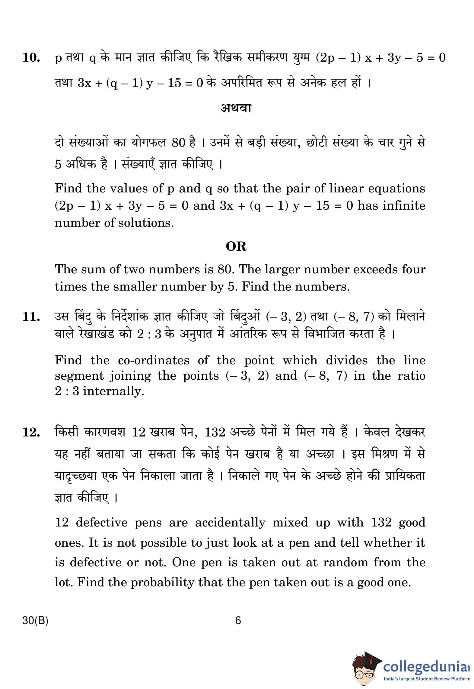 CBSE Class 10 Mathematics (For Blind) Question Paper 2019 with Answer Key Set 4 - 30(B) is available for download. The exam was conducted by the Central Board of Secondary Education on March 7, 2019 in the Morning Session 10:30 AM to 1:30 PM. The medium of paper was English and Hindi. The question paper comprised a total of 30 questions divided among 4 sections.