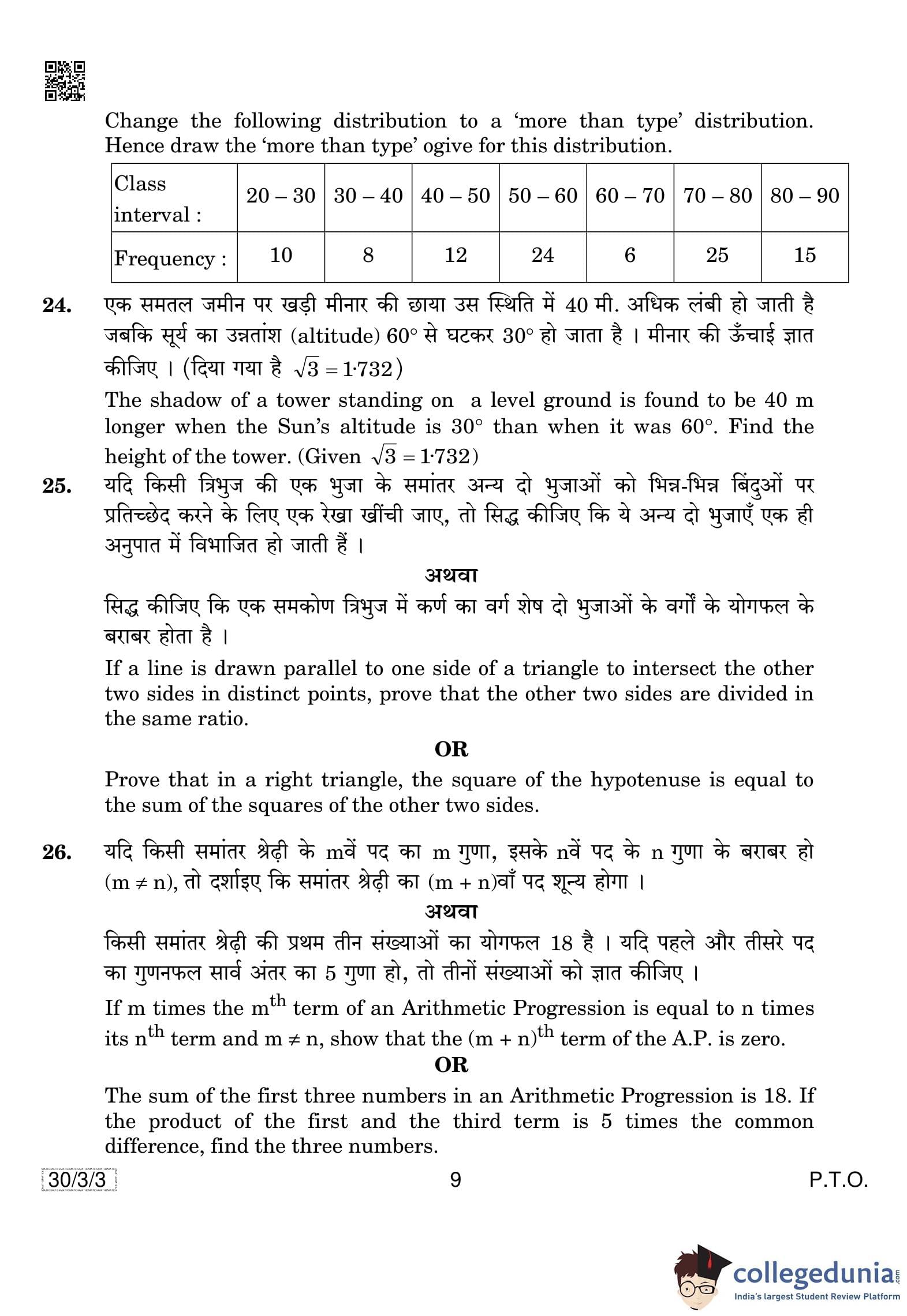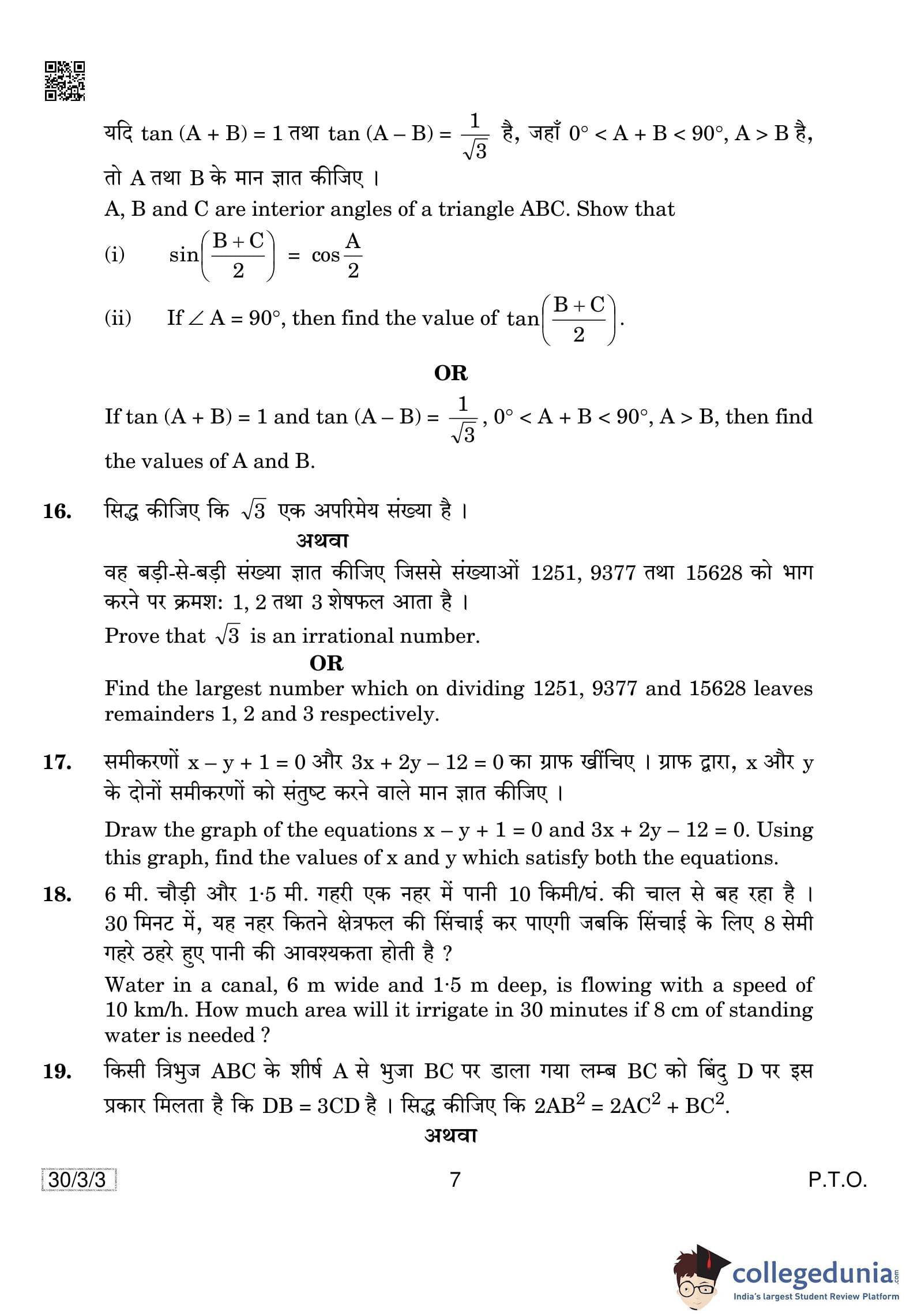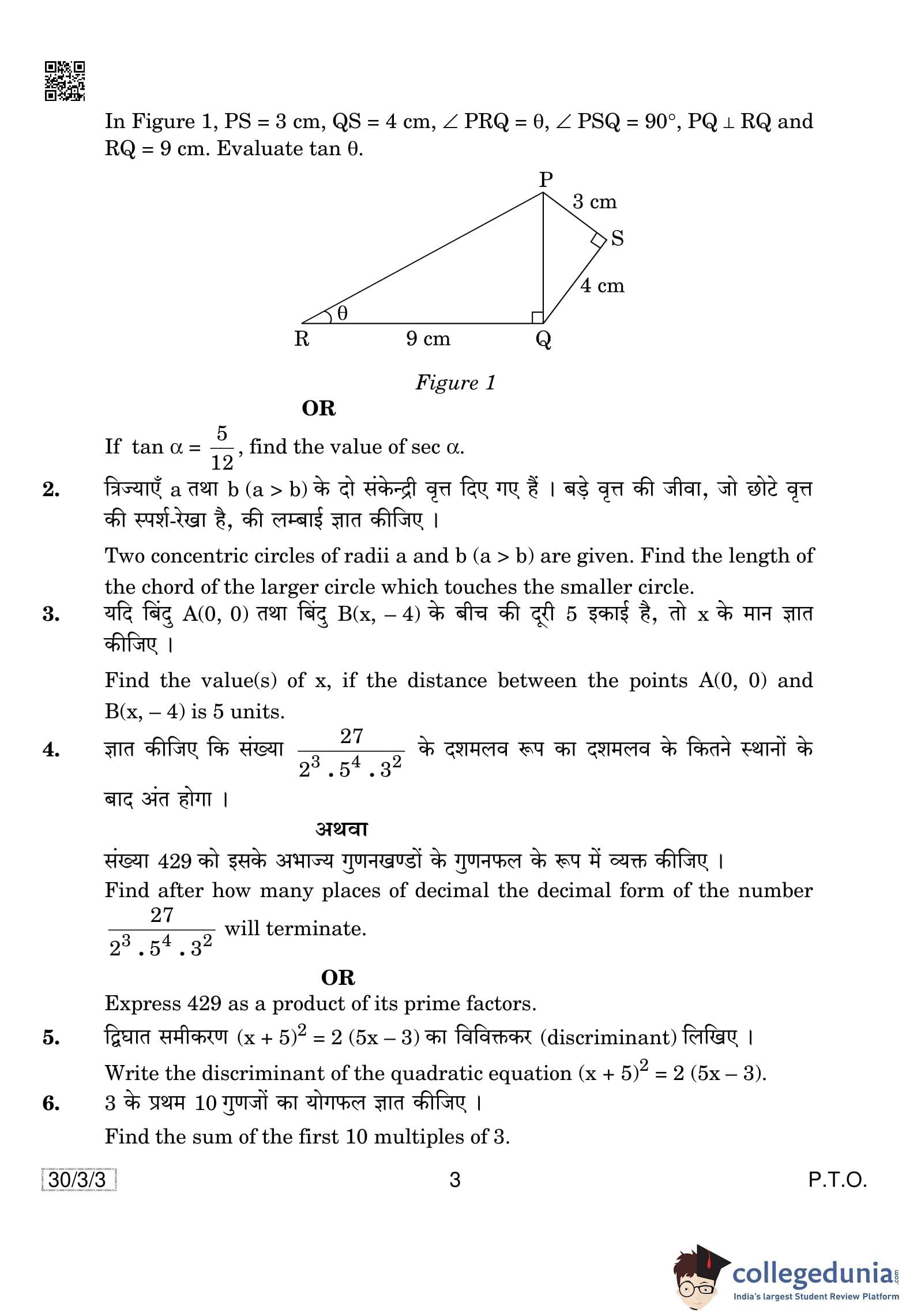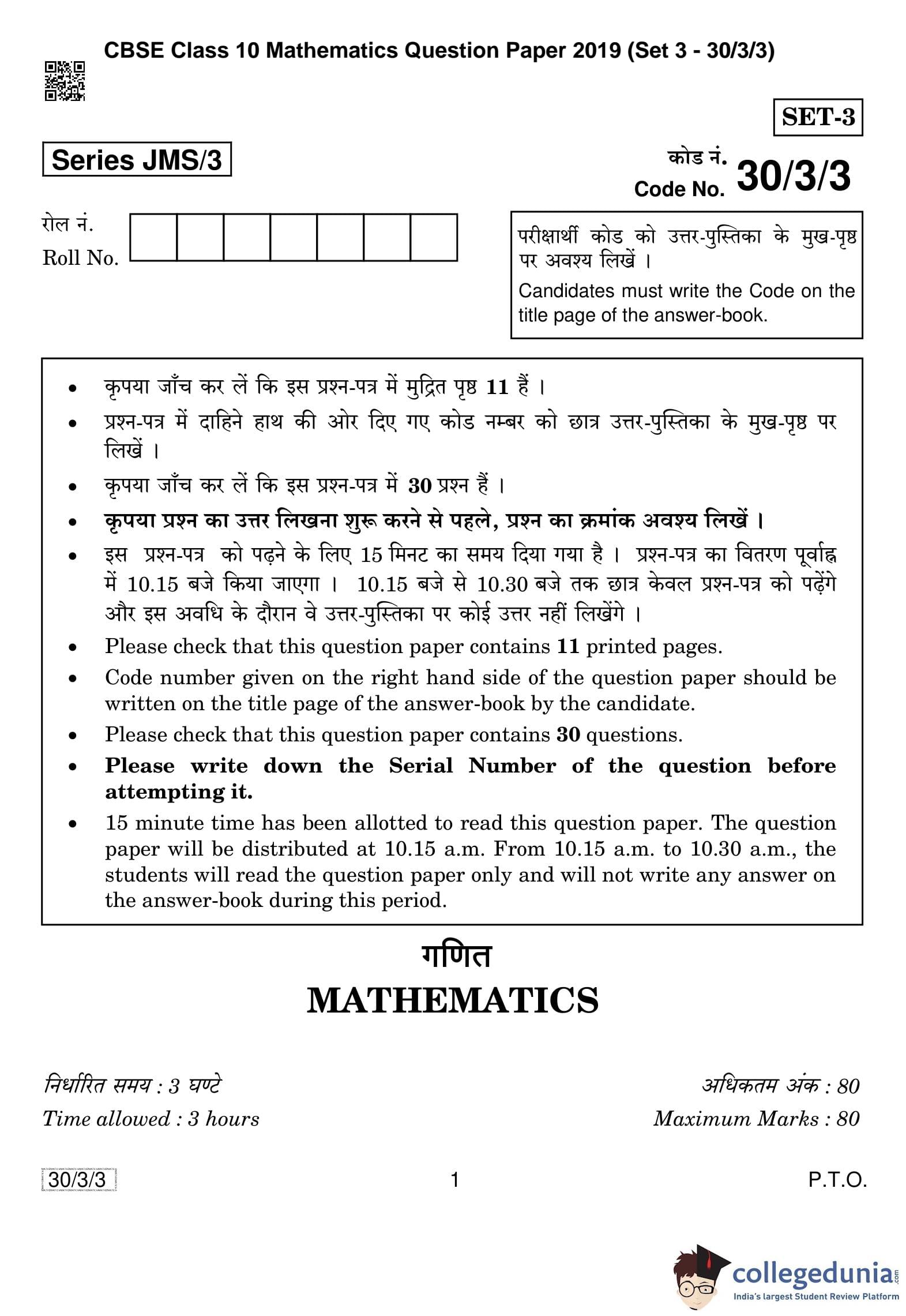 CBSE Class 10 Mathematics Question Paper 2019 with Answer Key Set 3 - 30/3/3 is available for download. The exam was conducted by the Central Board of Secondary Education on March 7, 2019 in the Morning Session 10:30 AM to 1:30 PM. The medium of paper was English and Hindi. The question paper comprised a total of 30 questions divided among 4 sections.
