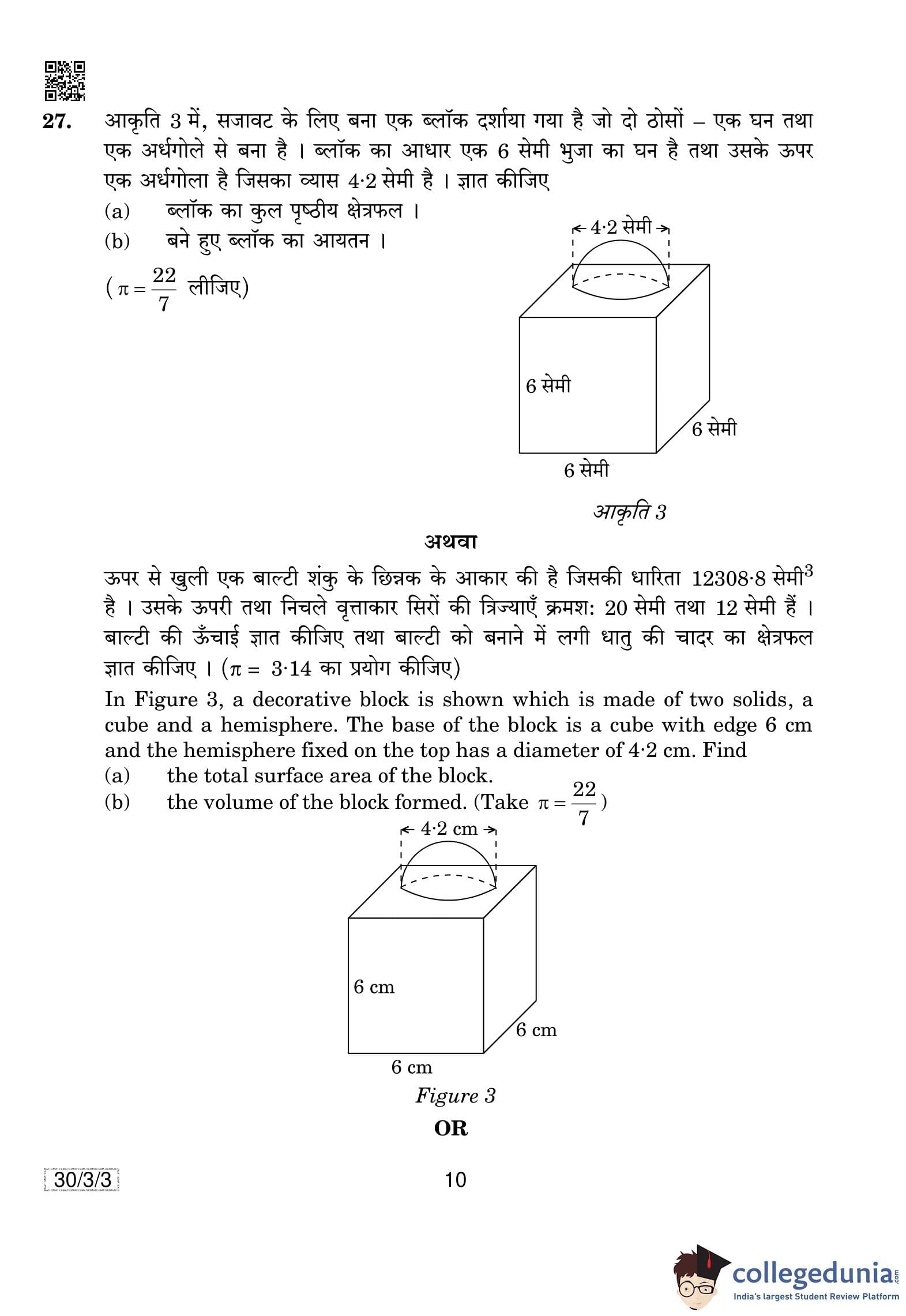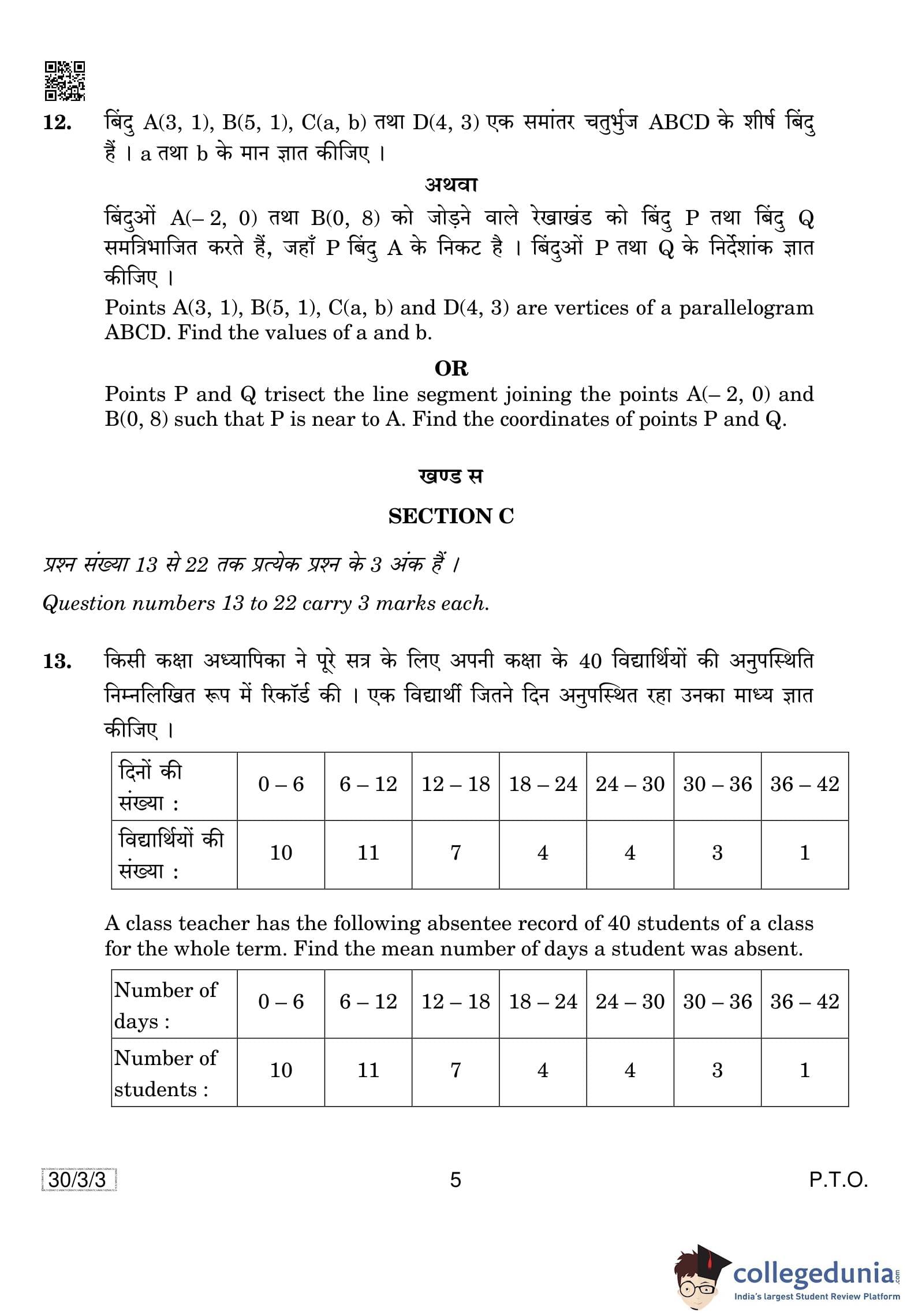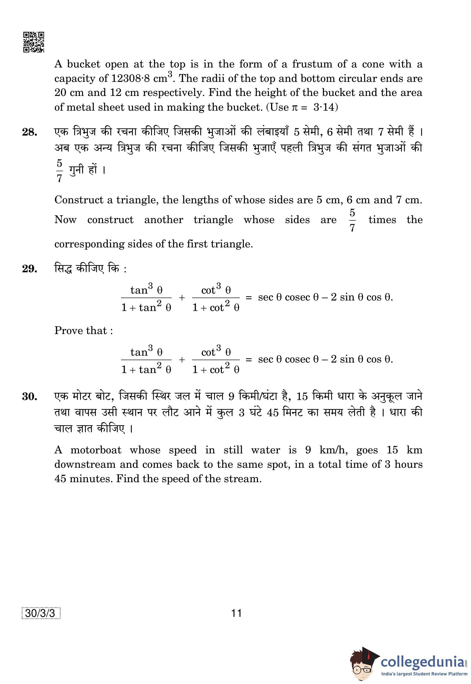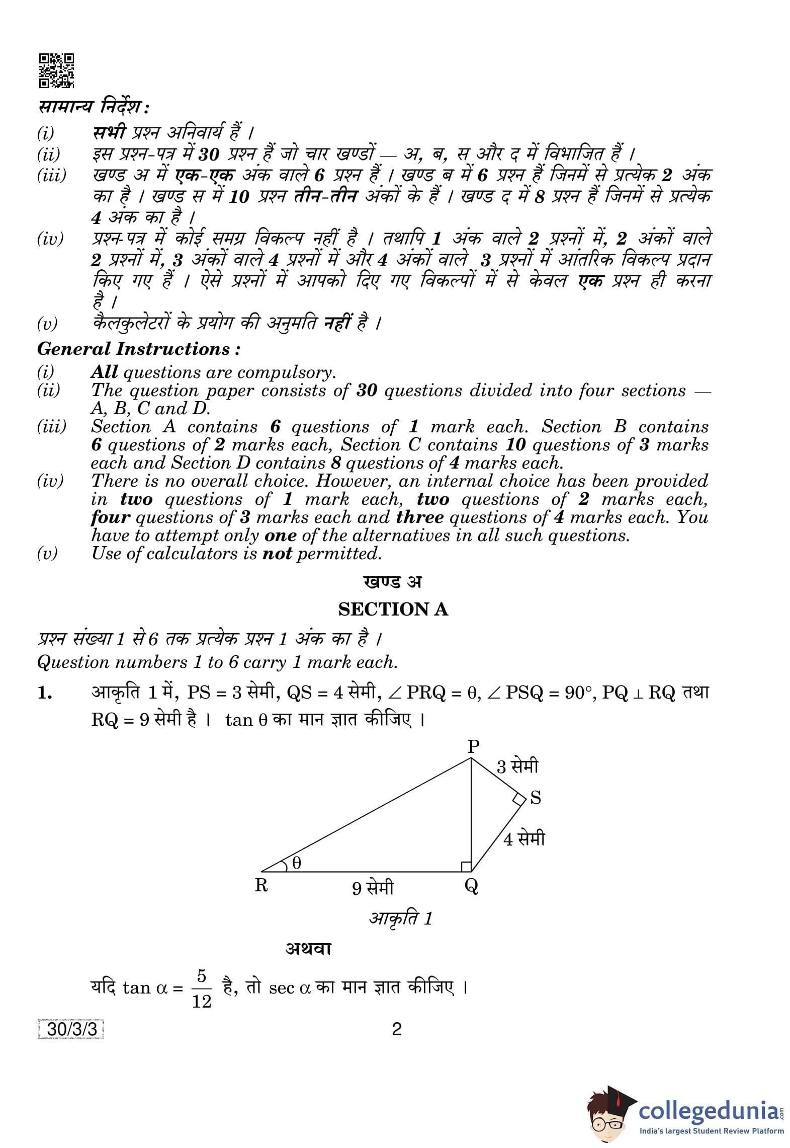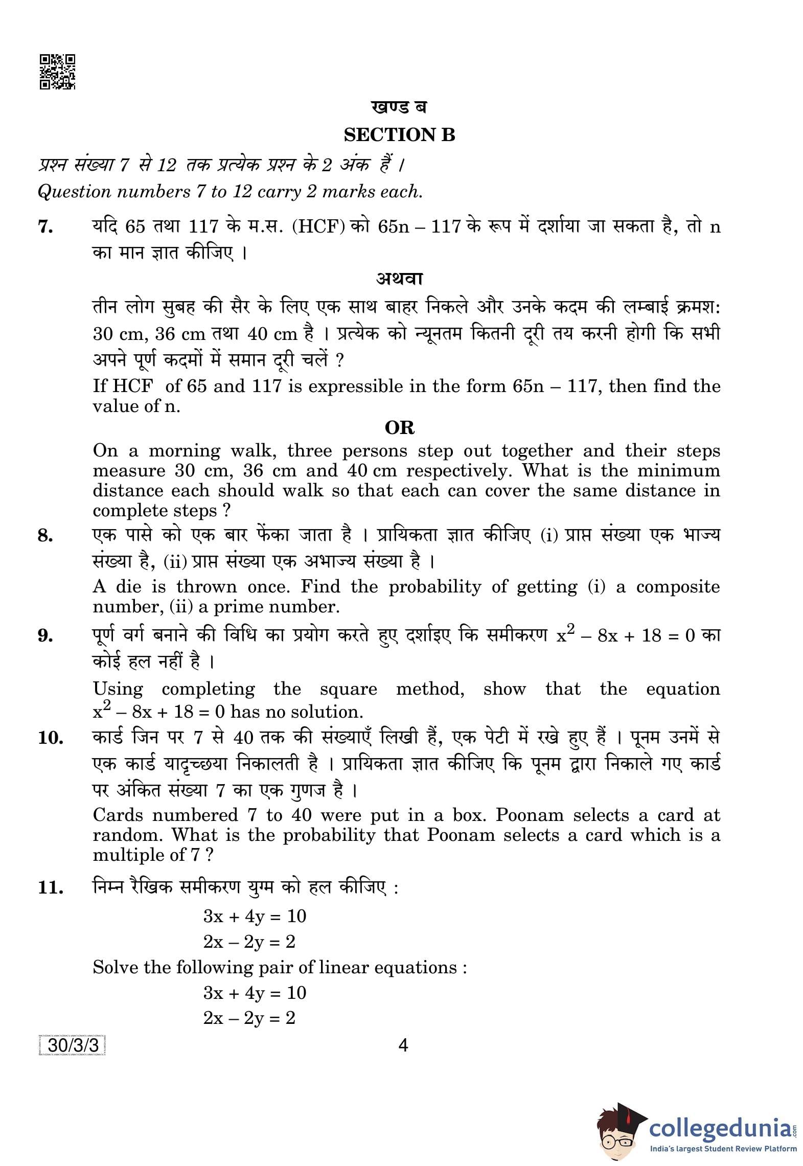 CBSE Class 10 Mathematics Question Paper 2019 with Answer Key Set 3 - 30/3/3 is available for download. The exam was conducted by the Central Board of Secondary Education on March 7, 2019 in the Morning Session 10:30 AM to 1:30 PM. The medium of paper was English and Hindi. The question paper comprised a total of 30 questions divided among 4 sections.