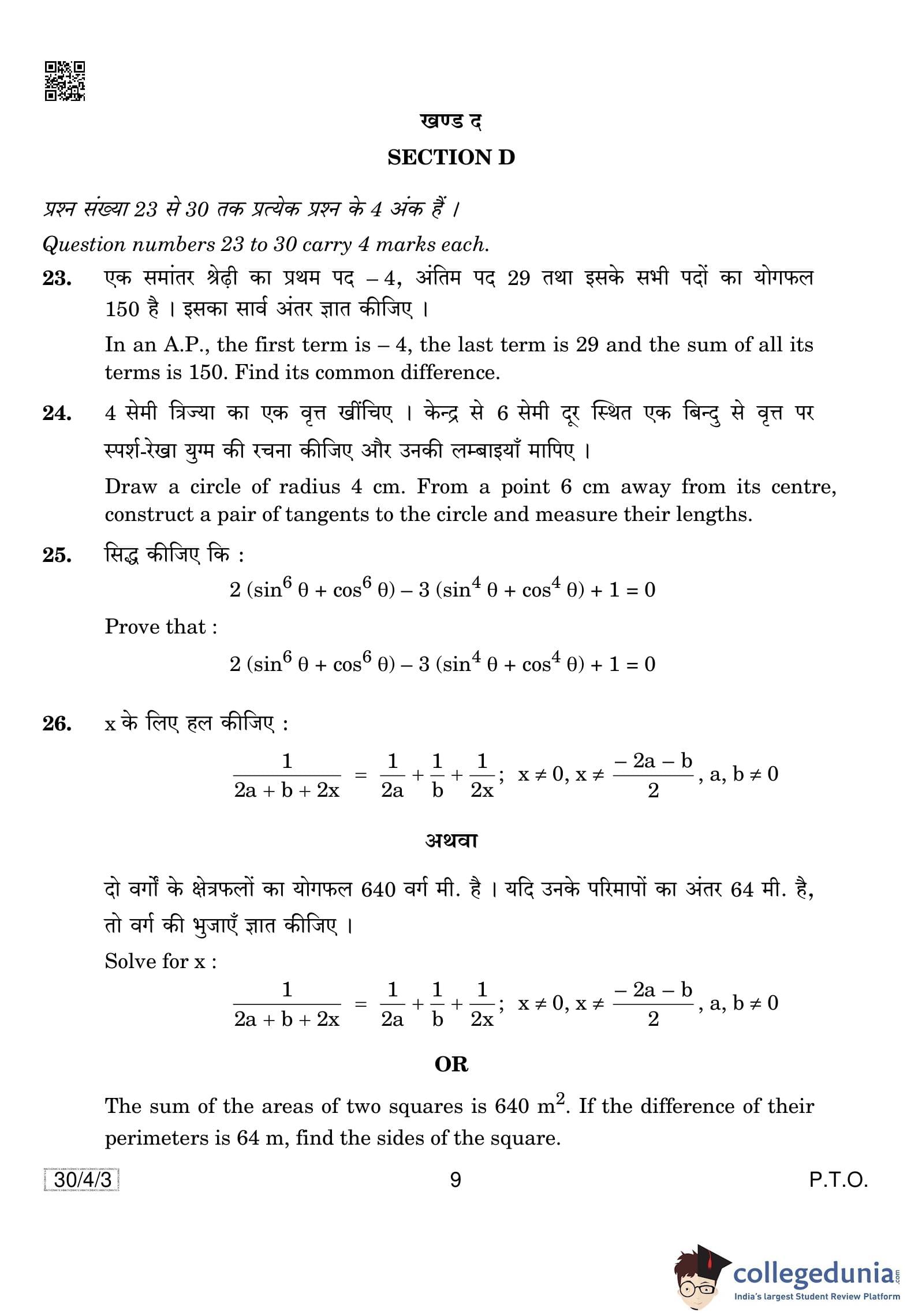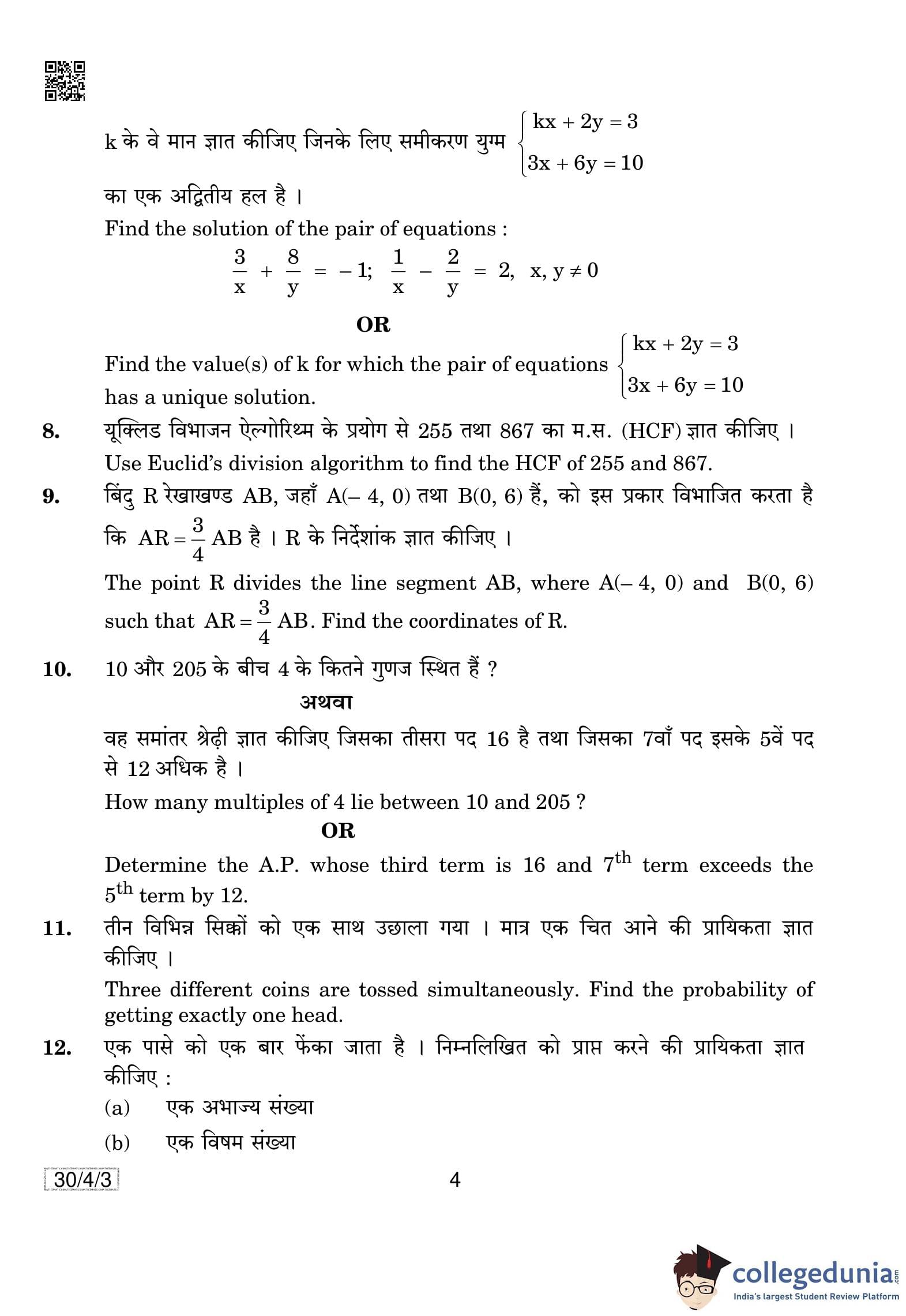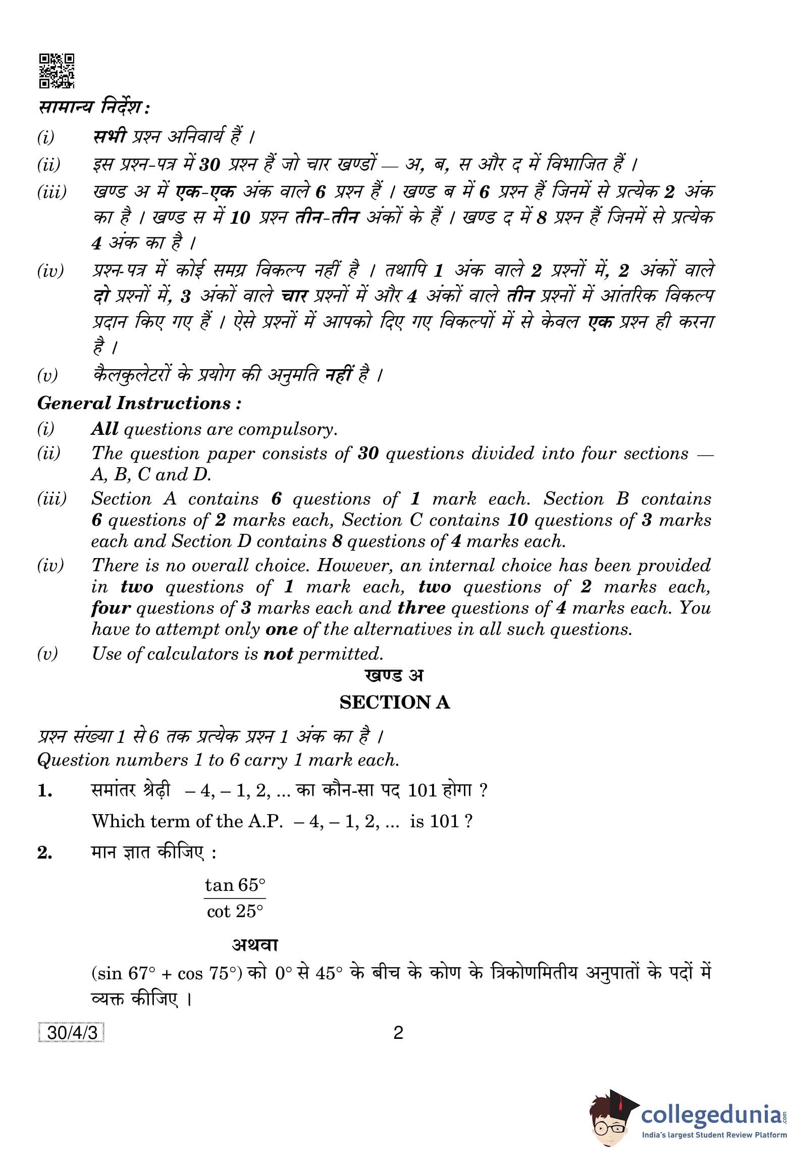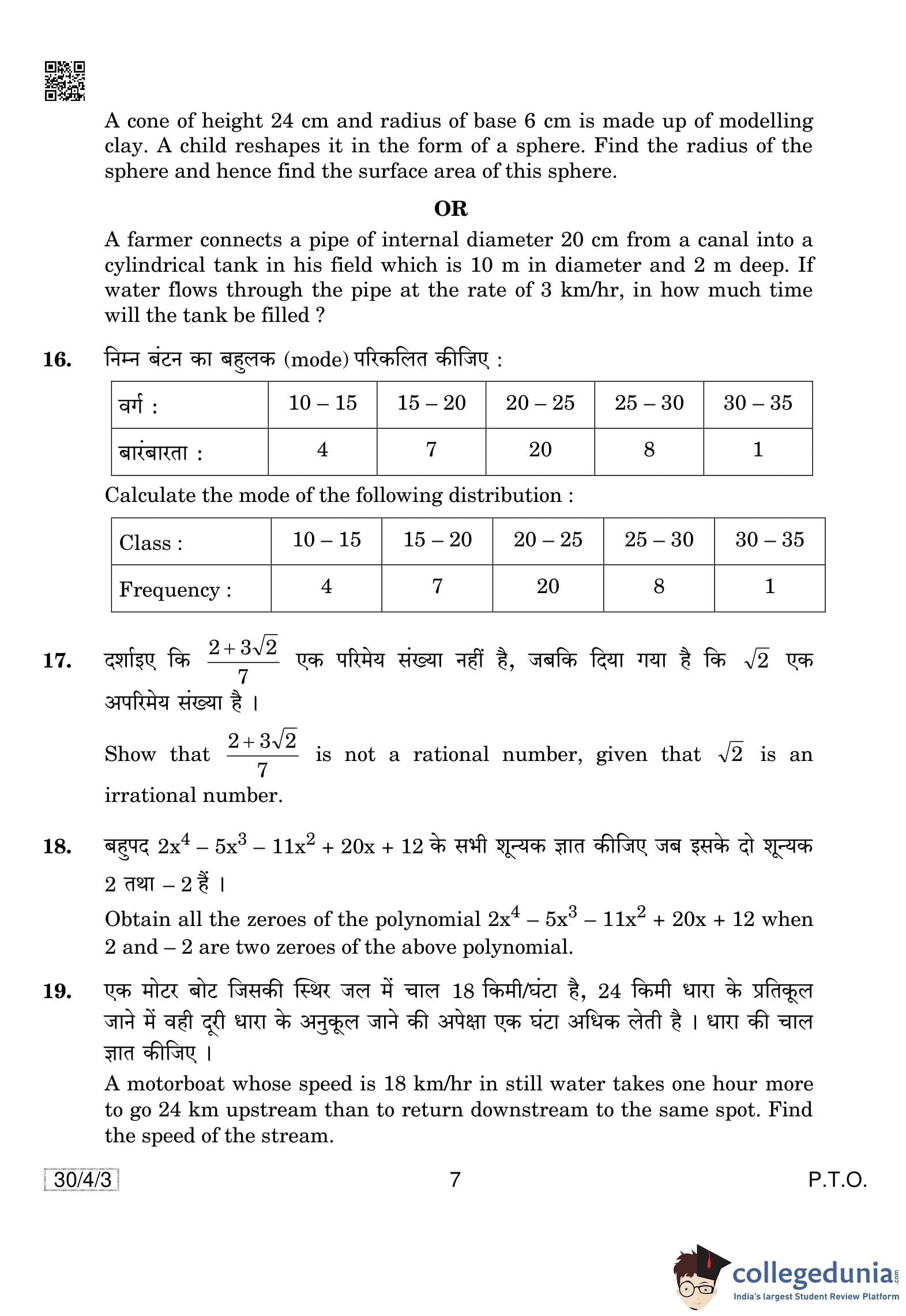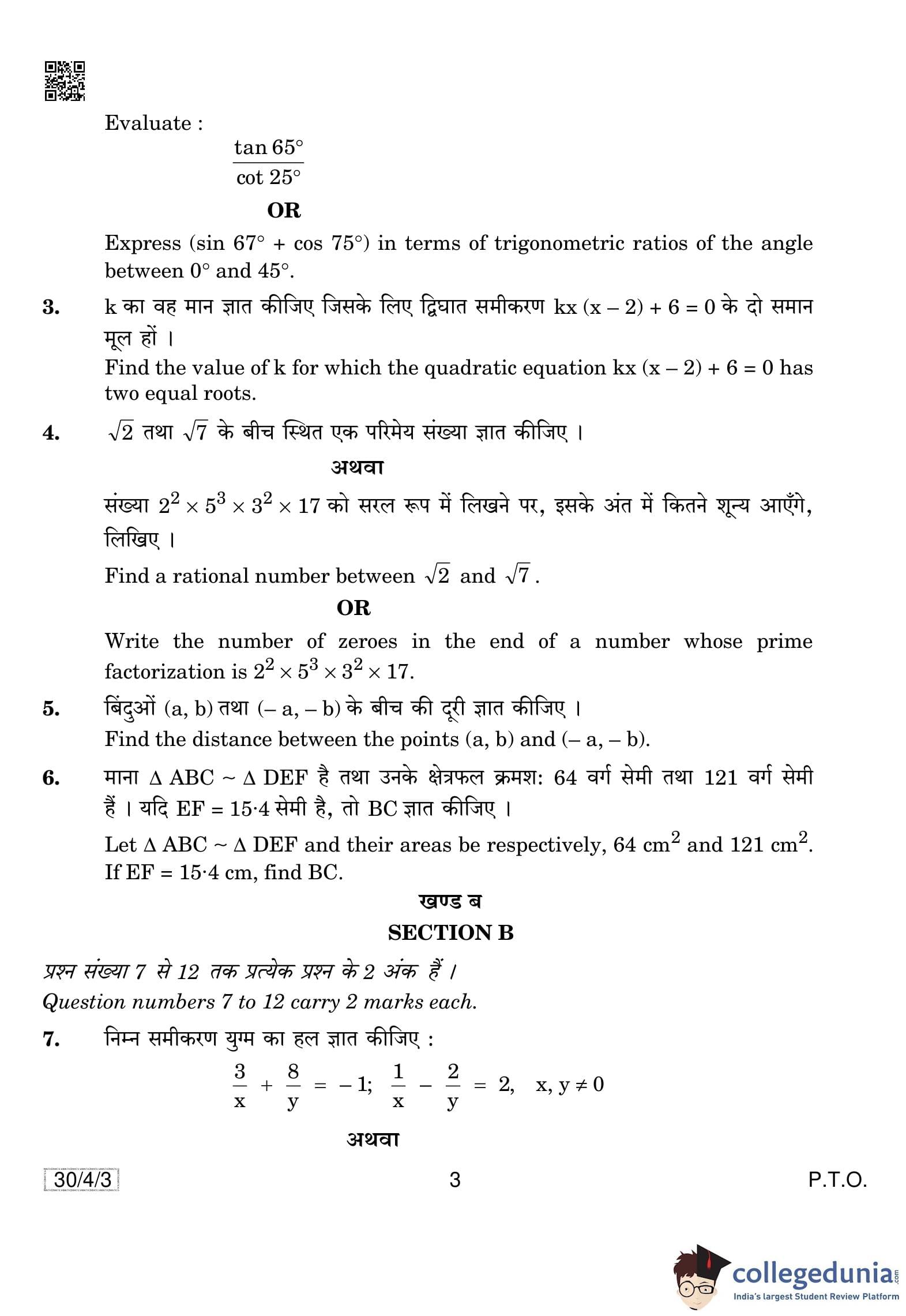 CBSE Class 10 Mathematics Question Paper 2019 with Answer Key Set 3 - 30/4/3 is available for download. The exam was conducted by the Central Board of Secondary Education on March 7, 2019 in the Morning Session 10:30 AM to 1:30 PM. The medium of paper was English and Hindi. The question paper comprised a total of 30 questions divided among 4 sections.