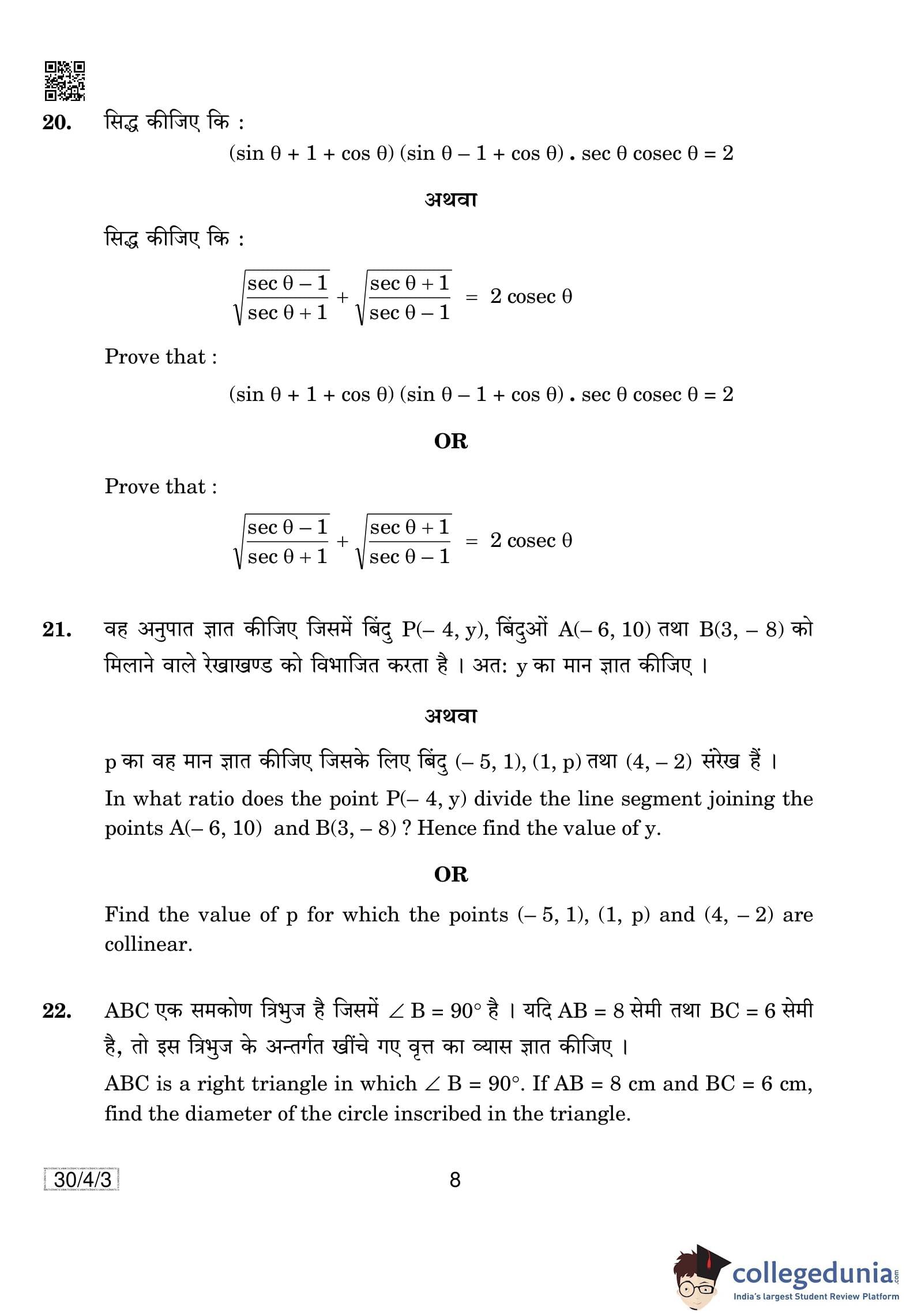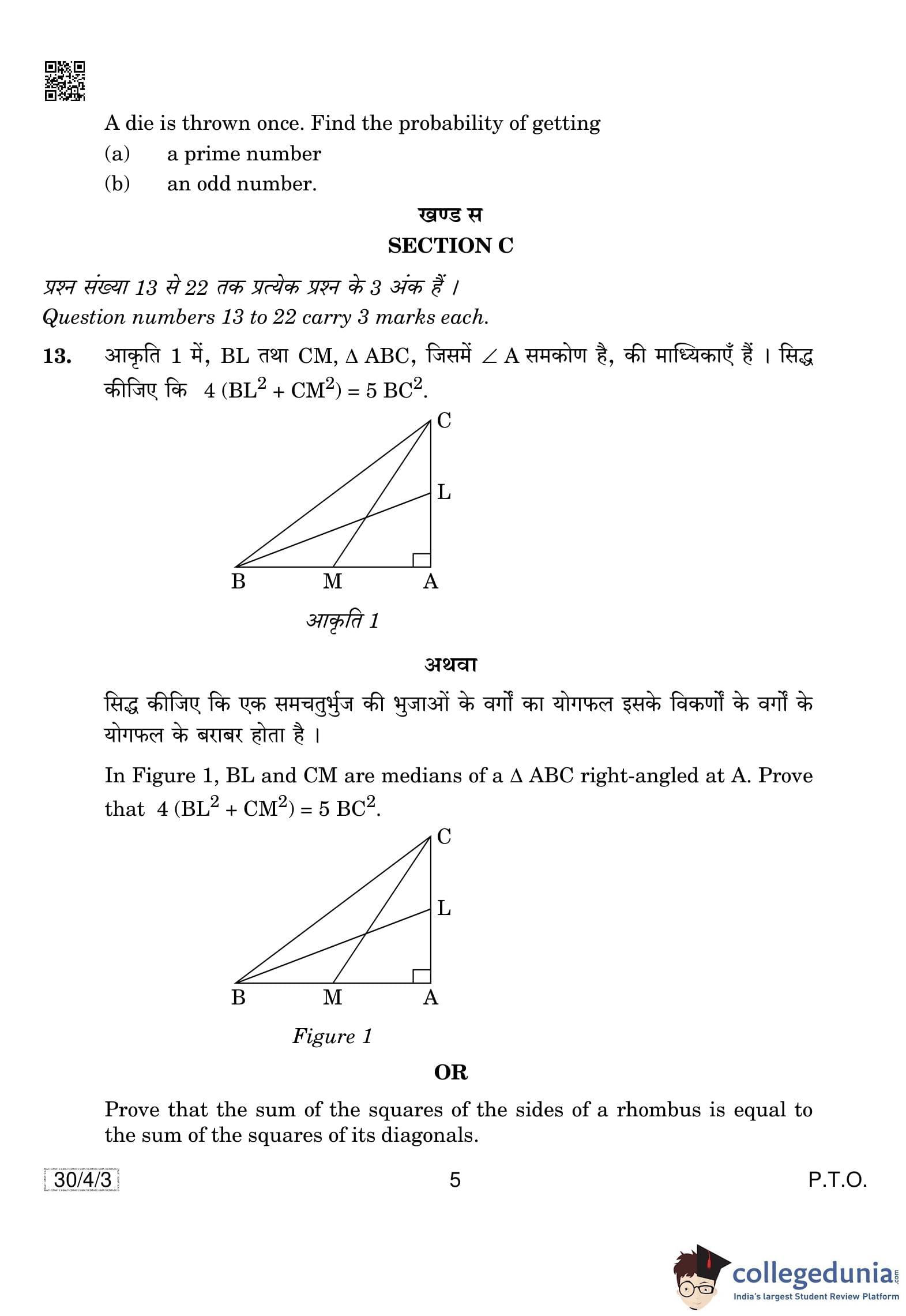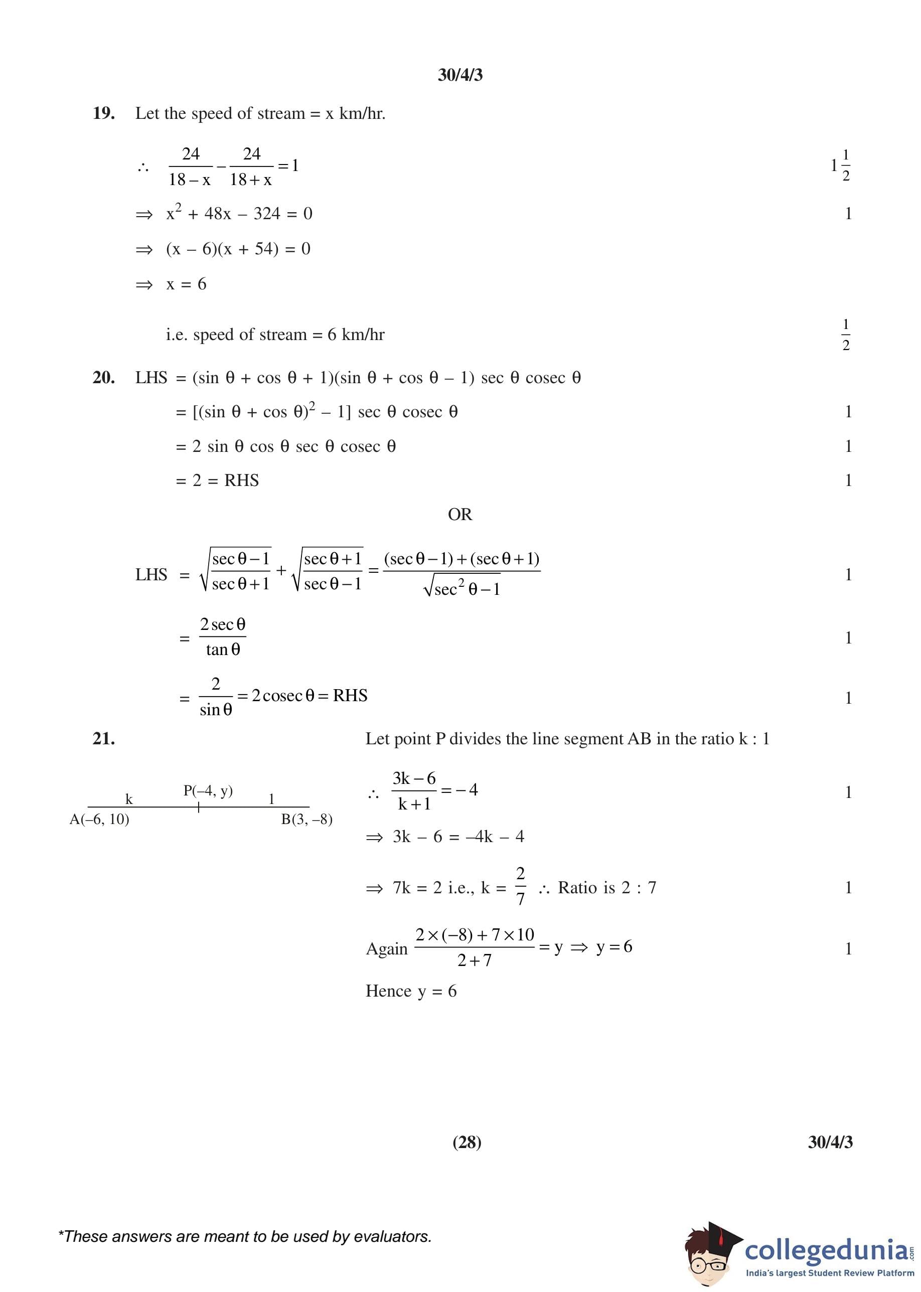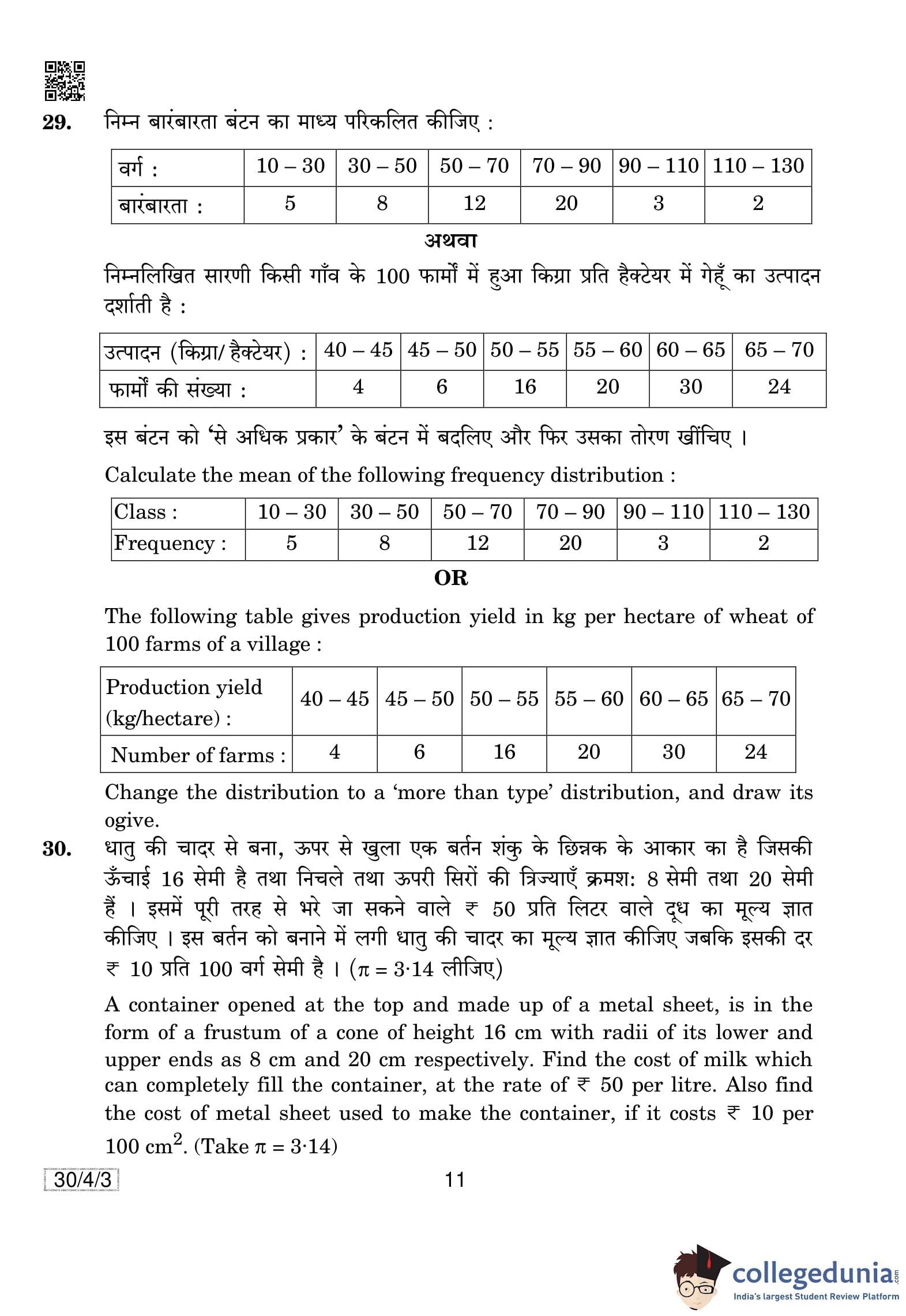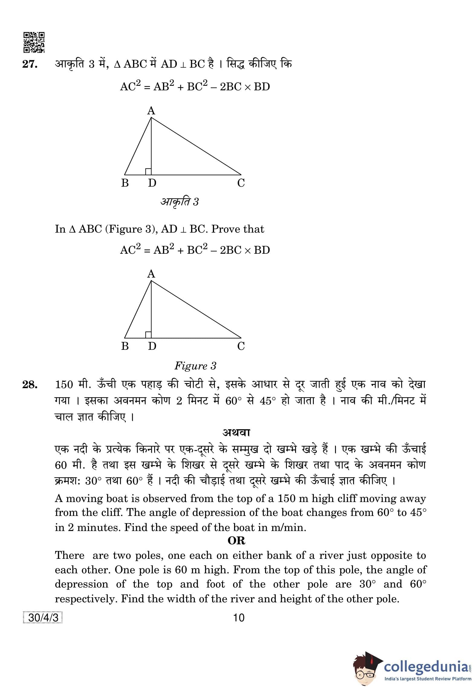 CBSE Class 10 Mathematics Question Paper 2019 with Answer Key Set 3 - 30/4/3 is available for download. The exam was conducted by the Central Board of Secondary Education on March 7, 2019 in the Morning Session 10:30 AM to 1:30 PM. The medium of paper was English and Hindi. The question paper comprised a total of 30 questions divided among 4 sections.