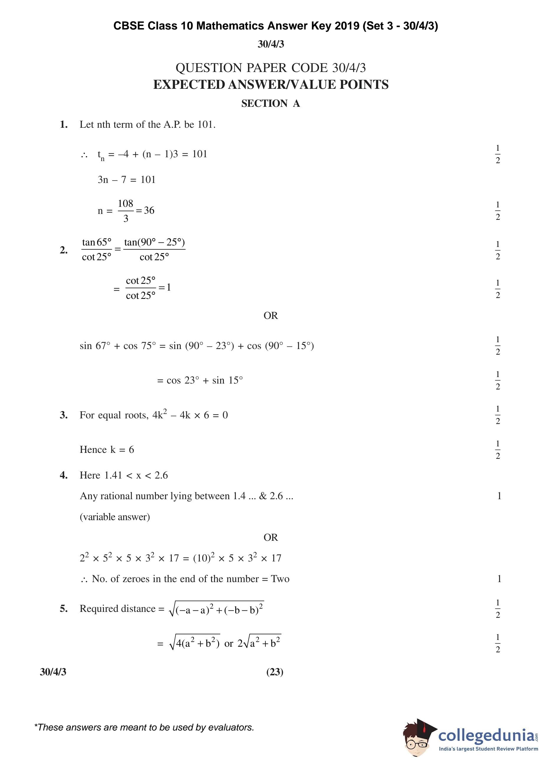 | CBSE Class 10 Mathematics Question Paper 2019 PDF | CBSE Class 10 Mathematics Answer Key 2019 PDF | Detailed Solutions |