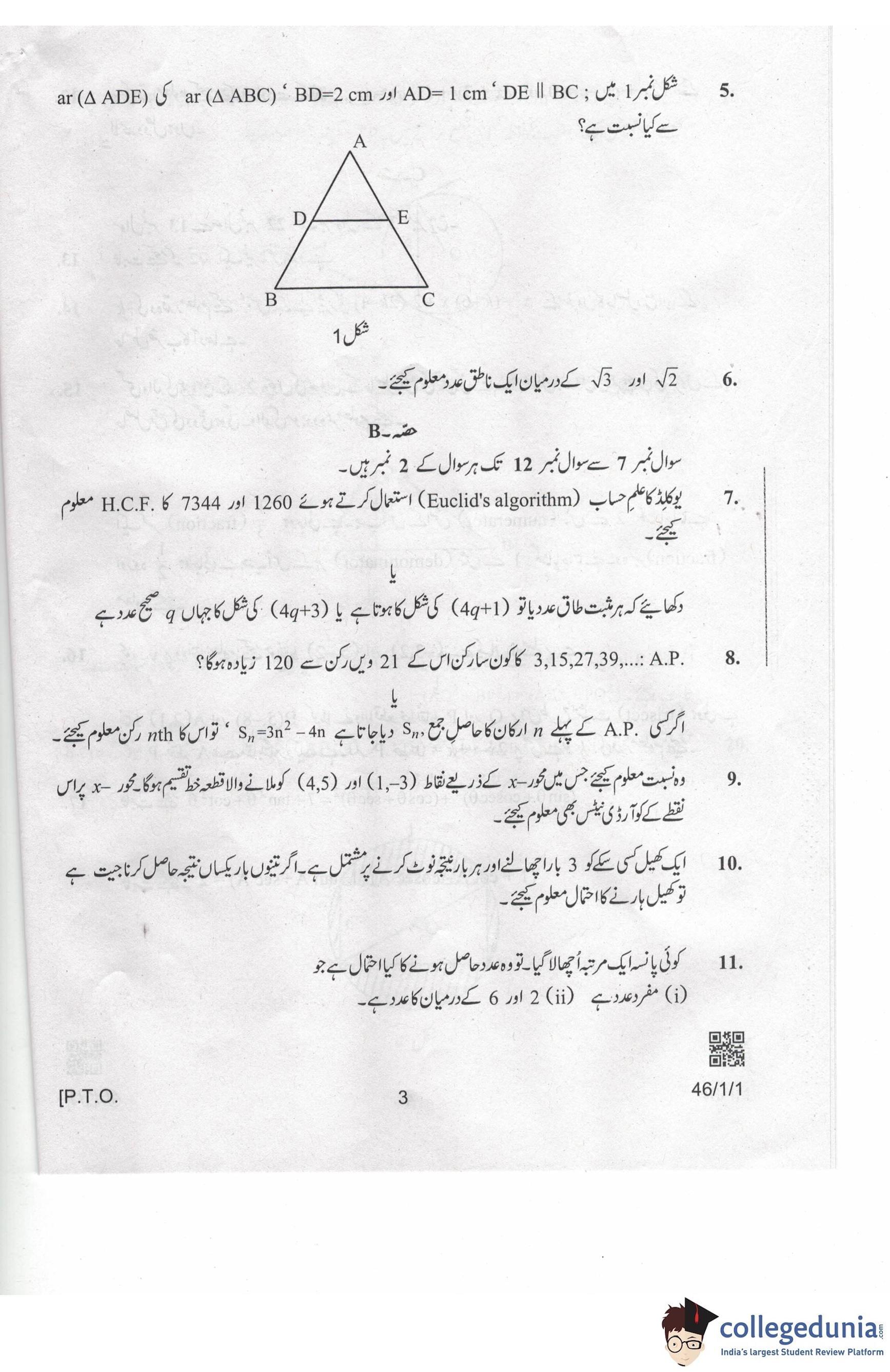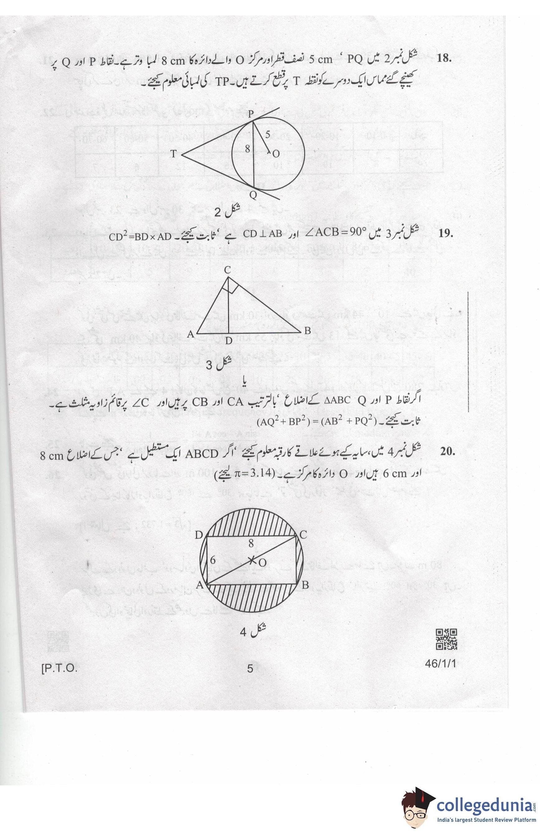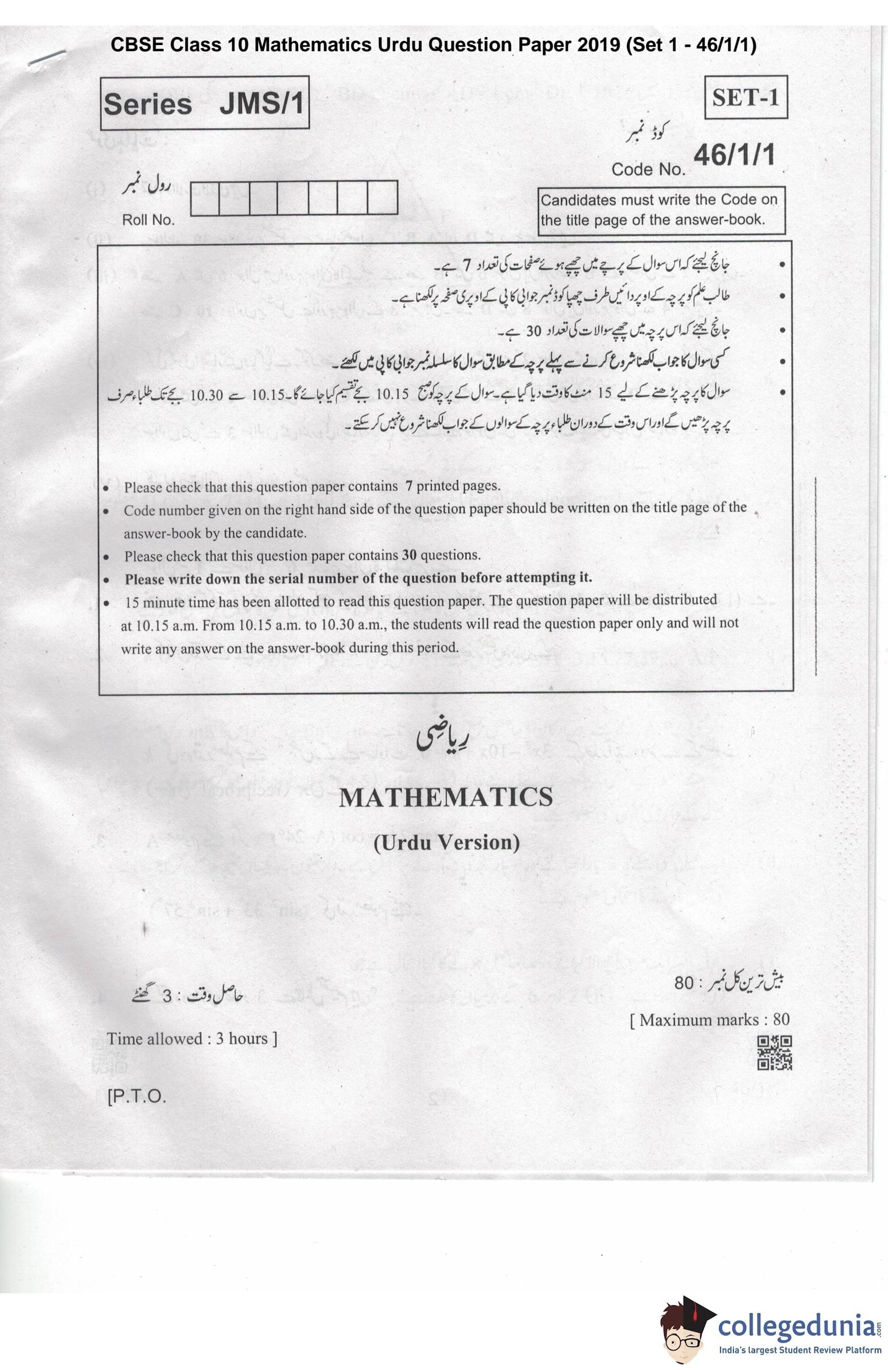 CBSE Class 10 Mathematics Urdu Question Paper 2019 with Answer Key Set 1 - 46/1/1 is available for download. The exam was conducted by the Central Board of Secondary Education on March 7, 2019 in the Morning Session 10:30 AM to 1:30 PM. The medium of paper was Urdu. The question paper comprised a total of 30 questions divided among 4 sections.