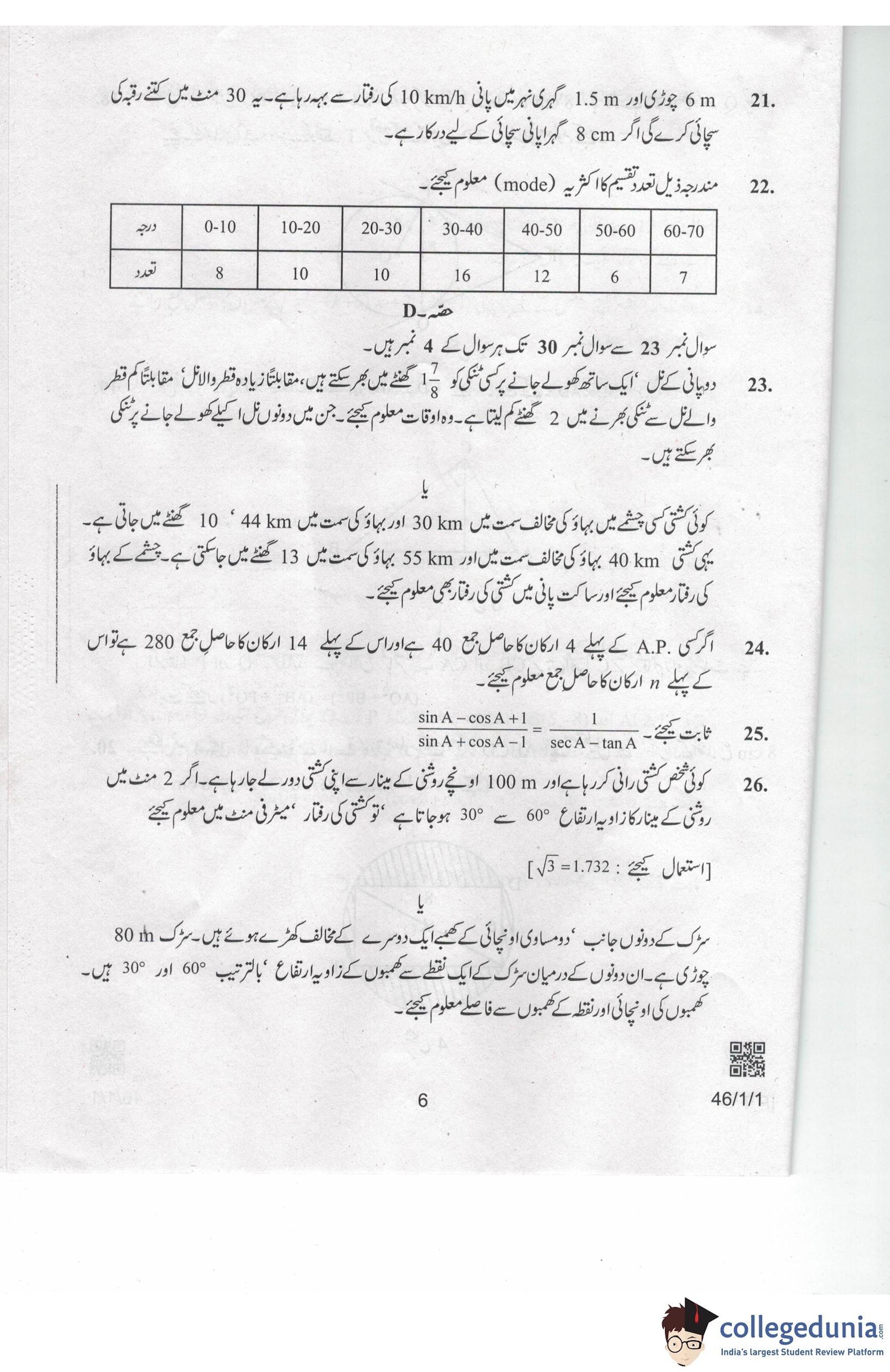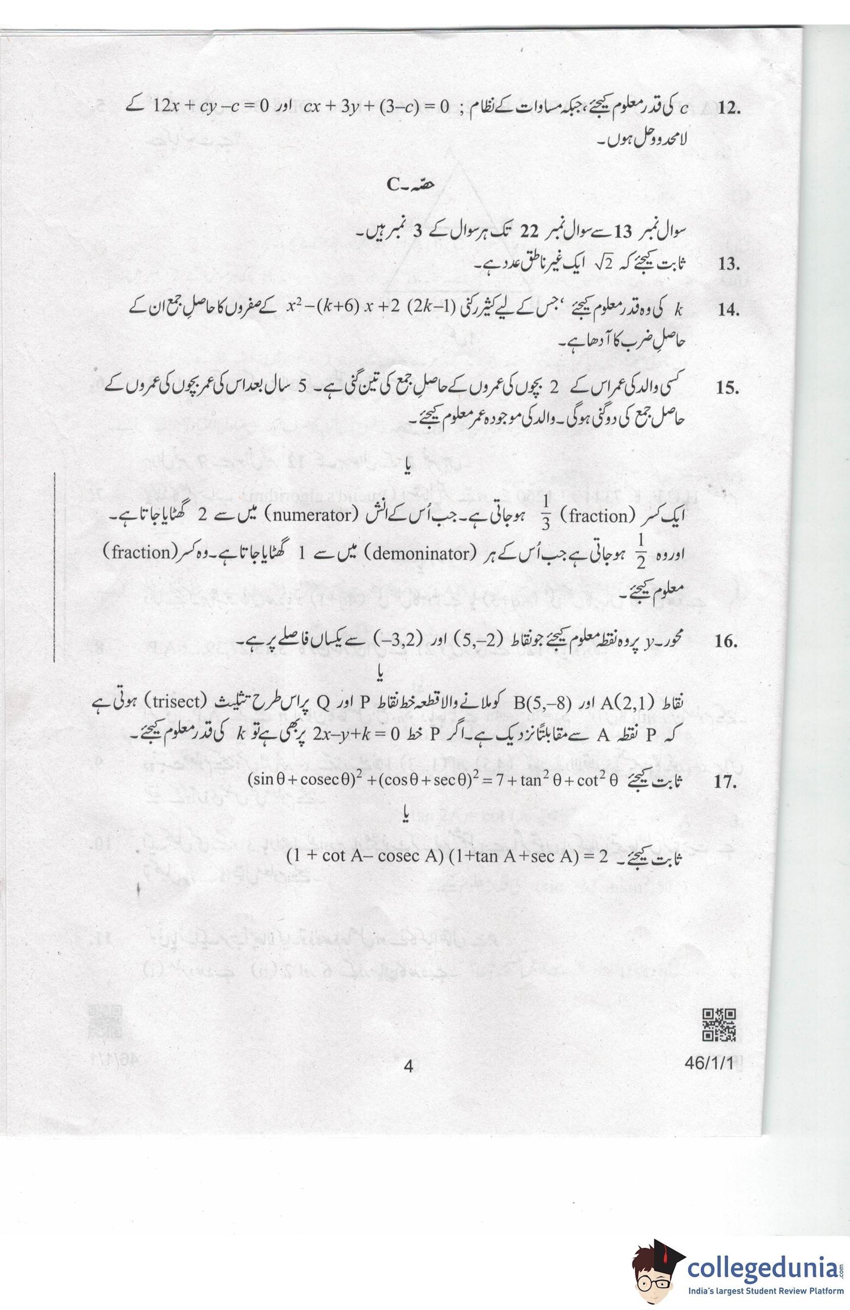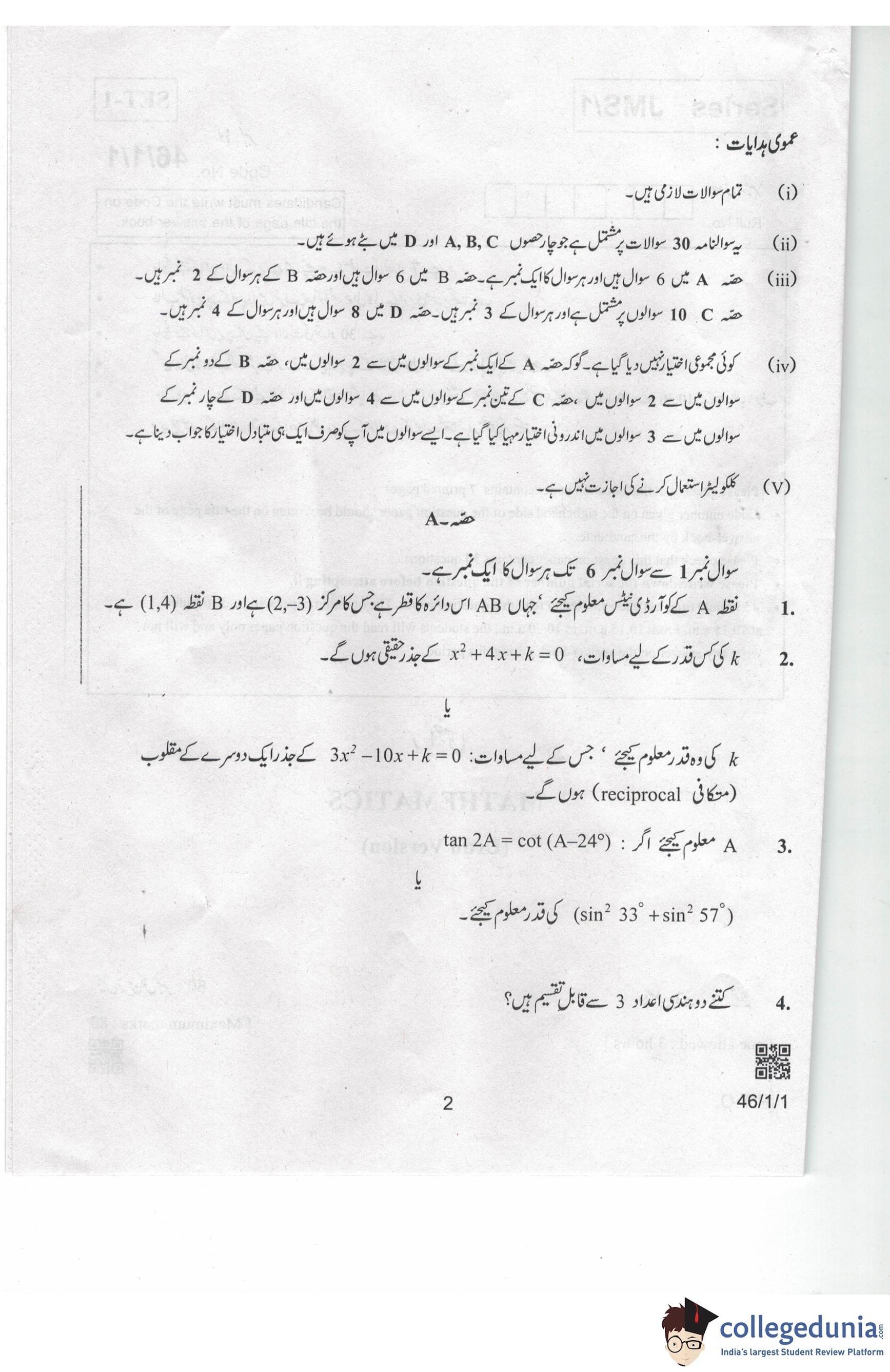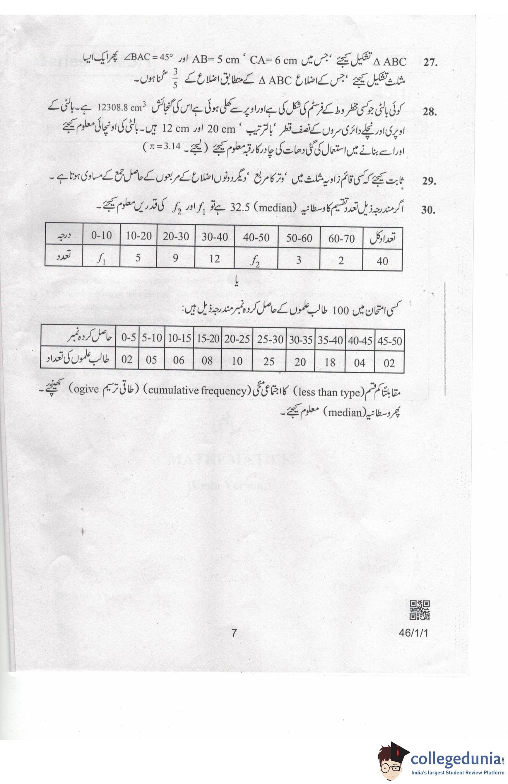CBSE Class 10 Mathematics Urdu Question Paper 2019 with Answer Key Set 1 - 46/1/1 is available for download. The exam was conducted by the Central Board of Secondary Education on March 7, 2019 in the Morning Session 10:30 AM to 1:30 PM. The medium of paper was Urdu. The question paper comprised a total of 30 questions divided among 4 sections.